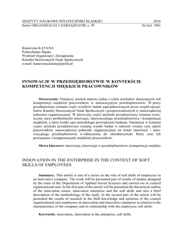 ZESZYTY NAUKOWE POLITECHNIKI ŚLĄSKIEJ Seria: ORGANIZACJA I ZARZĄDZANIE z. 95 2016 Nr kol. 1961 Katarzyna KATANA Politechnika Śląska Wydział Organizacji i Zarządzania Katedra Stosowanych Nauk Społecznych e-mail: [email protected] INNOWACJE W PRZEDSIĘBIORSTWIE W KONTEKŚCIE KOMPETENCJI MIĘKKICH PRACOWNIKÓW Streszczenie. Niniejszy artykuł stanowi jeden z cyklu artykułów dotyczących roli kompetencji miękkich pracowników w innowacyjnym przedsiębiorstwie. W pracy przedstawiona zostanie część wyników badań zaprojektowanych przez zespół specjalistów Katedry Stosowanych Nauk Społecznych i przeprowadzonych w samorządowej jednostce organizacyjnej. W pierwszej części artykułu przedstawiony zostanie teoretyczny zarys problematyki innowacji, innowacyjnego przedsiębiorstwa i kompetencji miękkich, a także krótki opis metodologii prowadzenia badania. Natomiast w kolejnej części artykułu przedstawione zostaną wyniki badań w zakresie wiedzy oraz opinii pracowników samorządowej jednostki organizacyjnej na temat innowacji i innowacyjnego przedsiębiorstwa w odniesieniu do charakterystyki firmy oraz ich powiązania z kompetencjami miękkimi pracowników. Słowa kluczowe: innowacje, innowacje w przedsiębiorstwie, kompetencje miękkie INNOVATION IN THE ENTERPRISE IN THE CONTEXT OF SOFT SKILLS OF EMPLOYEES Summary. This article is one of a series on the role of soft skills of employees in an innovative company. The work will be presented part of results of studies designed by the team of the Department of Applied Social Sciences and carried out in council organizational unit. In the first part of the article will be presented the theoretical outline of the innovation issues, innovation enterprise and the soft skills and also a brief description of the methodology of the study. In the second part of the article will be presented the results of research in the field knowledge and opinions of the council organizational unit employees on innovation and innovative enterprise in relation to the characteristics of the company and its relationship with the employees soft skills. Keywords: innovation, innovation in the enterprise, soft skills K. Katana 160 1. Wprowadzenie Aktualna sytuacja gospodarcza wymusza na przedsiębiorcach ciągły rozwój i wprowadzanie innowacji. Innowacyjne przedsiębiorstwo to takie, które tworzy nowe usługi i/lub produkty, odznacza się umiejętnością nieustannego dostosowywania się do przemian zachodzących w jego środowisku. W tworzeniu innowacji w firmie mogą być pomocne tzw. kompetencje miękkie (interpersonalne) pracowników, które dotyczą umiejętności społecznych oraz atrybutów psychofizycznych. Celem badań przedstawionych w niniejszym opracowaniu było poznanie opinii pracowników samorządowej jednostki organizacyjnej na temat innowacji i innowacyjnego przedsiębiorstwa w odniesieniu do charakterystyki firmy oraz ich powiązania z kompetencjami miękkimi pracowników. 2. Zdefiniowanie kluczowych pojęć Obecnie innowacje są jednym z kluczowych czynników, które mają duży wpływ na zdobycie oraz utrzymanie przewagi konkurencyjnej przedsiębiorstwa na rynku. Samo pojęcie innowacji w literaturze przedmiotu jest definiowane w różny sposób i aktualnie zagadnienie to jest bardzo szeroko omawiane przez naukowców z różnych dziedzin nauki. Do nauk ekonomicznych pojęcie innowacji wprowadził wybitny ekonomista J. Schumpeter w 1911 roku. Jego zdaniem pojęcie innowacji jest szerokim zagadnieniem, które obejmuje kombinację pięciu różnych elementów, a mianowicie: 1 wprowadzenie nowego produktu, z jakim konsumenci nie mieli jeszcze do czynienia, bądź też nadanie nowych cech danemu produktowi; wprowadzenie nowej metody produkcji, która jest jeszcze nie wykorzystywana w danej dziedzinie przemysłu; otwarcie nowego rynku, na którym dany rodzaj przemysłu krajowego wcześniej nie działał, i to bez znaczenia, czy rynek istniał już wcześniej czy nie; zdobycie nowego źródła surowców bądź półfabrykatów niezależnie, czy źródło to już wcześniej istniało, czy też musi zostać dopiero wytworzone; wprowadzenie nowej struktury organizacji danego przemysłu, np. stworzenie lub złamanie monopolu1. Schumpeter J.: Teoria rozwoju gospodarczego. PWN, Warszawa 1960, s. 104. Innowacje w przedsiębiorstwie… 161 L. Białoń uważa, iż innowacje należy rozpatrywać pod wieloma kątami i definiuje innowacje jako: „wprowadzanie zmian do układów gospodarczych i społecznych, których efektem jest wzrost użyteczności produktów/usług, procesów technologicznych oraz systemów zarządzania, poprawa racjonalności gospodarowania, ochrona i poprawa środowiska przyrodniczego, lepsza komunikacja międzyludzka oraz ostatecznie poprawa jakości życia zawodowego, jak i prywatnego społeczeństwa”2. R. Nowacki i M. Staniewski zwracają uwagę na fakt, że aby innowacja była skuteczna powinna doprowadzać do znaczącej zmiany. Jednakże zmiana ta nie musi wprowadzać czegoś nowego, czasem może przybrać formę znaczących ulepszeń wyrobu, procesu lub usługi w stosunku do dotychczasowych osiągnięć3. Pojęcie innowacyjności przez większość badaczy oraz praktyków utożsamiane jest z pojęciem innowacji, ponieważ są one ściśle są ze sobą powiązane4. Innowacyjność traktowana jest bardzo często jako pewien atrybut przedsiębiorstwa, jako zdolność do wprowadzenia innowacji. To zdolność do tworzenia czegoś nowego bądź wprowadzenie znaczących zmian5. Obecnie innowacyjność uznawana jest za jedną z najważniejszych cech przedsiębiorstwa. Przyczynia się ona do utrzymania przez dłuższy okres czasu rentowności oraz efektywności przedsiębiorstwa, które działa w konkurencyjnym otoczeniu6. Innowacyjność przedsiębiorstwa to zdolność do stałego poszukiwania, wdrażania i upowszechniania innowacji, a zatem stanowi główną siłę kreatywną każdego przedsiębiorstwa, która wpisana jest w 