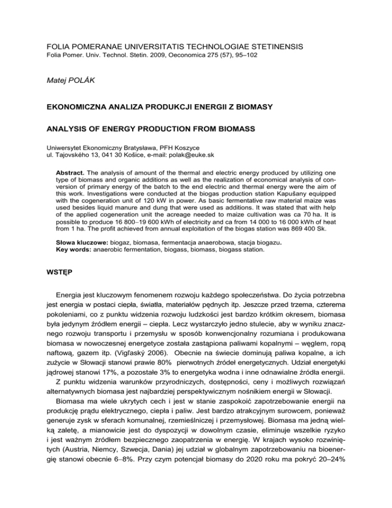 FOLIA POMERANAE UNIVERSITATIS TECHNOLOGIAE STETINENSIS Folia Pomer. Univ. Technol. Stetin. 2009, Oeconomica 275 (57), 95–102 Matej POLÁK EKONOMICZNA ANALIZA PRODUKCJI ENERGII Z BIOMASY ANALYSIS OF ENERGY PRODUCTION FROM BIOMASS Uniwersytet Ekonomiczny Bratysława, PFH Koszyce ul. Tajovského 13, 041 30 Košice, e-mail: [email protected] Abstract. The analysis of amount of the thermal and electric energy produced by utilizing one type of biomass and organic additions as well as the realization of economical analysis of conversion of primary energy of the batch to the end electric and thermal energy were the aim of this work. Investigations were conducted at the biogas production station Kapušany equipped with the cogeneration unit of 120 kW in power. As basic fermentative raw material maize was used besides liquid manure and dung that were used as additions. It was stated that with help of the applied cogeneration unit the acreage needed to maize cultivation was ca 70 ha. It is possible to produce 16 800−19 600 kWh of electricity and ca from 14 000 to 16 000 kWh of heat from 1 ha. The profit achieved from annual exploitation of the biogas station was 869 400 Sk. Słowa kluczowe: biogaz, biomasa, fermentacja anaerobowa, stacja biogazu. Key words: anaerobic fermentation, biogass, biomass, biogass station. WSTĘP Energia jest kluczowym fenomenem rozwoju kaŜdego społeczeństwa. Do Ŝycia potrzebna jest energia w postaci ciepła, światła, materiałów pędnych itp. Jeszcze przed trzema, czterema pokoleniami, co z punktu widzenia rozwoju ludzkości jest bardzo krótkim okresem, biomasa była jedynym źródłem energii – ciepła. Lecz wystarczyło jedno stulecie, aby w wyniku znacznego rozwoju transportu i przemysłu w sposób konwencjonalny rozumiana i produkowana biomasa w nowoczesnej energetyce została zastąpiona paliwami kopalnymi – węglem, ropą naftową, gazem itp. (Vigľaský 2006). Obecnie na świecie dominują paliwa kopalne, a ich zuŜycie w Słowacji stanowi prawie 80% pierwotnych źródeł energetycznych. Udział energetyki jądrowej stanowi 17%, a pozostałe 3% to energetyka wodna i inne odnawialne źródła energii. Z punktu widzenia warunków przyrodniczych, dostępności, ceny i moŜliwych rozwiązań alternatywnych biomasa jest najbardziej perspektywicznym nośnikiem energii w Słowacji. Biomasa ma wiele ukrytych cech i jest w stanie zaspokoić zapotrzebowanie energii na produkcję prądu elektrycznego, ciepła i paliw. Jest bardzo atrakcyjnym surowcem, poniewaŜ generuje zysk w sferach komunalnej, rzemieślniczej i przemysłowej. Biomasa ma jedną wielką zaletę, a mianowicie jest do dyspozycji w dowolnym czasie, eliminuje wszelkie ryzyko i jest waŜnym Ŝródłem bezpiecznego zaopatrzenia w energię. W krajach wysoko rozwiniętych (Austria, Niemcy, Szwecja, Dania) jej udział w globalnym zapotrzebowaniu na bioenergię stanowi obecnie 6−8%. Przy czym potencjał biomasy do 2020 roku ma pokryć 20–24% 96 M. Polák obecnego zapotrzebowania energii potrzebnej na produkcję prądu elektrycznego i energii cieplnej. Obecnie energia z biomasy stanowi zaledwie 4% energii całkowitej zuŜywanej przez Słowację. Według szacunków bioenergetyczny potencjał Słowacji wynosi 20–30%. Biomasa w Słowacji i w UE moŜe zastąpić znaczną (20–40%) część paliw kopalnych. Biomasa jest podstawą zamkniętego obiegu CO2 w przyrodzie. W procesie spalania uwaŜana jest za paliwo neutralne. Wprawdzie podczas spalania wydzielany jest CO2, ale w ilości w przybliŜeniu równej zapotrzebowaniu podczas jej wegetacji w procesie asymilacji. Biomasa wraz z innymi źródłami energii odnawialnej (oprócz tego, Ŝe umoŜliwia zwiększenie efektywności energetycznej, co jest konieczne z punktu widzenia ochrony klimatu) umoŜliwia bezpieczne zasilanie w energię, niezaleŜnie od ropy naftowej, i przyczynia się do zmniejszania ubóstwa na świecie. Biogaz produkowany jest z masy organicznej poddanej fermentacji anaerobowej w zamkniętych zbiornikach. W tych warunkach masa organiczna (biomasa) ulega rozkładowi, w wyniku czego powstają substancja gnilna, metan (CH4) CO2, siarkowodór i inne gazy. W produkcji biogazu wykorzystuje się proces występujący w naturze. Masę organiczną poddaje się fermentacji w gazoszczelnym zbiorniku (fermentatorze), w temperaturze 38–40°C, w celu zapewnienia bioenergetycznej transformacji substancji organicznej, podczas której nie dochodzi do obniŜenia jej wartości opałowej (rys. 1). Pojemnik na gaz Kogenerator Energia elektryczna Zbiornik homogenizacyjny Użyteczna energia cieplna Gnojowica ◊ Fermentator – ogrzewanie Separacja Wykorzystanie w rolnictwie ◊ – mieszanie Frakcja stała Mieszadło Odpad pofermentacyjny Wykorzystanie w rolnictwie Frakcja płynna Rys. 1. Schemat technologiczny stacji biogazu w PD Kapušany Zastosowana w stacji biogazu technologia (dalej BPS) jest zbiorem procesów, w których mieszanina mikroorganizmów biologicznie rozkłada substancję organiczną bez dostępu powietrza. W większości przypadków w technologii tej wykorzystuje się dwa zbiorniki umieszczone obok siebie lub cylindryczne zbiorniki umieszczone jeden wewnątrz drugiego, przy czym zewnętrzny większy zbiornik słuŜy do zakończenia procesów anaerobowych a mniejszy zbiornik wewnętrzny, do intensywnej anaerobowej fermentacji. Materiał wejściowy do- Ekonomiczna analiza produkcji... 97 starczany jest do zbiornika fermentacyjnego przez specjalnie do tego celu przystosowany zasyp, który swoją konstrukcją zabezpiecza biogaz przed ewentualnym wypływem ze zbiornika. Na obwodzie zbiornika umieszczona jest węŜownica, której zadaniem jest utrzymanie właściwej temperatury niezbędnej do przebiegu fermentacji. W celu zapewnienia jednolitej temperatury i gęstości fermentowanej masy w zbiorniku, w zaleŜności od jego pojemności, umieszcza się 3–4 mieszadła. Podczas procesu fermentacyjnego z materiału wsadowego wydzielają się sucha