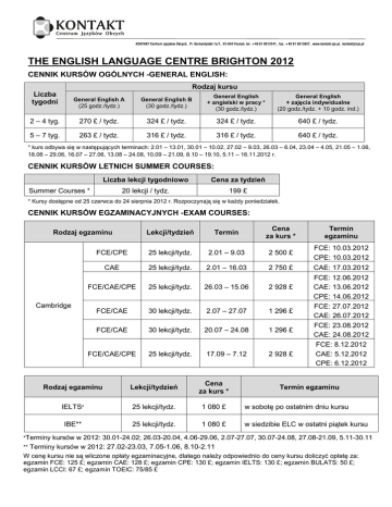 THE ENGLISH LANGUAGE CENTRE BRIGHTON 2012 CENNIK KURSÓW OGÓLNYCH -GENERAL ENGLISH: Rodzaj kursu Liczba tygodni General English A (25 godz./tydz.) General English B (30 godz./tydz.) General English + angielski w pracy * (30 godz./tydz.) General English + zajęcia indywidualne (20 godz./tydz. + 10 godz. ind.) 2 – 4 tyg. 270 £ / tydz. 324 £ / tydz. 324 £ / tydz. 640 £ / tydz. 5 – 7 tyg. 263 £ / tydz. 316 £ / tydz. 316 £ / tydz. 640 £ / tydz. * kurs odbywa się w następujących terminach: 2.01 – 13.01, 30.01 – 10.02, 27.02 – 9.03, 26.03 – 6.04, 23.04 – 4.05, 21.05 – 1.06, 18.06 – 29.06, 16.07 – 27.06, 13.08 – 24.08, 10.09 – 21.09, 8.10 – 19.10, 5.11 – 16.11.2012 r. CENNIK KURSÓW LETNICH SUMMER COURSES: Liczba lekcji tygodniowo Cena za tydzień 20 lekcji / tydz. 199 £ Summer Courses * * Kursy dostępne od 25 czerwca do 24 sierpnia 2012 r. Rozpoczynają się w kaŜdy poniedziałek. CENNIK KURSÓW EGZAMINACYJNYCH -EXAM COURSES: Lekcji/tydzień Termin Cena za kurs * Termin egzaminu FCE/CPE 25 lekcji/tydz. 2.01 – 9.03 2 500 £ FCE: 10.03.2012 CPE: 10.03.2012 CAE 25 lekcji/tydz. 2.01 – 16.03 2 750 £ CAE: 17.03.2012 Rodzaj egzaminu Cambridge FCE/CAE/CPE 25 lekcji/tydz. 26.03 – 15.06 2 928 £ FCE/CAE 30 lekcji/tydz. 2.07 – 27.07 1 296 £ FCE/CAE 30 lekcji/tydz. 20.07 – 24.08 1 296 £ FCE/CAE/CPE 25 lekcji/tydz. 17.09 – 7.12 2 928 £ FCE: 12.06.2012 CAE: 13.06.2012 CPE: 14.06.2012 FCE: 27.07.2012 CAE: 26.07.2012 FCE: 23.08.2012 CAE: 24.08.2012 FCE: 8.12.2012 CAE: 5.12.2012 CPE: 6.12.2012 Rodzaj egzaminu Lekcji/tydzień Cena za kurs * IELTS* 25 lekcji/tydz. 1 080 £ w sobotę po ostatnim dniu kursu IBE** 25 lekcji/tydz. 1 080 £ w siedzibie ELC w ostatni piątek kursu Termin egzaminu *Terminy kursów w 2012: 30.01-24.02; 26.03-20.04, 4.06-29.06, 2.07-27.07, 30.07-24.08, 27.08-21.09, 5.11-30.11 ** Terminy kursów w 2012: 27.02-23.03, 7.05-1.06, 8.10-2.11 W cenę kursu nie są wliczone opłaty egzaminacyjne, dlatego naleŜy odpowiednio do ceny kursu doliczyć opłatę za: egzamin FCE: 125 £; egzamin CAE: 128 £; egzamin CPE: 130 £; egzamin IELTS: 130 £; egzamin BULATS: 50 £; egzamin LCCI: 67 £; egzamin TOEIC: 75/85 £ CENNIK KURSÓW BIZNESOWYCH -BUSINESS COURSES: Rodzaj kursu Lekcji/tydzień Termin Cena za tydzień Executive 30 lekcji/tydz. start w kaŜdy poniedziałek 684 £ Executive + lekcje indywidualne 30 lekcji/tydz. + 10 lekcji ind. start w kaŜdy poniedziałek 1 134 £ Kurs dla sekretarek 30 lekcji/tydz. Tylko w określonych terminach* 774 £ Kurs dla inŜynierów 30 lekcji/tydz. Tylko w określonych terminach** 774 £ Łączony General English + Executive English 40 lekcji/tydz. Tylko w określonych terminach** 505 £ *Terminy kursów w 2012: 13.02-24.02; 12.03-23.03; 9.04-20.04; 7.05-18.05; 4.06-15.06; 2.07-13.07; 16.0727.07; 30.07-10.08; 10.09-21.09; 5.11-16.11; **Terminy kursów w 2012: 27.02-9.03; 26.03-6.04; 24.04-4.05; 18.06-29.06; 2.07-13.07; 16.07-27.07; 30.07-10.08; 13.08-24.08; 8.10-19.10; ***Terminy kursów w 2012: 16.01-27.01; 13.02-24.02; 12.03-23.03; 9.04-20.04; 7.05-18.05; 4.06-15.06; 2.0713.07; 30.07-10.08; 27.08-07.09; 24.09-5.10; 22.10-2.11; 19.11-30.11; KURSY DLA NAUCZYCIELI -COURSES FOR TEACHERS: 30 lekcji/tydz. 660£ RóŜne kursy tematyczne startują w róŜnych terminach: Aspekty nauczania j. ang.; Język, metodologia i kultura; Zintegrowane nauczanie; Nauczanie dzieci; Nauczanie języka biznesowego KURSY INDYWIDUALNE: 40 lek/tydz. za 1 800 £; 30 lek/tydz. za 1 350 £; 20 lek/tydz. za 900 £; Cena kursu zawiera: zajęcia z języka angielskiego, test kwalifikujący do grupy, świadectwo ukończenia kursu, pakiet powitalny, podręczniki, kartę studenta, dostęp do Internetu, szkolnej biblioteki, Self-Study Centre oraz niektóre popołudniowe zajęcia pozalekcyjne. Cena nie zawiera opłat egzaminacyjnych oraz wycieczek. Do ceny kursu naleŜy doliczyć £80 opłaty rejestracyjnej. Przy REZERWACJI miejsca na kursie naleŜy wpłacić zaliczkę w wys. £250. Zaliczka za kurs nie podlega zwrotowi. Pozostała część opłaty musi zostać uiszczona najpóźniej na 21 dni przed rozpoczęciem kursu. Kursant powinien zabrać ze sobą zdjęcie legitymacyjne, które potrzebne będzie do wyrobienia karty studenta. REZYGNACJE – tylko w formie pisemnej Jeśli rezygnacja z kursu zostanie zgłoszona na więcej niŜ 14 dni przed rozpoczęciem kursu: zwrot kosztów z potrąceniem zaliczki £250 oraz kosztów przelewów; w ciągu 14 dni przed rozpoczęciem kursu: zwrot kosztów z potrąceniem £250, tygodniowej opłaty za kurs oraz kosztów przelewów; W przypadku nie przybycia na kurs lub przerwania nauki po jego rozpoczęciu: bez zwrotu kosztów