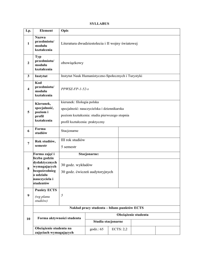 SYLLABUS Lp. Element Opis 1 Nazwa przedmiotu/ modułu kształcenia Literatura dwudziestolecia i II wojny światowej 2 Typ przedmiotu/ modułu kształcenia obowiązkowy 3 Instytut Instytut Nauk Humanistyczno-Społecznych i Turystyki 4 Kod przedmiotu/ modułu kształcenia PPWSZ-FP-1-52-s 5 Kierunek, specjalność, poziom i profil kształcenia 6 Forma studiów 7 Rok studiów, semestr 8 Forma zajęć i liczba godzin dydaktycznych wymagających bezpośrednieg o udziału nauczyciela i studentów kierunek: filologia polska specjalność: nauczycielska i dziennikarska poziom kształcenia: studia pierwszego stopnia profil kształcenia: praktyczny Stacjonarne III rok studiów 5 semestr Stacjonarne: 30 godz. wykładów 30 godz. ćwiczeń audytoryjnych Punkty ECTS 9 (wg planu studiów) 5 Nakład pracy studenta – bilans punktów ECTS 10 Obciążenie studenta Forma aktywności studenta Studia stacjonarne Obciążenie studenta na zajęciach wymagających godz.: 65 ECTS: 2,2 bezpośredniego udziału nauczycieli akademickich, w tym: Udział w wykładach (godz.) 30 Udział w ćwiczeniach/ seminariach/ zajęciach praktycznych/ praktykach zawodowych (godz.) 30 Dodatkowe godziny kontaktowe z nauczycielem (godz.) 4 Udział w egzaminie (godz.) 1 Obciążenie studenta związane z nauką samodzielną, w tym: godz.: 85 ECTS: 2,8 Samodzielne studiowanie tematyki zajęć/ przygotowanie się do ćwiczeń (godz.) 60 Przygotowanie do zaliczenia/ egzaminu (godz.) 15 Wykonanie prac zaliczeniowych (referat, projekt, prezentacja itd.) (godz.) 10 Obciążenie studenta w ramach zajęć związanych z praktycznym przygotowaniem zawodowym godz.: ECTS: godz.: 150 ECTS: 5 Suma (obciążenie studenta na zajęciach wymagających bezpośredniego udziału nauczycieli akademickich oraz związane z nauką samodzielną) 11 Nauczyciel akademicki odpowiedzial ny za dr Ewa Nadolska- Mętel przedmiot/ moduł (egzaminując y) 12 Nauczyciele akademiccy prowadzący przedmiot/ dr Ewa Nadolska- Mętel moduł zaliczone co najmniej dwa z trzech modułów historycznoliterackich: 13 14 Wymagania literatura staropolska, literatura romantyzmu, literatura pozytywizmu i (kompetencje) Młodej Polski wstępne rozumienie najważniejszych dzieł i procesów literatury polskiej 1918Założenia i 1945; znajomość podstawowych faktów i procesów ówczesnej kultury literackiej, umiejętność samodzielnej, a zarazem adekwatnej cele historycznie oraz estetycznie analizy i interpretacji tekstu literackiego przedmiotu Opis efektów kształcenia w zakresie: Odniesienie do kierunkowych efektów kształcenia Odniesienie do efektów kształcenia dla obszaru WIEDZY Student zna kanon literatury polskiej lat 1918-45, a także wybrane teksty z W1 kanonu literatury światowej. W2 15 Efekty kształcenia W3 W4 Student potrafi wskazać przemiany zachodzące na przestrzeni czasu w kwestii recepcji dzieł literackich i określić jej przyczyny Student zna i rozumie estetyczną i ideologiczną swoistość literatury XXlecia i literatury czasu II wojny światowej, a także ich wewnętrzne estetyczne i ideologiczne bogactwo. Student posiada podstawową wiedzę o antropologicznych i filozoficznych kontekstach literatury lat 1918-1945. Potrafi wykorzystać je w interpretacji dzieła literackiego H1P_W01 H1P_W02 K_W01 H1P_W03 H1P_W04, K_W10 H1P_W01, H1P_W02, K_W04, H1P_W04, H1P_W03 H1P_W01 K_W05, H1P_W02 UMIEJĘTNOŚCI U1 Potrafi samodzielnie wyszukiwać, poddawać selekcji, hierarchizacji i analizie informacje dotyczące literatury dwudziestolecia i II wojny światowej, wykorzystując różne źródła i sposoby kwerendy. H1P_U01 K_U06 H1P_U11 U2 U3 Potrafi samodzielnie dokonać analizy i interpretacji literatury dwudziestolecia i II wojny światowej w kontekście biograficznym, historyczno-literackim i kulturowym Student potrafi przygotować samodzielną ustną wypowiedź analizującą i interpretującą tekst literacki, uwzględniając jego konteksty kulturowe: literackie, historyczne, artystyczne, filozoficzne. K_U01-04 K_U10 K_U11 K_U13 K_U14 H1P_U0103 H1P_U0910 H1P_U1213 H1P_U0103 K_U01-04 K_U13 K_U14 H1P_U0910 H1P_U1213 KOMPETENCJI SPOŁECZNYCH 16 Treści kształcenia K1 Potrafi samodzielnie rozwijać swoją wiedzę dotyczącą literatury dwudziestolecia i II wojny światowej K_K01 H1P_K01 K2 Rozwija swoje zdolności do samodzielnej, krytycznej analizy procesów politycznych, społecznych, kulturowych i ich wzajemnej korelacji. Zdobyta wiedza pozwala mu świadomie uczestniczyć w życiu społecznym i stymuluje jego rozwój osobisty K_K03 H1P_K03 K3 Aktywnie uczestniczy kulturalnym K_K06 w życiu H1P_K06 literatura polska od roku 1918 do roku 1945: kanon, wewnętrzna periodyzacja, najważniejsze prądy estetyczno-literackie epoki i ich uwarunkowania kulturowe; analiza historycznoliteracka i interpretacja wybranych tekstów epoki; wybrane zagadnienia kultury literackiej epoki: ugrupowania literackie, manifesty, czasopisma; wybrane zagadnienia z literatury powszechnej; zagadnienie własności intelektualnej Wykłady: Wykład wstępny: granice czasowe omawianych zjawisk, pojęcie modernizmu, pojęcie procesu historycznoliterackiego; Poezja dwudziestolecia: grupy poetyckie, najwybitniejsi przedstawiciele, manifesty literackie, dynamika procesu historyczno-literackiego; Fenomen: Leśmian; Awangarda Krakowska: zręby poetyki; Katastrofizm w poezji dwudziestolecia; Proza dwudziestolecia: charakterystyka ogólna, główne nurty i dynamika procesu historycznoliterackiego; Starzy mistrzowie: Żeromski, Strug, Reymont, Świętochowski; Fenomen: Berent; Proza psychologiczna: Nałkowska, Dąbrowska, Choromański, Kuncewiczowa, Iwaszkiewicz; Grupa „Przedmieście” - zręby poetyki; Fenomen: Schulz; Dramat dwudziestolecia: uwagi ogólne, przegląd najważniejszych twórców i ich dokonań; Fenomen: Witkacy; Literatura czasu wojny: uwagi ogólne, rys syntetyczny zjawiska; Fenomen: Baczyński i środowisko „Sztuki i Narodu”. 17 Stosowane metody dydaktyczne wykład informacyjny, wyk