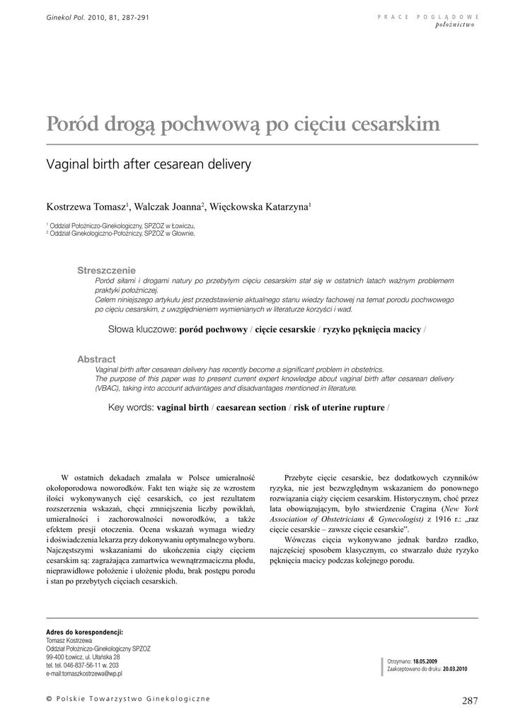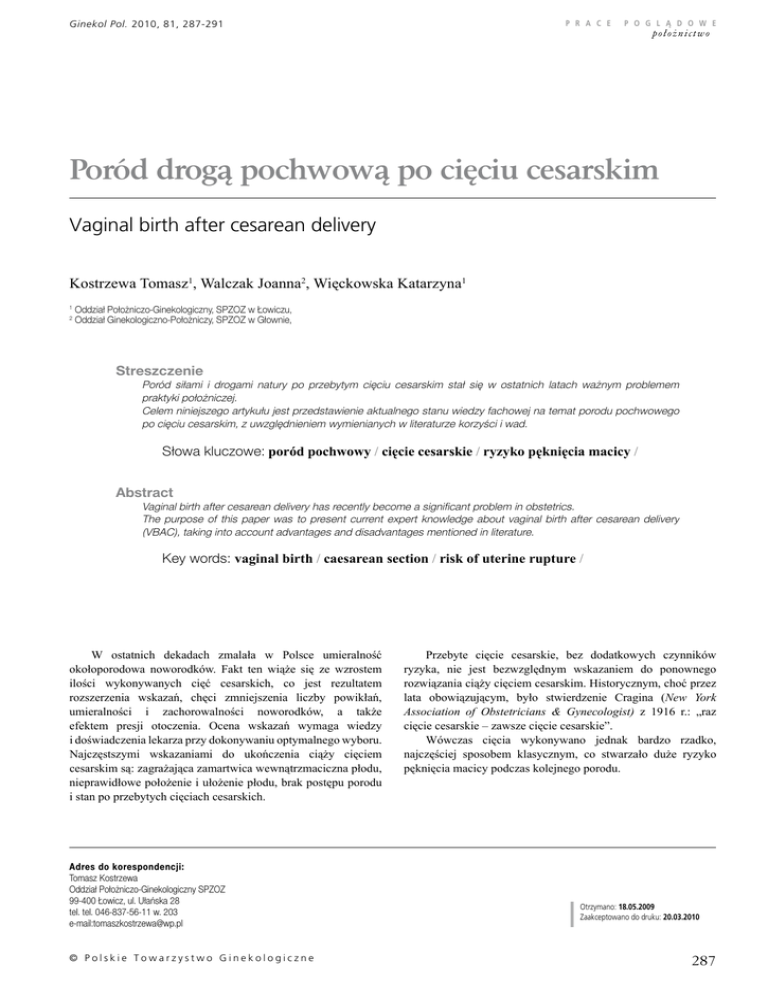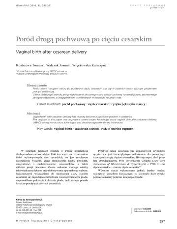 Ginekol Pol. 2010, 81, 287-291 P R A C E P O G L Ñ D O W E po∏o˝nictwo Poród drogą pochwową po cięciu cesarskim Vaginal birth after cesarean delivery Kostrzewa Tomasz1, Walczak Joanna2, Więckowska Katarzyna1 1 2 Oddział Położniczo-Ginekologiczny, SPZOZ w Łowiczu, Oddział Ginekologiczno-Położniczy, SPZOZ w Głownie, Streszczenie Poród siłami i drogami natury po przebytym cięciu cesarskim stał się w ostatnich latach ważnym problemem praktyki położniczej. Celem niniejszego artykułu jest przedstawienie aktualnego stanu wiedzy fachowej na temat porodu pochwowego po cięciu cesarskim, z uwzględnieniem wymienianych w literaturze korzyści i wad. Słowa kluczowe: poród pochwowy / cięcie cesarskie / ryzyko pęknięcia macicy / Abstract Vaginal birth after cesarean delivery has recently become a significant problem in obstetrics. The purpose of this paper was to present current expert knowledge about vaginal birth after cesarean delivery (VBAC), taking into account advantages and disadvantages mentioned in literature. Key words: vaginal birth / caesarean section / risk of uterine rupture / W ostatnich dekadach zmalała w Polsce umieralność okołoporodowa noworodków. Fakt ten wiąże się ze wzrostem ilości wykonywanych cięć cesarskich, co jest rezultatem rozszerzenia wskazań, chęci zmniejszenia liczby powikłań, umieralności i zachorowalności noworodków, a także efektem presji otoczenia. Ocena wskazań wymaga wiedzy i doświadczenia lekarza przy dokonywaniu optymalnego wyboru. Najczęstszymi wskazaniami do ukończenia ciąży cięciem cesarskim są: zagrażająca zamartwica wewnątrzmaciczna płodu, nieprawidłowe położenie i ułożenie płodu, brak postępu porodu i stan po przebytych cięciach cesarskich. Adres do korespondencji: Tomasz Kostrzewa Oddział Położniczo-Ginekologiczny SPZOZ 99-400 Łowicz, ul. Ułańska 28 tel. tel. 046-837-56-11 w. 203 e-mail:[email protected] © Polskie Towarzystwo Ginekologiczne Przebyte cięcie cesarskie, bez dodatkowych czynników ryzyka, nie jest bezwzględnym wskazaniem do ponownego rozwiązania ciąży cięciem cesarskim. Historycznym, choć przez lata obowiązującym, było stwierdzenie Cragina (New York Association of Obstetricians & Gynecologist) z 1916 r.: „raz cięcie cesarskie – zawsze cięcie cesarskie”. Wówczas cięcia wykonywano jednak bardzo rzadko, najczęściej sposobem klasycznym, co stwarzało duże ryzyko pęknięcia macicy podczas kolejnego porodu. Otrzymano: 18.05.2009 Zaakceptowano do druku: 20.03.2010 287 P R A C E Ginekol Pol. 2010, 81, 287-291 P O G L Ñ D O W E po∏o˝n i c t w o Kostrzewa T, et al. Jednym z największych osiągnięć współczesnej medycyny perinatalnej jest rozwój technik wykonywania cięcia, dzięki czemu operacja ta stała się stosunkowo bezpieczną metodą zakończenia ciąży. Pod koniec XX wieku stwierdzono, że cięcie w dolnej części macicy nie wiąże się ze znacząco zwiększonym ryzykiem pęknięcia macicy w kolejnej ciąży. Opublikowane dane wskazują, że w USA rozejście się blizny po cięciu cesarskim występuje u <1% pacjentek po porodzie drogą pochwową. W grupie 8899 kobiet po cięciu cesarskim, które Enkin objął analizą, 79,9 % urodziło drogami natury, 20,1 % za pomocą cięcia. Mimo tych danych, odsetek kobiet rodzących drogą pochwową po cięciu cesarskim wynosił w USA w 1993 jednak nadal tylko 25,4 % [1, 2]. Analiza częstości cięć cesarskich w latach 1979-1999 w Szpitalu Wojewódzkim w Gorzowie Wielkopolskim, wykazała prawie trzykrotny wzrost liczby cięć (1,64% ogółu rodzących; >1,8 razy niż w1979r.), w którym znaczącą rolę odegrało wskazanie: „stan po przebytym cięciu cesarskim” [3]. Należy podkreślić, że w 2000r. po raz pierwszy pojawiło się nowe wskazanie: prośba pacjentki o operacyjne ukończenie porodu (0,25%). Stan po cięciu cesarskim, jako wskazanie do kolejnego, od 1985 r. występowało rzadziej. Częstość tego wskazania do 2000r. spadła dwukrotnie [4]. W latach 1970-93 liczba porodów drogami natury po cięciu cesarskim wzrosła. W 1996 r. 28% kobiet, z cięciem cesarskim w wywiadzie, urodziło drogą pochwową (50% wzrost od 1989 r.). W Polsce w latach 1966-75 odsetek porodów drogami natury po cięciu cesarskim wynosił 47,4%, ale w latach 1986-96 już tylko 21,7%. Niektóre źródła podają, że w ostatnich latach, stan po cięciu cesarskim stał się na świecie jednym z najczęstszych wskazań do kolejnego cięcia (do 94% w Norwegii). W Polsce elektywne powtórne, cięcie cesarskie stanowi około 1/3 tych zabiegów. Stan po cięciu cesarskim stanowił w 2002 roku 35% wskazań do cięcia cesarskiego i było to wskazanie najczęstsze (np. brak postępu porodu – 30%, położenie miednicowe – 12%,). Według Szachułowicza, który dokonał analizy sposobu porodu w grupie 262 pacjentek w latach 1993-95, najczęstszym wskazaniem do wykonania elektywnego cięcia cesarskiego były choroby matki oraz pogarszanie się parametrów u płodu. Natomiast brak postępu porodu był wskazaniem do cięcia cesarskiego po podjęciu próby porodu drogą pochwową. U 27% pacjentek wskazania do kolejnego cięcia cesarskiego pokrywały się ze wskazaniami do pierwszej operacji [5, 6]. Co zatem przemawia przeciw, a co za porodem drogami i siłami natury po przebytym cięciu cesarskim? Przeciwnicy twierdzą, że poród drogą pochwową po cięciu cesarskim jest bardziej ryzykowny. W doniesieniu Yetmana i Nolana z Wirginii czytamy, że próbę porodu drogami i siłami natury podjęto w 42% przypadków kobiet po cięciu cesarskim. Śmiertelność noworodków w tym badaniu wyniosła 9/1000, ale trudno jest bezpośrednio przypisać te zgony próbie porodu drogą pochwową. Chazotte i Cohen z Nowego Yorku donoszą, że pęknięcie macicy i łożysko przodujące oraz łożysko przyrośnięte z towarzyszącym krwawieniem były głównymi przyczynami śmiertelności i poważnych powikłań w porodach drogą pochwow