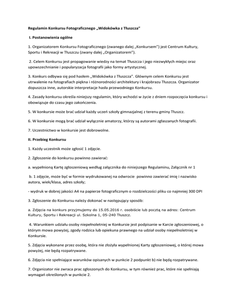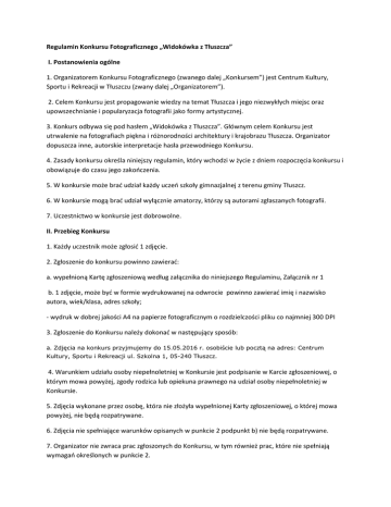 Regulamin Konkursu Fotograficznego „Widokówka z Tłuszcza” I. Postanowienia ogólne 1. Organizatorem Konkursu Fotograficznego (zwanego dalej „Konkursem”) jest Centrum Kultury, Sportu i Rekreacji w Tłuszczu (zwany dalej „Organizatorem”). 2. Celem Konkursu jest propagowanie wiedzy na temat Tłuszcza i jego niezwykłych miejsc oraz upowszechnianie i popularyzacja fotografii jako formy artystycznej. 3. Konkurs odbywa się pod hasłem „Widokówka z Tłuszcza”. Głównym celem Konkursu jest utrwalenie na fotografiach piękna i różnorodności architektury i krajobrazu Tłuszcza. Organizator dopuszcza inne, autorskie interpretacje hasła przewodniego Konkursu. 4. Zasady konkursu określa niniejszy regulamin, który wchodzi w życie z dniem rozpoczęcia konkursu i obowiązuje do czasu jego zakończenia. 5. W konkursie może brać udział każdy uczeń szkoły gimnazjalnej z terenu gminy Tłuszcz. 6. W konkursie mogą brać udział wyłącznie amatorzy, którzy są autorami zgłaszanych fotografii. 7. Uczestnictwo w konkursie jest dobrowolne. II. Przebieg Konkursu 1. Każdy uczestnik może zgłosić 1 zdjęcie. 2. Zgłoszenie do konkursu powinno zawierać: a. wypełnioną Kartę zgłoszeniową według załącznika do niniejszego Regulaminu, Załącznik nr 1 b. 1 zdjęcie, może być w formie wydrukowanej na odwrocie powinno zawierać imię i nazwisko autora, wiek/klasa, adres szkoły; - wydruk w dobrej jakości A4 na papierze fotograficznym o rozdzielczości pliku co najmniej 300 DPI 3. Zgłoszenie do Konkursu należy dokonać w następujący sposób: a. Zdjęcia na konkurs przyjmujemy do 15.05.2016 r. osobiście lub pocztą na adres: Centrum Kultury, Sportu i Rekreacji ul. Szkolna 1, 05-240 Tłuszcz. 4. Warunkiem udziału osoby niepełnoletniej w Konkursie jest podpisanie w Karcie zgłoszeniowej, o którym mowa powyżej, zgody rodzica lub opiekuna prawnego na udział osoby niepełnoletniej w Konkursie. 5. Zdjęcia wykonane przez osobę, która nie złożyła wypełnionej Karty zgłoszeniowej, o której mowa powyżej, nie będą rozpatrywane. 6. Zdjęcia nie spełniające warunków opisanych w punkcie 2 podpunkt b) nie będą rozpatrywane. 7. Organizator nie zwraca prac zgłoszonych do Konkursu, w tym również prac, które nie spełniają wymagań określonych w punkcie 2. 8. Termin zgłaszania do Konkursu upływa 15.05.2016 r. o godz. 16.00. Za datę zgłoszenia uważa się datę wpływu pracy konkursowej do siedziby Organizatora. Zgłoszenia dostarczone po terminie nie będą rozpatrywane. 9. Zwycięzców Konkursu wyłania Komisja konkursowa. 10. Komisja ocenia każde zdjęcie z uwzględnieniem następujących kryteriów: a. pomysłowość, b. jakość techniczna, c. kompozycja, d. zgodność z hasłem przewodnim Konkursu. 11. Szczegółowy tryb wyłaniania nagrodzonych i wyróżnionych zdjęć ustali Komisja. 12. Decyzje Komisji są ostateczne. 13. Komisja wskaże trzy najlepsze zdjęcia, których autorzy otrzymają kolejno tytuły: a. „I miejsce w Konkursie Fotograficznym” oraz nagrodę rzeczową. b. „II miejsce w Konkursie Fotograficznym” oraz nagrodę rzeczową. c. „III miejsce w Konkursie Fotograficznym” oraz nagrodę rzeczową. 14. Organizator zastrzega sobie prawo przyznania dodatkowych nagród i wyróżnień. 15. Komisja ma prawo do niewyłonienia zwycięzców, jak i przyznawania miejsc ex aequo i do unieważnienia konkursu włącznie, bez podania przyczyny. 16. Wręczenie nagród nastąpi na XX dniach Tłuszcza, które odbędą się 11.06.2016 r. 17. Wyniki Konkursu wraz z nagrodzonymi i wyróżnionymi zdjęciami zostaną opublikowane na stronie internetowej www.cktluszcz.pl oraz na oficjalnym profilu Centrum Kultury, Sportu i Rekreacji na Facebooku. III Wykorzystanie prac nadesłanych na konkurs 1. Organizator ma prawo publikowania w środkach przekazu (Internet, prasa, ulotki, inne) listy nagrodzonych i wyróżnionych uczestników Konkursu. 2. Uczestnicy Konkursu wyrażają zgodę na bezpłatne publikowanie ich danych osobowych, wizerunku oraz zgłoszonych na Konkurs zdjęć w materiałach informacyjnych o Konkursie oraz innych materiałach promocyjnych i informacyjnych Organizatora na wszystkich polach eksploatacji znanych w chwili opublikowania niniejszego Regulaminu tj.: a) utrwalanie na jakimkolwiek nośniku, w szczególności na: dyskach komputerowych, nośnikach video, taśmie światłoczułej, magnetycznej, wszystkich typach nośników przeznaczonych do zapisu cyfrowego oraz w formie zapisów fotograficznych i/lub wydruku na papierze spisanej relacji; b) zwielokrotnianie jakąkolwiek techniką, w tym: techniką magnetyczną na kasetach video, dyskach audiowizualnych, techniką światłoczułą i cyfrową, techniką zapisu komputerowego na wszystkich rodzajach nośników dostosowanych do tej formy zapisu, wytwarzanie określoną techniką egzemplarzy utworu, w tym techniką drukarską, reprograficzną, zapisu magnetycznego oraz techniką cyfrową (w tym CD, DVD, CD ROM, UCD, itp.); c) wprowadzanie egzemplarzy nośników do obrotu na terytorium Rzeczypospolitej Polskiej i poza jego granicami; wprowadzanie do obrotu przy użyciu Internetu i innych technik przekazu danych wykorzystujących sieci telekomunikacyjne, informatyczne i bezprzewodowe; d) publiczne wykonanie, wystawienie, wyświetlenie, odtworzenie; e) publiczne udostępnianie dzieła w taki sposób, aby każdy mógł mieć do niego dostęp w miejscu i czasie przez siebie wybranym; f) użyczenie, najem, dzierżawa lub wymiana nośników, na których dzieło utrwalono; g) wprowadzenie do pamięci komputera, do sieci komputerowej i/lub multimedialnej w nieograniczonej ilości nadań i wielkości nakładów; h) wykorzystywanie na stronach internetowych Zamawiającego; i) wykorzystywanie w utworach multimedialnych; j) wykorzystywanie fragmentów dzieła do celów promocyjnych; k) nadawanie za pośrednictwem Internetu; W szczególności Organizator ma prawo nieodpłatnie wykorzystać zdjęcia zg