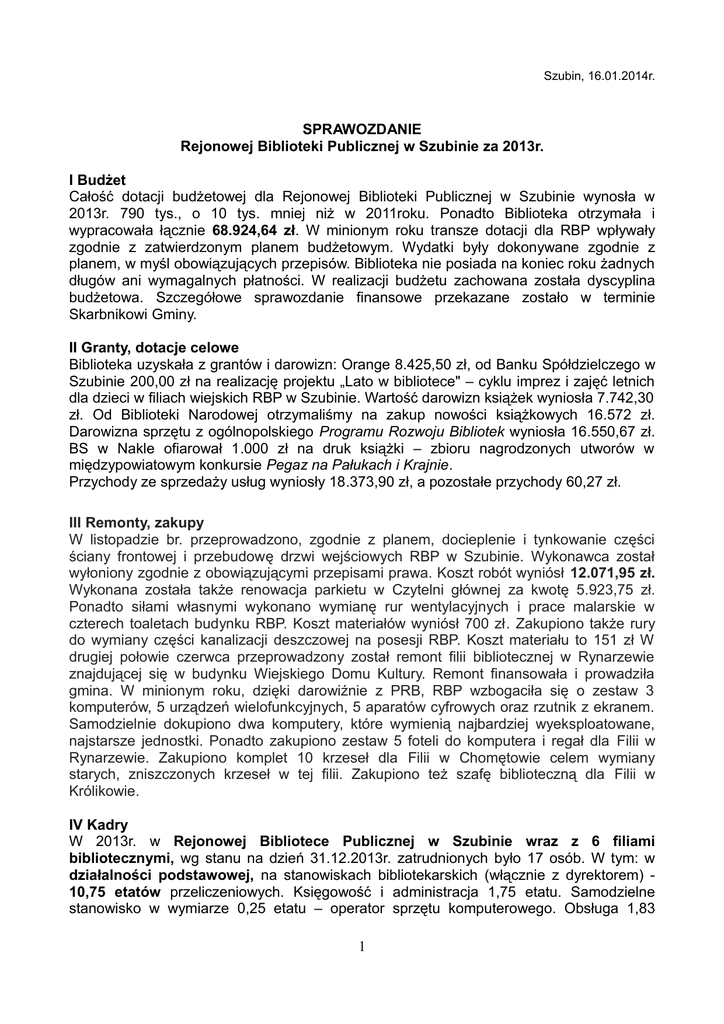Szubin, 16.01.2014r. SPRAWOZDANIE Rejonowej Biblioteki Publicznej w Szubinie za 2013r. I Budżet Całość dotacji budżetowej dla Rejonowej Biblioteki Publicznej w Szubinie wynosła w 2013r. 790 tys., o 10 tys. mniej niż w 2011roku. Ponadto Biblioteka otrzymała i wypracowała łącznie 68.924,64 zł. W minionym roku transze dotacji dla RBP wpływały zgodnie z zatwierdzonym planem budżetowym. Wydatki były dokonywane zgodnie z planem, w myśl obowiązujących przepisów. Biblioteka nie posiada na koniec roku żadnych długów ani wymagalnych płatności. W realizacji budżetu zachowana została dyscyplina budżetowa. Szczegółowe sprawozdanie finansowe przekazane zostało w terminie Skarbnikowi Gminy. II Granty, dotacje celowe Biblioteka uzyskała z grantów i darowizn: Orange 8.425,50 zł, od Banku Spółdzielczego w Szubinie 200,00 zł na realizację projektu „Lato w bibliotece" – cyklu imprez i zajęć letnich dla dzieci w filiach wiejskich RBP w Szubinie. Wartość darowizn książek wyniosła 7.742,30 zł. Od Biblioteki Narodowej otrzymaliśmy na zakup nowości książkowych 16.572 zł. Darowizna sprzętu z ogólnopolskiego Programu Rozwoju Bibliotek wyniosła 16.550,67 zł. BS w Nakle ofiarował 1.000 zł na druk książki – zbioru nagrodzonych utworów w międzypowiatowym konkursie Pegaz na Pałukach i Krajnie. Przychody ze sprzedaży usług wyniosły 18.373,90 zł, a pozostałe przychody 60,27 zł. III Remonty, zakupy W listopadzie br. przeprowadzono, zgodnie z planem, docieplenie i tynkowanie części ściany frontowej i przebudowę drzwi wejściowych RBP w Szubinie. Wykonawca został wyłoniony zgodnie z obowiązującymi przepisami prawa. Koszt robót wyniósł 12.071,95 zł. Wykonana została także renowacja parkietu w Czytelni głównej za kwotę 5.923,75 zł. Ponadto siłami własnymi wykonano wymianę rur wentylacyjnych i prace malarskie w czterech toaletach budynku RBP. Koszt materiałów wyniósł 700 zł. Zakupiono także rury do wymiany części kanalizacji deszczowej na posesji RBP. Koszt materiału to 151 zł W drugiej połowie czerwca przeprowadzony został remont filii bibliotecznej w Rynarzewie znajdującej się w budynku Wiejskiego Domu Kultury. Remont finansowała i prowadziła gmina. W minionym roku, dzięki darowiźnie z PRB, RBP wzbogaciła się o zestaw 3 komputerów, 5 urządzeń wielofunkcyjnych, 5 aparatów cyfrowych oraz rzutnik z ekranem. Samodzielnie dokupiono dwa komputery, które wymienią najbardziej wyeksploatowane, najstarsze jednostki. Ponadto zakupiono zestaw 5 foteli do komputera i regał dla Filii w Rynarzewie. Zakupiono komplet 10 krzeseł dla Filii w Chomętowie celem wymiany starych, zniszczonych krzeseł w tej filii. Zakupiono też szafę biblioteczną dla Filii w Królikowie. IV Kadry W 2013r. w Rejonowej Bibliotece Publicznej w Szubinie wraz z 6 filiami bibliotecznymi, wg stanu na dzień 31.12.2013r. zatrudnionych było 17 osób. W tym: w działalności podstawowej, na stanowiskach bibliotekarskich (włącznie z dyrektorem) 10,75 etatów przeliczeniowych. Księgowość i administracja 1,75 etatu. Samodzielne stanowisko w wymiarze 0,25 etatu – operator sprzętu komputerowego. Obsługa 1,83 1 etatu. Ogółem 14,83 etatów przeliczeniowych. Ponadto w minionym roku w bibliotece pracowało okoresowo czworo stażystów. V Katalogi / kartoteki Od połowy maja 2012r. w bibliotece miejskiej rozpoczęto rozprowadzanie kart dostępowych dla czytelników. Docelowo ma to rozszerzyć bazę danych, z której będą mogli korzystać czytelnicy. Usprawni też elektroniczną obsługę czytelniów, a także przyspieszy prace inwentaryzacyjne. Na stronie głównej biblioteki (biblioteka.szubin.pl) znajduje się odsyłacz do zdigitalizowanych roczników "Orędownika Szubińskiego". Za pośrednictwem naszej strony można przeglądać całość zbiorów "Orędownika Szubińskiego" posiadanego przez naszą bibliotekę. Rejonowa Biblioteka Publiczna w Szubinie proponuje czytelnikom usługę: zamawiania książek w zbiorach RBP za pośrednictwem Internetu, na adres: [email protected] Do dyspozycji klientów książnicy jest też udostępniony elektroniczny katalog. Aby z niego skorzystać, nie przychodząc do biblioteki, wystarczy wejść na stronę: www.biblioteka.szubin.pl i kliknąć zakładkę: "Katalogi". Obecnie RBP posiada 23.118 skatalogowanych elektronicznie woluminów (o 8.262 wiecej niż w roku minionym). VI Komputeryzacja bibliotek Nasycenie sprzętem komputerowym bibliotek Gminy i Miasta Szubin jest zadawalające. Obecnie RBP w swej siedzibie w Szubinie, posiada 22 komputery z tego z dostępem do Internetu 21 w tym 2 służą jako dostęp do katalogu on-line. Dla czytelników dostępnych jest 9 stanowisk komputerowych z dostępem do Internetu. Filia biblioteczna w Rynarzewie posiada 3 stanowiska komputerowe (w tym 2 dla czytelników), Filia w Samoklęskach 4 stanowiska (w tym 3 dla czytelników). Filia w Chomętowie 4 stanowiska (3 udostępnione czytelnikom). Placówka w Słonawach 2 stanowiska, a Filia w Królikowie 3 stanowiska komputerowe (wszystkie z dostępem dla czytelników). Obecnie prowadzi się zakup zbiorów oraz opracowanie i ich katalogowanie drogą elektroniczną. Wszystkie biblioteki wiejskie posiadają komputery z szerokim łączem internetowym. Łącznie RBP dysponuje 38 komputerami w tym z dostępem do Internetu 37, a dostępnych dla czytelnikow 23. Należy dodać, że stan techniczny sieci komputerowej poprawia się z roku na rok i jest obecnie dość dobry. Oprogramowanie RBP wykorzystuje oprogramowanie "MAK+". Ponadto każda jednostka wyposażona jest w oprogramowanie legalne najczęściej Windows, Corel, Word, ale też w oprogramowanie ogólnie dostępne w formie nieodpłatnej jak Open Office. Program MAK+ wykorzystuje się w siedzibie RBP w celu katalogowania i opracowywania zbiorów. Źródła finansowania Podstawą finansowania komputeryzacji w RBP w Szubinie jest dotacja Samorządu. W roku minionym otrzymaliśmy