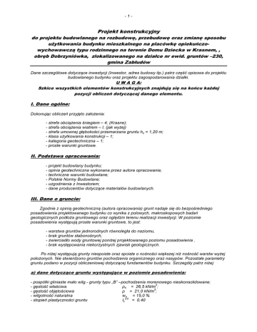 -1- Projekt konstrukcyjny do projektu budowlanego na rozbudowę, przebudowę oraz zmianę sposobu użytkowania budynku mieszkalnego na placówkę opiekuńczowychowawczą typu rodzinnego na terenie Domu Dziecka w Krasnem, , obręb Dobrzyniówka, zlokalizowanego na działce nr ewid. gruntów –230, gmina Zabłudów Dane szczegółowe dotyczące inwestycji (Inwestor, adres budowy itp.) patrz część opisowa do projektu budowlanego budynku oraz projektu zagospodarowania działki. U W A G A: Szkice wszystkich elementów konstrukcyjnych znajdują się na końcu każdej pozycji obliczeń dotyczącej danego elementu. I. Dane ogólne: Dokonując obliczeń przyjęto założenia: - strefa obciążenia śniegiem – 4; (Krasne); - strefa obciążenia wiatrem – I; (jak wyżej) - strefa umownej głębokości przemarzana gruntu hz = 1,20 m; - klasa użytkowania konstrukcji – 1; - kategoria geotechniczna – 1; - proste warunki gruntowe. II. Podstawa opracowania: - projekt budowlany budynku; - opinia geotechniczna wykonana przez autora opracowania; - techniczne warunki budowlane; - Polskie Normy Budowlane; - uzgodnienia z Inwestorem; - dane producentów dotyczące materiałów budowlanych. III. Dane o gruncie: Zgodnie z opinią geotechniczną (autora opracowania) grunt nadaje się do bezpośredniego posadowienia projektowanego budynku co wynika z polowych, makroskopowych badań geologicznych podłoża gruntowego oraz oględzin terenu realizacji inwestycji. W poziomie posadowienia występują proste warunki gruntowe, to jest: - warstwa gruntów jednorodnych równoległa do naziomu, - brak gruntów słabonośnych, - zwierciadło wody gruntowej poniżej projektowanego poziomu posadowienia , - brak występowania niekorzystnych zjawisk geologicznych. Po niżej występują grunty niespoiste oraz spoiste o nośności większej niż nośność warstw wyżej położonych. Nie stwierdzono gruntów pochodzenia organicznego oraz nasypów. Pozostałe parametry gruntu podano w pozycji obliczeniowej dotyczącej fundamentów budynku. Szczegóły patrz niżej: a) dane dotyczące gruntu występujące w poziomie posadowienia: - pospółki gliniaste mało wilg.- grunty typu „B” –pochodzenia morenowego nieskonsolidowane; 3 - gęstość właściwa ρs = 26,5 kN/m ; 3 - gęstość objętościowa ρ = 21,0 kN/m ; - wilgotność naturalna wn = 15,0 % (n) - stopień plastyczności gruntu IL = 0,40 -2- kąt tarcia wewnętrznego - spójność gruntu (n) 0 Φ = 14,15 ; (n) Cu = 24,76 kPa; b) analiza warunków geotech. oraz ustalenie warunków posadowienia: Teren nadaje się do bezpośredniego posadowienia na gruncie rodzimym projektowanych fundamentów. Najsłabsza (najmniej nośna) warstwa podłoża gruntowego występuje w poziomie posadowienia fundamentów lub po wyżej tego poziomu. Zaleca się wykonanie pod fundamentami podkładu z chudego betonu o grubości około – 10,00 cm. Miejsca przekopane uzupełniać chudym betonem a napotkane soczewki gruntów słabonośnych wymienić na pospółki zagęszczane mechanicznie warstwami po około 15,00 cm do stopnia zagęszczenia – ID ≥ 0,63. IV. Opis konstrukcji i rozwiązań materiałowych – stan istniejący: Rozbudowa, przebudowa i zmiana sposobu użytkowania dwukondygnacyjnego i niepodpiwniczonego budynku mieszkalnego zrealizowanego w technologii tradycyjnej – układ konstrukcyjny podłużny. Zmiana sposobu użytkowania dotyczy jedynie części budynku – parteru, który będzie przeznaczony na placówkę opiekuńczo – wychowawczą typu rodzinnego. Pomieszczenia zlokalizowane na I piętrze będą nadal pełniły funkcję mieszkalną – mieszkanie służbowe. Nie ulegną więc zmianie obciążenia jakie ma przenosić strop nad parterem i poddaszem oraz klatka schodowa z poziomu parteru na poziom posadzki I piętra. Zgodnie z ekspertyzą stan tych elementów konstrukcyjnych jest zadawalający i mogą one być użytkowane jako konstrukcyjne elementy budynku mieszkalnego. Poniżej podano krótki opis stanu istniejącego oraz zamieszczono obliczenia i szkice wykonawcze konstrukcyjnych elementów nowoprojektowanych związanych z pełnieniem przez parter budynku nowej funkcji. Ściany konstr. nadziemia – zewnętrzne o konstrukcji drewnianej wieńcowej wykonane z tarcicy iglastej, wewnętrzne murowane z cegły ceramicznej pełnej klasy „10” na zaprawie cementowowapiennej marki „M 5”. Strop nad parterem i piętrem drewniany o konstrukcji belkowej wykonany z tarcicy iglastej klasy wytrzymałościowej określonej w ekspertyzie na – C27. Więźba dachowa symetryczna drewniana z tarcicy iglastej o klasie wytrzymałościowej określonej w ekspertyzie na – C27. Fundamenty – monolityczne, wylewane z betonu C12/15 (B15) posadowione bezpośrednio na gruncie rodzimym. Budynek posiada II kondygnacje naziemne (parter i piętro) oraz poddasze nieużytkowe i jest zaliczany do budynków niskich (N). Kategoria geotechniczna – 1, klasa użytkowania konstrukcji – 1; klasa odporności ogniowej ZLIV, kategoria obiektu XIII (budynki mieszkalne). Budynek jest zlokalizowany w IV strefie klimatycznej, strefa obciążeniem śniegiem – 4, strefa wiatrowa – I, teoretyczna głębokość przemarzania gruntu – 1,2 m. Obiekt jest wyposażony w instalację elektryczną oświetleniową i gniazd wtykowych, telekomunikacji, instalacje sanitarne takie jak wod.-kan., co. , cw. (zdalaczynne) i wentylacji grawitacyjnej oraz w przyłączą wod. – kan. co. i cw., elektryczne i telekomunikacyjne. V. Schematy konstrukcyjne oraz inne założenia projektowe: Sztywność przestrzenną konstrukcji we wszystkich kierunkach będzie zapewniona przez układ nośnych ścian konstrukcyjnych i tarczy poziomych utworzonych przez istniejące stropy o konstrukcji drewnianej - belkowej. Przyjęte schematy konstrukcyjne i rozwiązanie materiałowe – patrz poniższe obliczenia konstrukcyjne. Wykonując obliczenia założono następujące obciążenia konstrukcji: 2 Obciążenie śniegiem wg PN-80/