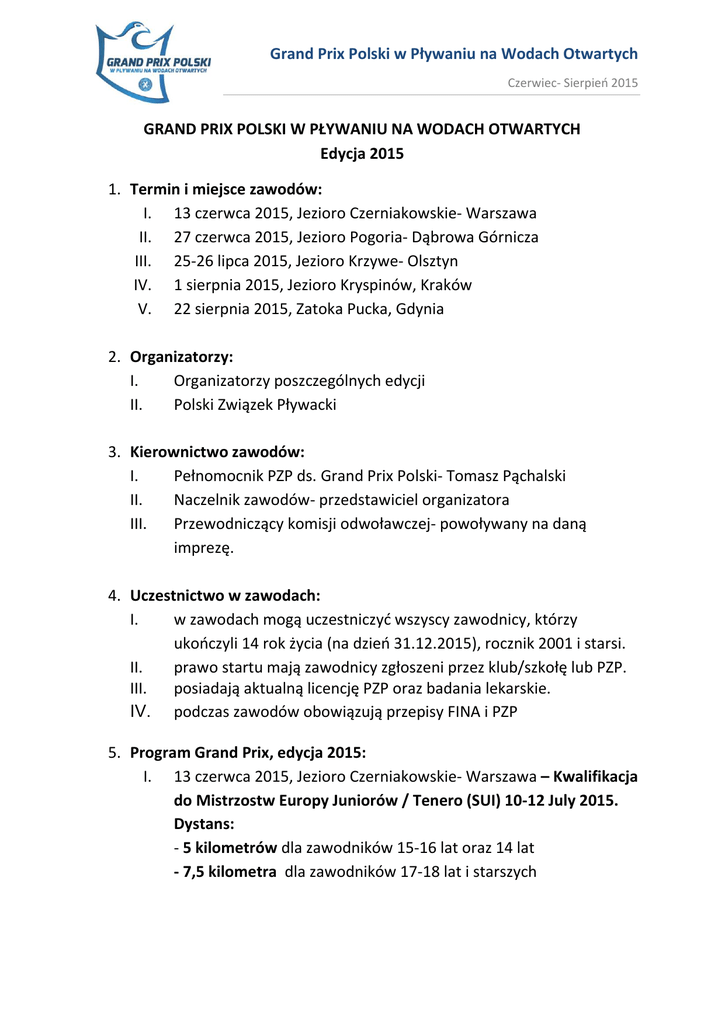 Grand Prix Polski w Pływaniu na Wodach Otwartych Czerwiec- Sierpieo 2015 GRAND PRIX POLSKI W PŁYWANIU NA WODACH OTWARTYCH Edycja 2015 1. Termin i miejsce zawodów: I. 13 czerwca 2015, Jezioro Czerniakowskie- Warszawa II. 27 czerwca 2015, Jezioro Pogoria- Dąbrowa Górnicza III. 25-26 lipca 2015, Jezioro Krzywe- Olsztyn IV. 1 sierpnia 2015, Jezioro Kryspinów, Kraków V. 22 sierpnia 2015, Zatoka Pucka, Gdynia 2. Organizatorzy: I. Organizatorzy poszczególnych edycji II. Polski Związek Pływacki 3. Kierownictwo zawodów: I. Pełnomocnik PZP ds. Grand Prix Polski- Tomasz Pąchalski II. Naczelnik zawodów- przedstawiciel organizatora III. Przewodniczący komisji odwoławczej- powoływany na daną imprezę. 4. Uczestnictwo w zawodach: I. w zawodach mogą uczestniczyd wszyscy zawodnicy, którzy ukooczyli 14 rok życia (na dzieo 31.12.2015), rocznik 2001 i starsi. II. prawo startu mają zawodnicy zgłoszeni przez klub/szkołę lub PZP. III. posiadają aktualną licencję PZP oraz badania lekarskie. IV. podczas zawodów obowiązują przepisy FINA i PZP 5. Program Grand Prix, edycja 2015: I. 13 czerwca 2015, Jezioro Czerniakowskie- Warszawa – Kwalifikacja do Mistrzostw Europy Juniorów / Tenero (SUI) 10-12 July 2015. Dystans: - 5 kilometrów dla zawodników 15-16 lat oraz 14 lat - 7,5 kilometra dla zawodników 17-18 lat i starszych Grand Prix Polski w Pływaniu na Wodach Otwartych Czerwiec- Sierpieo 2015 II. III. IV. V. 27 czerwca 2015, Jezioro Pogoria III- Dąbrowa Górnicza- POGORIA OPEN WATER- Otwarte Mistrzostwa Dąbrowy Górniczej Dystans: -3 kilometry dla zawodników 14 lat i starszych 25-26 lipca 2015, Jezioro Krzywe- Olsztyn- III Mistrzostwa Polski w Pływaniu Długodystansowym na Wodach Otwartych. Dystans: - 2,5 kilometra dla zawodników 14-letnich - 5 kilometrów dla zawodników 15-16 letnich -7,5 kilometra dla zawodników 17-18 letnich - 10 kilometrów dla zawodników 19lat i starszych 1 sierpnia 2015, Jezioro Kryspinów, Kraków- XXVI Krakowski Maraton Pływacki Dystans: - 5 kilometrów dla zawodników 14 lat i starszych 22 sierpnia 2015, Zatoka Pucka, Gdynia- BCT Gdynia Marathon 2015 Wyścig Open Dystans: - 2950m dla zawodników 14lat i starszych 6. Podział na kategorie wiekowe: I. Rywalizacja odbywa się z podziałem na kobiety oraz mężczyzn. II. Podział na kategorie: 1 kategoria 14lat 2 kategoria 15-16 lat 3 kategoria 17-18 lat 4 kategoria 19lat i starsi 7. Zasady punktacji w cyklu Grand Prix: I. Każdy zawodnik ma prawo do 1 startu w konkurencji przeznaczonej dla swojego rocznika w danej edycji cyklu Grand Prix. II. W każdej kategorii oraz w każdej konkurencji cyklu zawodnicy punktują wg następującego klucza: Grand Prix Polski w Pływaniu na Wodach Otwartych Czerwiec- Sierpieo 2015 III. IV. 1 miejsce- 9 punktów 2 miejsce- 7 punktów 3 miejsce- 6 punktów 4 miejsce- 5 punktów 5 miejsce- 4 punkty 6 miejsce- 3 punkty 7 miejsce- 2 punkty 8 miejsce- 1 punkt 9 miejsce i dalej bez punktu. Aby zawodnik został sklasyfikowany w całej edycji cyklu musi wystąpid minimum w 3 edycjach cyklu Grand Prix, w tym w Mistrzostwach Polski w Pływaniu na Wodach Otwartych. Wszyscy zawodnicy startujący w finałowej edycji Grand Prix w wyścigu Hel- Gdynia z powodu braku możliwości udziału w wyścigu na 2950m z automatu otrzymują 9 punktów do klasyfikacji generalnej cyklu Grand Prix. Zawodnicy wyścigu na 2950m punktują osobno zgodnie z regulaminem. 8. Przepisy techniczne: I. Wyścigi odbywają się zgodnie z regulaminem FINA, PZP oraz poszczególnych edycji cyklu Grand Prix. II. Na wszystkich zawodach cyklu Grand Prix obowiązuje elektroniczny pomiar czasu. 9. Zgłoszenia: I. Zgłoszenia dokonuje się przez formularze zgłoszeniowe do poszczególnych edycji zawodów. II. Zgłoszenia należy przesyład na adres i w terminach zgodnych z regulaminem poszczególnych edycji cyklu Grand Prix Polski. 10. Nagrody: I. Dla zwycięzców całego cyklu Grand Prix, którzy uzbierają najwięcej punktów w całym cyklu Polski Związek Pływacki przewiduje nadanie klas sportowych wg następującego klucza: Grand Prix Polski w Pływaniu na Wodach Otwartych Czerwiec- Sierpieo 2015 1 miejsce w kategorii 14 lat- 2 klasa sportowa 1-3 miejsce w kategorii 15-16 lat- 2 klasa sportowa 1 miejsce w kategorii 17-18 lat- 1 klasa sportowa, 2-3 miejsce-2 klasa sportowa 1 miejsce w kategorii 19 lat i starsi- Klasa sportowa Mistrzowska, 2-3 miejsce- 1 klasa sportowa * W przypadku kategorii junior 14 lat, 15-16 lat oraz 17-18 lat warunkiem przyznania klasy sportowej jest udział minimum 6 zawodników w danej kategorii w każdej edycji cyklu Grand Prix. II. III. IV. Za miejsca 1-3 w całym cyklu Grand Prix w kategorii 4 zawodnicy otrzymają nagrody finansowe (wg załącznik 1.) Za miejsca 1-3 w całym cyklu Grand Prix w kategoriach wiekowych 1-3 zawodnicy otrzymują nagrody rzeczowe. Dla zwycięzców całego cyklu Grand Prix w poszczególnych kategoriach przewidziane są puchary. 11.Zasady finansowania: I. Według zasad przewidzianych w regulaminach poszczególnych edycji cyklu GP. 12.Postanowienia koocowe: I. Według zasad generalnych. A. Załącznik numer 1.- Zestawienie nagród finansowych za podsumowanie zawodów Grand Prix: Za zwycięstwo w całym cyklu w kategorii 4/ 19lat i starsi/ przewiduje się nagrody finansowe wg klucza: 1 miejsce- 1000 zł 2 miejsce- 750 zł 3 miejsce- 500 zł