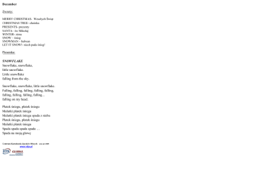 December Zwroty: MERRY CHRISTMAS- Wesołych Świąt CHRISTMAS TREE- choinka PRESENTS- prezenty SANTA– św Mikołaj WINTER- zima SNOW – śnieg SNOWMAN – bałwan LET IT SNOW!- niech pada śnieg! Piosenka: SNOWFLAKE Snowflake, snowflake, little snowflake. Little snowflake falling from the sky. Snowflake, snowflake, little snowflake. Falling, falling, falling, falling, falling, falling, falling, falling, falling... falling on my head. Płatek śniegu, płatek śniegu Malutki płatek śniegu Malutki płatek śniegu spada z nieba Płatek śniegu, płatek śniegu Malutki płatek śniegu Spada spada spada spada … Spada na moją głowę Centrum Kształcenia Języków Obcych rok zał. 2005 www.ckjo.pl