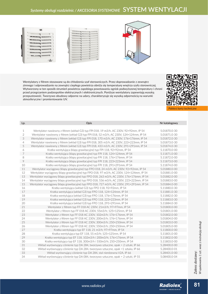 SYSTEM WENTYLACJI Systemy obsługi rozdzielnic / AKCESORIA SYSTEMOWE Wentylatory z filtrem stosowane są do chłodzenia szaf sterowniczych. Przez doprowadzanie z zewnątrz zimnego i odprowadzanie na zewnątrz ciepłego powietrza obniża się temperaturę wnętrza szafy sterowniczej. Wytworzony w ten sposób strumień powietrza zapobiega powstawaniu ognisk podwyższonej temperatury i chroni przed przegrzaniem podzespołów elektrycznych i elektronicznych. Poniższe wentylatory zapewniają wysoką przepustowość. Tworzywo obudowy odporne na udary, charakteryzuje się wysoką odpornością na warunki atmosferyczne i promieniowanie UV. Opis Nr katalogowy 1 2 3 4 5 6 7 8 9 10 11 12 13 14 15 16 17 18 19 20 21 22 23 24 25 26 27 28 29 30 31 32 33 34 Wentylator nawiewny z filtrem (wkład G3) typ FPI 018, 19 m3/h, AC 230V, 92×92mm, IP 54 Wentylator nawiewny z filtrem (wkład G3) typ FPI 018, 52 m3/h, AC 230V, 124×124mm, IP 54 Wentylator nawiewny z filtrem (wkład G3) typ FPI 018, 170 m3/h, AC 230V, 176×176mm, IP 54 Wentylator nawiewny z filtrem (wkład G3) typ FPI 018, 305 m3/h, AC 230V, 223×223mm, IP 54 Wentylator nawiewny z filtrem (wkład G3) typ FPI 018, 433 m3/h, AC 230V, 291×291mm, IP 54 Kratka wentylująca (klapy grawitacyjne) typ FPI 118, 92×92mm, IP 54 Kratka wentylująca (klapy grawitacyjne) typ FPI 118, 124×124mm, IP 54 Kratka wentylująca (klapy grawitacyjne) typ FPI 118, 176×176mm, IP 54 Kratka wentylująca (klapy grawitacyjne) typ FPI 118, 223×223mm, IP 54 Kratka wentylująca (klapy grawitacyjne) typ FPI 118, 291×291mm, IP 54 Wentylator wyciągowy (klapy grawitacyjne) typ FPO 018, 24 m3/h, AC 230V, 92×92mm, IP 54 Wentylator wyciągowy (klapy grawitacyjne) typ FPO 018, 97 m3/h, AC 230V, 124×124mm, IP 54 Wentylator wyciągowy (klapy grawitacyjne) typ FPO 018, 263 m3/h, AC 230V, 176×176mm, IP 54 Wentylator wyciągowy (klapy grawitacyjne) typ FPO 018, 536 m3/h, AC 230V, 223×223mm, IP 54 Wentylator wyciągowy (klapy grawitacyjne) typ FPO 018, 727 m3/h, AC 230V, 291×291mm, IP 54 Kratka wentylująca (wkład G3) typ FPO 118, 92×92mm, IP 54 Kratka wentylująca (wkład G3) typ FPO 118, 124×124mm, IP 54 Kratka wentylująca (wkład G3) typ FPO 118, 176×176mm, IP 54 Kratka wentylująca (wkład G3) typ FPO 118, 223×223mm, IP 54 Kratka wentylująca (wkład G3) typ FPO 118, 291×291mm, IP 54 Wentylator z filtrem typ FF 018 AC 230V, 21m3/h; 97×97mm, IP 54 Wentylator z filtrem typ FF 018 AC 230V, 55m3/h; 125×125mm, IP 54 Wentylator z filtrem typ FF 018 AC 230V, 102m3/h; 176×176mm, IP 54 Wentylator z filtrem typ FF 018 AC 230V, 200m3/h; 176×176mm, IP 54 Wentylator z filtrem typ FF 018 AC 230V, 300m3/h; 250×250mm, IP 54 Wentylator z filtrem typ FF 018 AC 230V, 550m3/h; 250×250mm, IP 54 Kratka wentylująca typ EF 118, 21 m3/h; 97×97mm, IP 54 Kratka wentylująca typ EF 118, 55 m3/h; 125×125mm, IP 54 Kratka wentylująca typ EF 118, 102m3/h i 200m3/h; 176×176mm, IP 54 Kratka wentylująca typ EF 118, 300m3/h i 550m3/h; 250×250mm, IP 54 Wkład wyrównujący ciśnienie typ DA 284, tworzywo sztuczne, opak = 2 sztuki, IP 66 Wkład wyrównujący ciśnienie typ DA 284, tworzywo sztuczne, opak =1 sztuka, IP 66 Wkład wyrównujący ciśnienie typ DA 284, stal nierdzewna V2A, IP 66 Wkład wyrównujący ciśnienie typ DA 084, tworzywo sztuczne, opak = 2 sztuki, IP 55 5.01870.0-30 5.01871.0-30 5.01872.0-30 5.01873.0-30 5.01874.0-30 5.11870.0-00 5.11871.0-00 5.11872.0-00 5.11873.0-00 5.11874.0-00 5.01880.0-00 5.01881.0-00 5.01882.0-00 5.01883.0-00 5.01884.0-00 5.11880.0-30 5.11881.0-30 5.11882.0-30 5.11883.0-30 5.11884.0-30 5.01800.0-00 5.01801.0-00 5.01802.0-00 5.01804.0-00 5.01803.0-00 5.01805.0-00 5.11800.0-00 5.11801.0-00 5.11802.0-00 5.11803.0-00 5.28400.0-00 5.28400.0-01 5.28401.0-00 5.08400.0-04 www.radiolex.pl W opakowaniu 1 szt. wraz z instrukcją obsługi Lp. Zakres dostawy: Pobierz karty techniczne 81