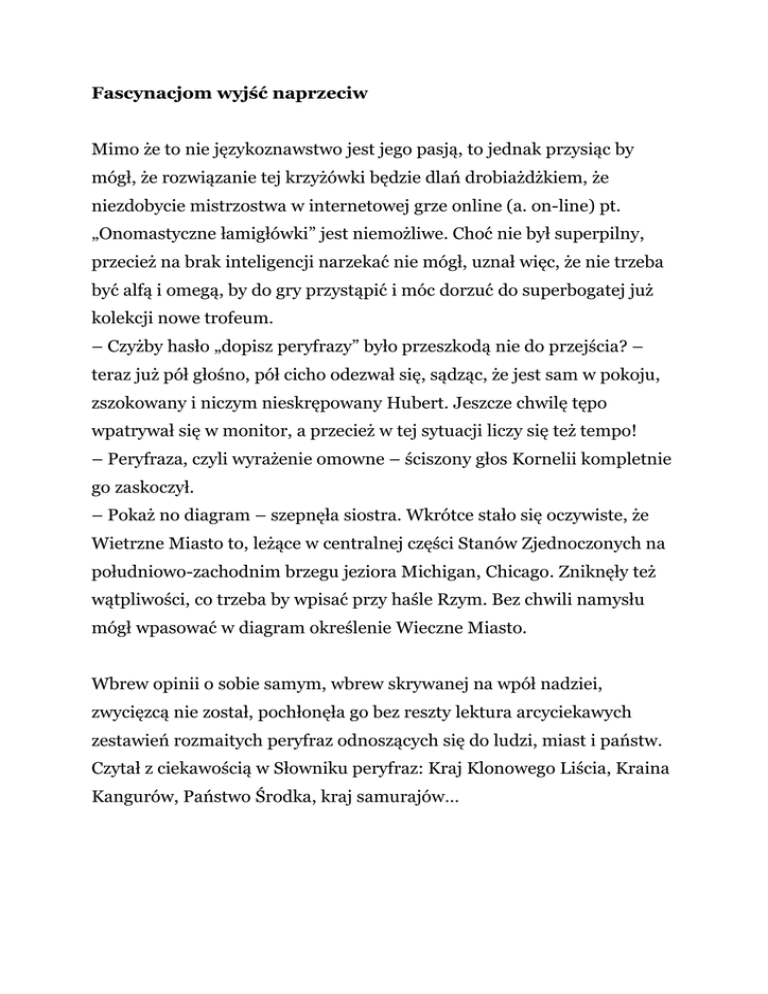 Fascynacjom wyjść naprzeciw Mimo że to nie językoznawstwo jest jego pasją, to jednak przysiąc by mógł, że rozwiązanie tej krzyżówki będzie dlań drobiażdżkiem, że niezdobycie mistrzostwa w internetowej grze online (a. on-line) pt. „Onomastyczne łamigłówki” jest niemożliwe. Choć nie był superpilny, przecież na brak inteligencji narzekać nie mógł, uznał więc, że nie trzeba być alfą i omegą, by do gry przystąpić i móc dorzuć do superbogatej już kolekcji nowe trofeum. – Czyżby hasło „dopisz peryfrazy” było przeszkodą nie do przejścia? – teraz już pół głośno, pół cicho odezwał się, sądząc, że jest sam w pokoju, zszokowany i niczym nieskrępowany Hubert. Jeszcze chwilę tępo wpatrywał się w monitor, a przecież w tej sytuacji liczy się też tempo! – Peryfraza, czyli wyrażenie omowne – ściszony głos Kornelii kompletnie go zaskoczył. – Pokaż no diagram – szepnęła siostra. Wkrótce stało się oczywiste, że Wietrzne Miasto to, leżące w centralnej części Stanów Zjednoczonych na południowo-zachodnim brzegu jeziora Michigan, Chicago. Zniknęły też wątpliwości, co trzeba by wpisać przy haśle Rzym. Bez chwili namysłu mógł wpasować w diagram określenie Wieczne Miasto. Wbrew opinii o sobie samym, wbrew skrywanej na wpół nadziei, zwycięzcą nie został, pochłonęła go bez reszty lektura arcyciekawych zestawień rozmaitych peryfraz odnoszących się do ludzi, miast i państw. Czytał z ciekawością w Słowniku peryfraz: Kraj Klonowego Liścia, Kraina Kangurów, Państwo Środka, kraj samurajów…