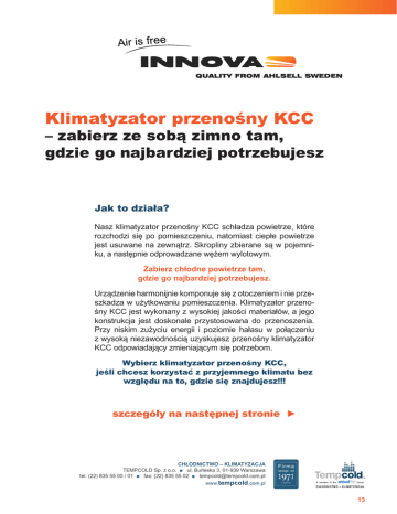 Klimatyzator przenośny KCC – zabierz ze sobą zimno tam, gdzie go najbardziej potrzebujesz Jak to działa? Nasz klimatyzator przenośny KCC schładza powietrze, które rozchodzi się po pomieszczeniu, natomiast ciepłe powietrze jest usuwane na zewnątrz. Skropliny zbierane są w pojemniku, a następnie odprowadzane wężem wylotowym. Zabierz chłodne powietrze tam, gdzie go najbardziej potrzebujesz. Urządzenie harmonijnie komponuje się z otoczeniem i nie przeszkadza w użytkowaniu pomieszczenia. Klimatyzator przenośny KCC jest wykonany z wysokiej jakości materiałów, a jego konstrukcja jest doskonale przystosowana do przenoszenia. Przy niskim zużyciu energii i poziomie hałasu w połączeniu z wysoką niezawodnością uzyskujesz przenośny klimatyzator KCC odpowiadający zmieniającym się potrzebom. Wybierz klimatyzator przenośny KCC, jeśli chcesz korzystać z przyjemnego klimatu bez względu na to, gdzie się znajdujesz!!! szczegóły na następnej stronie ► CHŁODNICTWO – KLIMATYZACJA TEMPCOLD Sp. z o.o. ■ ul. Burleska 3, 01-939 Warszawa tel. (22) 835 55 00 / 01 ■ fax: (22) 835 55 02 ■ [email protected] www.tempcold.com.pl Firma 1971 istnieje od roku 13 Klimatyzator przenośny KCC-3512 AJ Prosty i skuteczny sposób na szybki komfort w upalne dni. Klimatyzator przenośny KCC jest przeznaczony specjalnie dla małych pomieszczeń biurowych, sypialni lub domków letniskowych. Nie wymaga specjalnej instalacji, a jedynie zwykłego gniazdka sieciowego i niewielkiego otworu w ścianie. Wysoka jakość KCC oznacza, że możesz zawsze liczyć na komfortową temperaturę ‒ gdziekolwiek jesteś! KLIMATYZATOR KCC-3512AJ Moc chłodnicza Przepływ powietrza m /h 3 DANE TECHNICZNE 3,5 360/320/280 Klasa wydajności energetycznej Pobór mocy (W) Pobór prądu chłodzenie (A maks.) KCC-3512AJ A 1350 6,9 Poziom hałasu w db(A) 55/53/51 Zasilanie (V/faz/Hz) 230/1/50 230/1/50 Czynnik chłodniczy/ilość (g) Wymiary szer./wys./głęb. (mm) R410A/980 775x375x442 Waga (kg) Zalecana wielkość pomieszczenia (m ) 2 CENA: Firma 1971 istnieje od roku 14 40 16-25 1750 PLN CHŁODNICTWO – KLIMATYZACJA TEMPCOLD Sp. z o.o. ■ ul. Burleska 3, 01-939 Warszawa tel. (22) 835 55 00 / 01 ■ fax: (22) 835 55 02 ■ [email protected] www.tempcold.com.pl Klimatyzator przenośny KCC-2709 AI Prosty i skuteczny sposób na szybki komfort w upalne dni. Klimatyzator przenośny KCC jest przeznaczony specjalnie dla małych pomieszczeń biurowych, sypialni lub domków letniskowych. Nie wymaga specjalnej instalacji, a jedynie zwykłego gniazdka sieciowego i niewielkiego otworu w ścianie. Wysoka jakość KCC oznacza, że możesz zawsze liczyć na komfortową temperaturę ‒ gdziekolwiek jesteś! KLIMATYZATOR KCC-2709AI DANE TECHNICZNE Moc chłodnicza 2,7 Przepływ powietrza m /h 230/200/180 3 Klasa wydajności energetycznej A Pobór mocy (W) 1010 Pobór prądu chłodzenie (A maks.) 6,4 Poziom hałasu w db(A) 56/54/52 Zasilanie (V/faz/Hz) 230/1/50 230/1/50 Czynnik chłodniczy/ilość (g) KCC-2709AI R410A/570 Wymiary szer./wys./głęb. (mm) 780x340x394 Waga (kg) 27 Zalecana wielkość pomieszczenia (m ) 10-16 2 CENA: CHŁODNICTWO – KLIMATYZACJA TEMPCOLD Sp. z o.o. ■ ul. Burleska 3, 01-939 Warszawa tel. (22) 835 55 00 / 01 ■ fax: (22) 835 55 02 ■ [email protected] www.tempcold.com.pl 1350 PLN Firma 1971 istnieje od roku 15