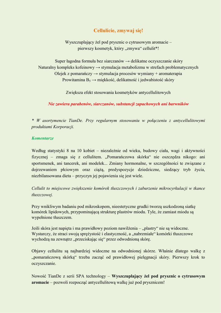 Cellulicie, zmywaj się! Wyszczuplający żel pod prysznic o cytrusowym aromacie – pierwszy kosmetyk, który „zmywa“ cellulit*! Super łagodna formuła bez siarczanów → delikatne oczyszczanie skóry Naturalny kompleks kofeinowy → stymulacja metabolizmu w strefach problematycznych Olejek z pomarańczy → stymulacja procesów wymiany + aromaterapia Prowitamina B5 → miękkość, delikatność i jedwabistość skóry Zwiększa efekt stosowania kosmetyków antycellulitowych Nie zawiera parabenów, siarczanów, substancji zapachowych ani barwników * W asortymencie TianDe. Przy regularnym stosowaniu w połączeniu z antycellulitowymi produktami Korporacji. Komentarze Według statystyki 8 na 10 kobiet – niezależnie od wieku, budowy ciała, wagi i aktywności fizycznej – zmaga się z cellulitem. „Pomarańczowa skórka“ nie oszczędza nikogo: ani sportsmenek, ani tancerek, ani modelek... Zmiany hormonalne, w szczególności te związane z dojrzewaniem płciowym oraz ciążą, predyspozycje dziedziczne, siedzący tryb życia, niezbilansowana dieta – przyczyn jej pojawienia się jest wiele. Cellulit to miejscowe zwiększenie komórek tłuszczowych i zaburzenie mikrocyrkulacji w tkance tłuszczowej. Przy wnikliwym badaniu pod mikroskopem, nieestetyczne grudki tworzą uszkodzoną siatkę komórek lipidowych, przypominającą strukturę plastrów miodu. Tyle, że zamiast miodu są wypełnione tłuszczem. Jeśli skóra jest napięta i ma prawidłowy poziom nawilżenia – „plastry“ nie są widoczne. Wystarczy, że straci swoją sprężystość i elastyczność, a „nabrzmiałe“ komórki tłuszczowe wychodzą na zewnątrz „przeciskając się“ przez odwodnioną skórę. Objawy cellulitu są najbardziej widoczne na odwodnionej skórze. Właśnie dlatego walkę z „pomarańczową skórką“ trzeba zacząć od prawidłowej pielęgnacji skóry. Pierwszy krok to oczyszczanie. Nowość TianDe z serii SPA technology – Wyszczuplający żel pod prysznic o cytrusowym aromacie – pozwoli rozpocząć antycellulitową walkę już pod prysznicem! Z czym i jak walczymy? Agresywne oczyszczanie. Stosowanie kosmetyków na bazie „twardych“ składników myjących prowadzi do naruszenia ochronnej bariery lipidowej skóry, jej wysuszenia i utraty sprężystości. SUPER ŁAGODNA FORMUŁA ŻELU WYSZCZUPLAJĄCEGO BEZ SIARCZANÓW, PARABENÓW I SUBSTANCJI ZAPACHOWYCH delikatnie oczyszcza skórę z zanieczyszczeń i sprawia, że staje się ona miękka, delikatna i jedwabista w dotyku. Utrata napięcia i sprężystości skóry. Na ten proces wpływa cały szereg czynników: wiek i związane z nim zmniejszenie grubości płaszcza hydrolipidowego skóry, zmniejszenie produkcji sebum, utrata wody i łamliwość włókien kolagenowych, negatywne oddziaływanie czynników zewnętrznych... NATURALNY KOMPLEKS KOFEINOWY żelu wyszczuplającego z wyciągami z kawy kongijskiej, zielonej herbaty, guarany i orzechów koli ma DZIAŁANIE NAPINAJĄCE na skórę. Kofeina stymuluje wymianę komórkową, w rezultacie czego zwiększa się napięcie skóry, staje się ona gładsza, bardziej sprężysta i wyrównana. OLEJEK ETERYCZNY Z POMARAŃCZY – w składzie wyszczuplającego żelu pod prysznic o cytrusowym aromacie – bierze udział w tworzeniu włókien kolagenowych, pomaga zachować sprężystość i elastyczność skóry. Stymuluje krążenie krwi, zwiększa metabolizm w strefach problematycznych, zwiększając EFEKT WYSZCZUPLAJĄCY produktu. PROWITAMINA В5 nawilża skórę i sprzyja jej regeneracji. Stres jest jedną z przyczyn pojawiania się cellulitu. Olejek eteryczny z pomarańczy w składzie żelu wyszczuplającego daje efekt AROMATERAPII. Wzmaga wydzielanie endorfin, a co za tym idzie – sprzyja poprawie nastroju. Cytrusowy aromat wypełniający łazienkę podczas kąpieli bądź pod prysznicem pomoże odprężyć się, usunąć zmęczenie oraz uczucie niepokoju. Nowość TianDe nie tylko delikatnie oczyści skórę z zanieczyszczeń, podaruje jej miękkość i jedwabistość w dotyku, ale również idealnie przygotuje ją do dalszych zabiegów antycellulitowych, znacznie zwiększając ich skuteczność. Wzmocnij skórę kofeiną Wyciąg z kawy kongijskiej + wyciąg z zielonej herbaty + wyciąg z nasion guarany + wyciąg z orzechów koli Kofeina działa jednocześnie w kilku kierunkach: napina skórę ma właściwości stymulujące ma działanie drenujące Komentarze Brazylijscy uczeni odkryli tajemnicę pięknych sylwetek mieszkanek Ameryki Łacińskiej, które słyną z idealnych kształtów. Są pewni, że wszystko to za sprawą kawy, którą gorące piękności aktywnie stosują w celach kosmetycznych, a dokładniej – za sprawą zawartej w niej kofeiny. Uczeni z Uniwersytetu w stanie Rio de Janeiro przeprowadzili badania: przez miesiąc 99 kobiet dwa razy dziennie nakładało krem zawierający kofeinę na okolice od talii do kolan. U ponad 80% kobiet zmniejszył się obwód środkowej części uda (w okolicy powyżej kolan), a u prawie 70% – obwód bioder. Kofeina nie tylko zmniejsza obwody – zwiększa także napięcie tkanek, pomagając zmniejszyć objawy cellulitu. Działa jednocześnie w kilku kierunkach: - DZIAŁANIE NAPINAJĄCE. Kofeina stymuluje wymianę komórkową, w rezultacie czego zwiększa się napięcie skóry, staje się ona gładsza, bardziej sprężysta i wyrównana; - WŁAŚCIWOŚCI STYMULUJĄCE. Kofeina przyspiesza procesy wymiany, usuwa toksyny oraz objawy zastojów w podskórnej tkance tłuszczowej; - EFEKT DRENAŻU. Kofeina usuwa nadmiar wody z tkanek, pomaga zmniejszyć obrzęki i sprawia, że nieestetyczne „wklęsłości” są mniej widoczne. Wyszczuplający żel pod prysznic o cytrusowym aromacie zawiera kompleks kofeinowy, pochodzący z czterech najbogatszych naturalnych źródeł kofeiny: wyciągu z kawy kongijskiej + wyciągu z zielonej herbaty + wyciągu z nasion guarany + wyciągu z orzechów koli Wyciąg z kawy kongijskiej (robusta) zawiera dwa raz