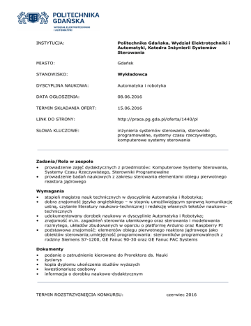 INSTYTUCJA: Politechnika Gdańska, Wydział Elektrotechniki i Automatyki, Katedra Inżynierii Systemów Sterowania MIASTO: Gdańsk STANOWISKO: Wykładowca DYSCYPLINA NAUKOWA: Automatyka i robotyka DATA OGŁOSZENIA: 08.06.2016 TERMIN SKŁADANIA OFERT: 15.06.2016 LINK DO STRONY: http://praca.pg.gda.pl/oferta/1440/pl SŁOWA KLUCZOWE: inżynieria systemów sterowania, sterowniki programowalne, systemy czasu rzeczywistego, komputerowe systemy sterowania Zadania/Rola w zespole • • prowadzenie zajęć dydaktycznych z przedmiotów: Komputerowe Systemy Sterowania, Systemy Czasu Rzeczywistego, Sterowniki Programowalne prowadzenie badań naukowych z zakresu sterowania elementami obiegu pierwotnego reaktora jądrowego Wymagania • • • • • stopień magistra nauk technicznych w dyscyplinie Automatyka i Robotyka; dobra znajomość języka angielskiego – w stopniu umożliwiającym sprawną komunikację ustną, czytanie literatury naukowo-technicznej i redakcję własnych tekstów naukowotechnicznych udokumentowany dorobek naukowy w dyscyplinie Automatyka i Robotyka; znajomość m.in. zagadnień sterownia ułamkowego oraz sterowania i modelowania rozmytego, układów zbudowanych w oparciu o platformę Arduino oraz Raspberry PI podstawowa znajomość: elementów obiegu pierwotnego reaktora jądrowego jako obiektów sterowania;umiejętność programowania: sterowników programowalnych z rodziny Siemens S7-1200, GE Fanuc 90-30 oraz GE Fanuc PAC Systems Dokumenty • • • • • podanie o zatrudnienie kierowane do Prorektora ds. Nauki życiorys kopia dyplomu ukończenia studiów wyższych kwestionariusz osobowy informacja o dorobku naukowo-dydaktycznym TERMIN ROZSTRZYGNIĘCIA KONKURSU: czerwiec 2016 PLANOWANY TERMIN ZATRUDNIENIA: 01.09.2016 Dokumenty przesłać na adres: Dziekan Wydziału Elektrotechniki i Automatyki, Politechnika Gdańska, ul. Narutowicza 11/12, 80-233 Gdańsk lub złożyć osobiście w pokoju 106 w budynku Wydziału Elektrotechniki i Automatyki Prosimy o umieszczenie klauzuli "Wyrażam zgodę na przetwarzanie danych osobowych zawartych w mojej ofercie dla potrzeb niezbędnych przy procesie rekrutacji (zgodnie z Ustawą z dnia 29.08.1997 o Ochronie Danych Osobowych Dz.Ust. nr 133 poz. 883)". Konkurs może zostać zamknięty bez wyłonienia kandydata. Skontaktujemy się z wybranymi osobami. Nadesłanych pocztą ofert nie odsyłamy. Zlecający zastrzegają sobie prawo do odpowiedzi jedynie na wybrane oferty.