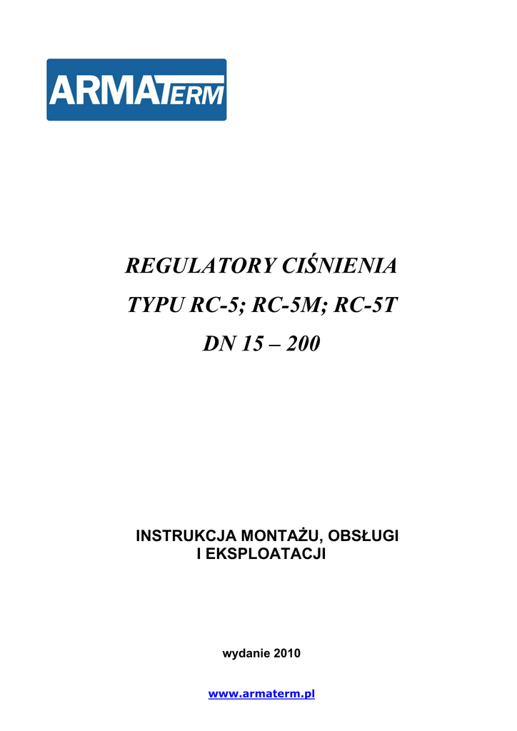 REGULATORY CIŚNIENIA TYPU RC-5; RC-5M; RC-5T DN 15 – 200 INSTRUKCJA MONTAŻU, OBSŁUGI I EKSPLOATACJI wydanie 2010 www.armaterm.pl SPIS TREŚCI 1. Zasada działania 2. Normalne warunki eksploatacji 3. Przechowywanie i transport 4. Instalowanie 5. Uruchamianie 6. Obsługa, konserwacja i naprawa 7. Warunki bezpieczeństwa użytkowania 8. Typowe niedomagania i sposoby ich usuwania 9. Likwidacja ( utylizacja ) wyrobu 10. Wykaz części zamiennych 11. Rysunki OZNACZENIE ............................................................................................... DN ............... PN (ANSI) ........... PS …....... bar PT .....….. bar TS …........... ºC Data próby ciśnieniowej .............................................. Materiał korpusu ......................................................................................... Kategoria .......... Grupa płynów ........ Przeznaczenie: do rurociągów Nr fabr./rok prod. .................................. Świadectwo nr ......................... Znak KJ .................................... Uwaga : Przed przystąpieniem do instalowania i użytkowania należy zapoznać się z niniejszą instrukcją . Instalacja regulatora musi być przeprowadzona przez wykwalifikowany i uprawniony personel i zakończona udokumentowanym odbiorem. __________________________________________________________________________________ 2 www.armaterm.pl RC-5; RC-5M; RC-5T 1. ZASADA DZIAŁANIA Energią napędową regulatora jest ciśnienie przepływającego czynnika. Zawór regulatora jest zamknięty w stanie normalnym, wzrost ciśnienia regulowanego powoduje otwieranie zaworu. Regulacja wartości ciśnienia przed zaworem regulatora realizowana jest przez liniowe przesunięcie grzyba zaworu sztywno połączonego z trzpieniem siłownika. Przesunięcie to jest proporcjonalne do wartości sygnału wejściowego do siłownika, jakim jest wartość ciśnienia regulowanego oraz napięcia sprężyny nastawnika. 2. NORMALNE WARUNKI EKSPLOATACJI ! Regulatory powinny być eksploatowane w warunkach ciśnienia, temperatury i rodzaju czynnika o parametrach zgodnych z przyjętymi do określenia wielkości oraz odmiany konstrukcyjnej i materiałowej regulatora. Dla zapewnienia bezawaryjności pracy w całym okresie eksploatacji, regulator należy chronić przed uderzeniami i uszkodzeniami oraz poddawać go systematycznej konserwacji i przeglądom okresowym. 3. PRZECHOWYWANIE I TRANSPORT ! Regulatory powinny być przechowywane w zamkniętych, suchych i przewiewnych pomieszczeniach magazynowych o wilgotności względnej nie przekraczającej 80%. Atmosfera pomieszczeń powinna być wolna od par i gazów agresywnych. Transport regulatorów może odbywać się dowolnymi krytymi środkami transportu w opakowaniach lub bez, z zabezpieczeniem przed rzucaniem, przewracaniem i nadmiernymi wstrząsami. 4. INSTALOWANIE ! Przed zamontowaniem regulatora do rurociągu należy starannie oczyścić rurociąg z zanieczyszczeń, odprysków metali, rdzy, zgorzeliny spawalniczej, tłuszczów i smarów oraz wszelkich innych ciał obcych. Nie przestrzeganie tych wymogów doprowadzi do drastycznego zmniejszenia trwałości regulatora, awaryjnej pracy i jego uszkodzenia. Regulator należy zamontować tak, aby kierunek przepływu czynnika roboczego w rurociągu był zgodny ze strzałką znajdującą się na korpusie regulatora. Ciśnienie robocze czynnika przepływającego przez regulator, powinno być zgodne z wartością przyjętą do ustalenia ciśnienia nominalnego, podanego na tabliczce firmowej regulatora. Regulator z filtrem siatkowym należy montować z zapewnieniem prostych odcinków przed i za regulatorem, równych minimum 5-krotnej średnicy nominalnej zaworu regulatora. W przypadku, gdy średnica nominalna regulatora jest mniejsza od średnicy rurociągu, należy stosować zwężki kształtowe o długości zgodnej z odpowiednimi normami. Regulatory zaleca się montować pionowo. Regulatory przeznaczone do regulacji ciśnienia pary o temperaturze przekraczającej 135ºC są wyposażone w zbiornik kondensacyjny, który powinien być zamontowany powyżej komory siłownika, do której jest doprowadzany impuls ciśnienia regulowanego. Punkt poboru ciśnienia regulowanego z rurociągu powinien być wyposażony w zawór odcinający umożliwiający łagodny rozruch regulatora oraz zamknięcie dopływu impulsu ciśnienia regulowanego. Dla zapewnienia poprawnej pracy regulatora niezbędne jest stosowanie przed regulatorem filtra FS-1. W pobliżu miejsca poboru impulsu ciśnienia regulowanego zaleca się zamontowanie ciśnieniomierza. Przy instalacji regulatora stosowanego do pary, przewodami impulsowymi 8x1 należy połączyć punkt poboru ciśnienia regulowanego w rurociągu ze zbiornikiem kondensacyjnym oraz zbiornik z komorą roboczą siłownika. Komorę roboczą siłownika, przewód impulsowy oraz zbiornik kondensacyjny do ⅔ objętości należy wypełnić wodą, nie dopuszczając do zapowietrzenia komory roboczej siłownika. Nie dotrzymanie tego warunku spowoduje uszkodzenie membrany siłownika. Przy instalacji regulatorów do innych mediów przewodem impulsowym należy połączyć punkt poboru ciśnienia regulowanego i komorę roboczą siłownika. __________________________________________________________________________________ 3 RC-5; RC-5M; RC-5T www.armaterm.pl 5. URUCHAMIANIE Przed ostatecznym uruchomieniem instalacji technologicznej, należy wstępnie sprawdzić działanie zmontowanego regulatora. W tym celu należy sprawdzić czy nastawa fabryczna wartości ciśnienia regulowanego jest zgodna z wymaganiami określonymi w zamówieniu. W przypadku potrzeby zmiany wartości nastawy należy poprzez jednoczesne pokręcanie nakrętkami regulacyjnymi ( 29 ) zmienić napięcie sprężyn – obserwując wskazania ciśnieniomierza. Zwiększanie napięcia sprężyn powoduje wzrost ciśnienia regulowanego, zmniejszanie – obniżanie. Podczas rozruchu technologicznego dopuszcza się lekkie dokr