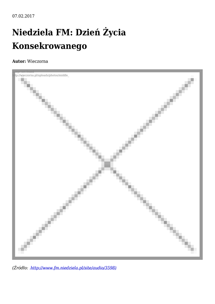 07.02.2017 Niedziela FM: Dzień Życia Konsekrowanego Autor: Wieczorna Image not found http://wieczorna.pl/uploads/photos/middle_ (Źródło: http://www.fm.niedziela.pl/site/audio/3598)