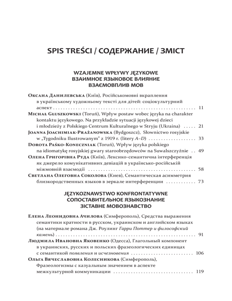 SPIS TREŚCI / СОДЕРЖАНИЕ / ЗМІСТ WZAJEMNE WPŁYWY JĘZYKOWE ВЗАИМНОЕ ЯЗЫКОВОЕ ВЛИЯНИЕ ВЗАЄМОВПЛИВ МОВ Оксана Данилевська (Київ), Російськомовні вкраплення в українському художньому тексті для дітей: соціокультурний аспект . . . . . . . . . . . . . . . . . . . . . . . . . . . . . . . . . . . . . . . . . . . . . . . . . . . . . . . . . Michał Głuszkowski (Toruń), Wpływ postaw wobec języka na charakter kontaktu językowego. Na przykładzie sytuacji językowej dzieci i młodzieży z Polskiego Centrum Kulturalnego w Stryju (Ukraina) . . . . . Joanna Joachimiak-Prażanowska (Bydgoszcz), Słownictwo rosyjskie w „Tygodniku Ilustrowanym” z 1919 r. (litery A–D) . . . . . . . . . . . . . . . . . . . Dorota Paśko-Koneczniak (Toruń), Wpływ języka polskiego na idiomatykę rosyjskiej gwary staroobrzędowców na Suwalszczyźnie . . Олена Григорівна Руда (Київ), Лексико-семантична інтерференція як джерело комунікативних девіацій в українсько-російській міжмовній взаємодії . . . . . . . . . . . . . . . . . . . . . . . . . . . . . . . . . . . . . . . . . . . Светлана Олеговна Соколова (Киев), Семантическая асимметрия близкородственных языков в зеркале интерференции . . . . . . . . . . . . 11 21 33 49 58 73 JĘZYKOZNAWSTWO KONFRONTATYWNE СОПОСТАВИТЕЛЬНОЕ ЯЗЫКОЗНАНИЕ ЗІСТАВНЕ МОВОЗНАВСТВО Елена Леонидовна Ачилова (Симферополь), Средства выражения семантики кратности в русском, украинском и английском языках (на материале романа Дж. Роулинг Гарри Поттер и философский камень) . . . . . . . . . . . . . . . . . . . . . . . . . . . . . . . . . . . . . . . . . . . . . . . . . . . . . . . . 91 Людмила Ивановна Яковенко (Одесса), Глагольный компонент в украинских, русских и польских фразеологических единицах с семантикой появления и исчезновения . . . . . . . . . . . . . . . . . . . . . . . . . 106 Ольга Вячеславовна Колесникова (Симферополь), Фразеологизмы с казуальным значением в аспекте межкультурной коммуникации . . . . . . . . . . . . . . . . . . . . . . . . . . . . . . . . 119 SPIS TREŚCI / СОДЕРЖАНИЕ / ЗМІСТ Луиза Александровна Петрова (Одесса), Бинарные оппозиции в семной структуре глагольного слова . . . . . . . . . . . . . . . . . . . . . . . . . . 125 Елена Эдуардовна Пчелинцева (Черкассы), Аспектуальные признаки в русских, польских и украинских отглагольных именах действия . . . . . . . . . . . . . . . . . . . . . . . . . . . . . . . . . . . . . . . . . . . . . . . . . . . . . 135 Елена Яковлевна Титаренко (Симферополь), Фазовая парадигматика глаголов в славянских языках . . . . . . . . . . . . . . . . . . . 151 RADZIECKIE WERSJE JĘZYKÓW NARODOWYCH СОВЕТСКИЕ ВЕРСИИ НАЦИОНАЛЬНЫХ ЯЗЫКОВ РАДЯНСЬКІ ВАРІАНТИ НАЦІОНАЛЬНИХ МОВ Tamara Graczykowska (Bydgoszcz), Rusycyzmy leksykalne w moskiewskim tygodniku „Trybuna Radziecka” wydawanym w dwudziestoleciu międzywojennym (litery E–F) . . . . . . . . . . . . . . . . . . . Maria Jankowiak-Rutkowska (Bydgoszcz), O indoktrynacji dzieci Niemców rosyjskich (na podstawie dwóch radzieckich elementarzy niemieckich z końca lat 30. XX w.) . . . . . . . . . . . . . . . . . . . . . . . . . . . . . . . . Jolanta Mędelska (Bydgoszcz), Исследовательский проект: Советизация языка российских немцев в 20-е и 30-е гг. ХХ в. . . . . . . . Katharina Neufeld (Detmold) Коллекции Музея истории и культуры российских немцев как источник исследования . . . . . . Michał Sobczak (Bydgoszcz), Wybrane problemy przekładu skrótowców (na podstawie rosyjsko-niemieckiego słownika A. F. Nesslera) . . . . . . . . 169 183 196 207 211 ONOMASTYKA / ОНОМАСТИКА / ОНОМАСТИКА Henryk Duszyński (Bydgoszcz), Nazwiska odimienne członków Parafii Prawosławnej św. Mikołaja we Włocławku (lata 1906–1910) . . . . Лариса Петровна Казанская, Диляра Камильевна Лопарева (Тольятти), Топонимическая картина славянского мира: лексико-прагматический и этнокультурный аспекты (на примере ойконимов Самарской области) . . . . . . . . . . . . . . . . . . . . Teresa Pluskota (Bydgoszcz), Dwuczłonowe imiona słowiańskie w nazwach miejscowych Ukrainy i pogranicza polsko-ukraińskiego w XIX w. (na podstawie Atlasu historycznego ziem ruskich Rzeczypospolitej A. Jabłonowskiego) . . . . . . . . . . . . . . . . . . . . . . . . . . . . . . Piotr Tomasik (Bydgoszcz), O polskich i rosyjskich nazwach stacji kolejowych. Rekonesans badawczy . . . . . . . . . . . . . . . . . . . . . . . . . . . . . . . . 227 235 249 264 SPIS TREŚCI / СОДЕРЖАНИЕ / ЗМІСТ JĘZYK I KULTURA / ЯЗЫК И КУЛЬТУРА / МОВА І КУЛЬТУРА Hali