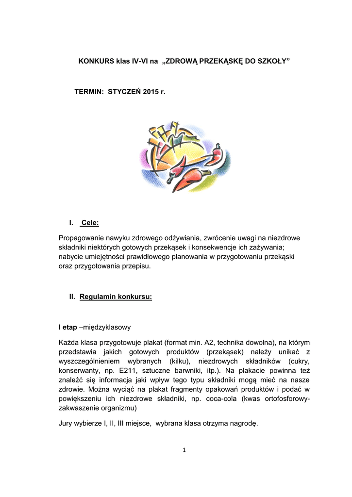 KONKURS klas IV-VI na „ZDROWĄ PRZEKĄSKĘ DO SZKOŁY” TERMIN: STYCZEŃ 2015 r. I. Cele: Propagowanie nawyku zdrowego odżywiania, zwrócenie uwagi na niezdrowe składniki niektórych gotowych przekąsek i konsekwencje ich zażywania; nabycie umiejętności prawidłowego planowania w przygotowaniu przekąski oraz przygotowania przepisu. II. Regulamin konkursu: I etap –międzyklasowy Każda klasa przygotowuje plakat (format min. A2, technika dowolna), na którym przedstawia jakich gotowych produktów (przekąsek) należy unikać z wyszczególnieniem wybranych (kilku), niezdrowych składników (cukry, konserwanty, np. E211, sztuczne barwniki, itp.). Na plakacie powinna też znaleźć się informacja jaki wpływ tego typu składniki mogą mieć na nasze zdrowie. Można wyciąć na plakat fragmenty opakowań produktów i podać w powiększeniu ich niezdrowe składniki, np. coca-cola (kwas ortofosforowyzakwaszenie organizmu) Jury wybierze I, II, III miejsce, wybrana klasa otrzyma nagrodę. 1 II etap – indywidualny Uczestnik przygotowuje w domu jedną, wybraną, zdrową przekąskę oraz własnoręcznie napisany przepis kulinarny swojej przekąski. Wymagania co do przekąski: przyniesiona w całości na talerzyku dla jury wraz z przepisem oraz dodatkowo przyniesienie min. 20 porcji do degustacji na odzielnym talerzu estetycznie wykonana, smaczna i przede wszystkim wykonana ze zdrowych składników. Wymagania co do przepisu: napisany własnoręcznie na kartce A4, może zawierać rysunki kulinarne powinien zawierać podstawowe elementy przepisu kulinarnego, czyli: - nazwa potrawy - lista składników - potrzebne przybory - kolejne czynności ( zapisując je, stosujemy czasowniki w tej samej formie gramatycznej, np.:gotuj, lub gotować) - koszt wykonania 4 porcji oraz czas potrzebny do wykonania tych porcji. Wymaga się przygotowania dla jury 4 porcji zdrowej przekąski, tzn. 4 x100 g lub 4x100 ml przekąski do zjedzenia/wypicia. Kryteria oceny przekąski wraz z przepisem: estetyka wykonania, bardzo dobry smak! Tendencja do unikania lub zastępowania składników niezdrowych, takich jak sól, cukier innymi zdrowymi elementami pożywienia, np. słodzenie owocami. poprawnie napisany przepis; nieskomplikowany, do wykonania przez każdego! 2 III. Przebieg konkursu I Etap Przedstawiciele klas przynoszą gotowe plakaty do nauczyciela w terminie do 13 stycznia Ogłoszenie wyników nastąpi 15 stycznia II Etap Do udziału w tym etapie należy zgłosić się do wychowacy w terminie do 13 stycznia. 15 stycznia, w holu szkolnym naprzeciwko pokoju nauczycielskiego, uczestnicy konkursu wystawią swoje przekąski (min. 20 porcji) na stolikach i odbędzie się degustacja dla klas IV-VI. Na stoliku powinna się też znajdować kopia napisanego przepisu do wglądu dla degustujących W tym dniu uczestnicy przynoszą przekąskę w całości na talerzyku lub w pudełku do jury konkursu. Do przekąski musi być dołączony przepis i musi ona być podpisana. Ogłoszenie wyników konkursu odbędzie się 16 stycznia. Przygotowała: Małgorzata Musztyfaga 3