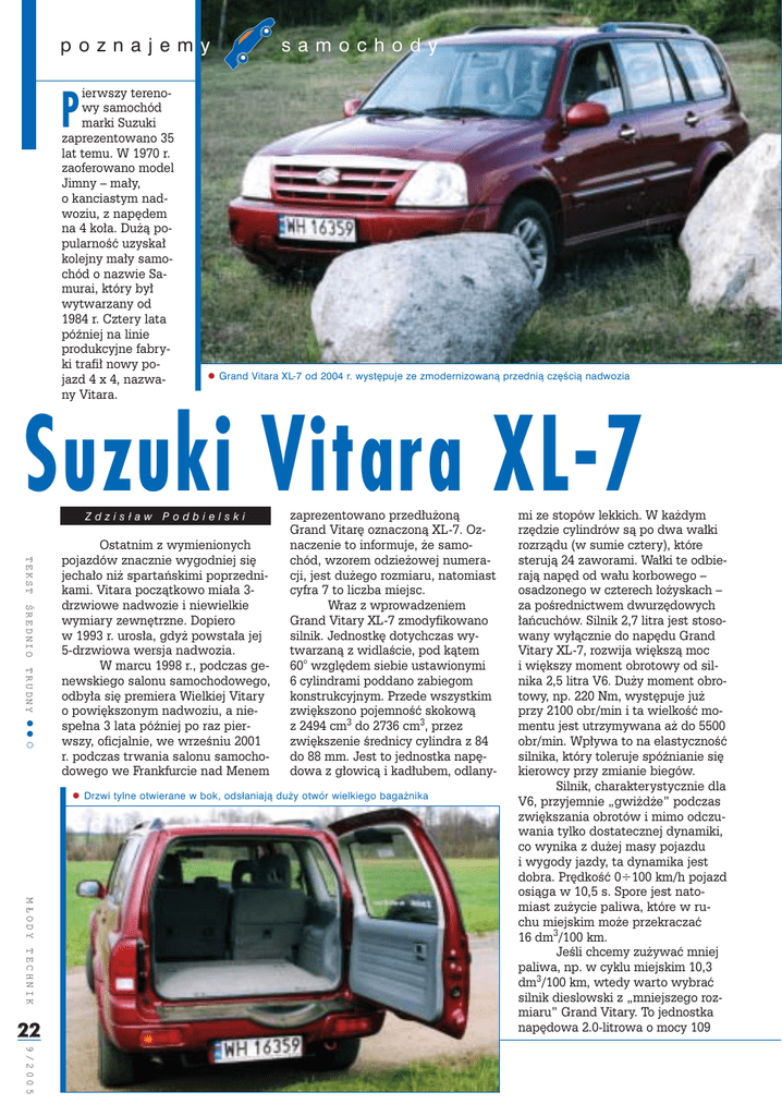 poznajemy samochody P ierwszy terenowy samochód marki Suzuki zaprezentowano 35 lat temu. W 1970 r. zaoferowano model Jimny – ma³y, o kanciastym nadwoziu, z napêdem na 4 ko³a. Du¿¹ popularnoœæ uzyska³ kolejny ma³y samochód o nazwie Samurai, który by³ wytwarzany od 1984 r. Cztery lata póŸniej na linie produkcyjne fabryki trafi³ nowy pojazd 4 x 4, nazwany Vitara. ! Grand Vitara XL-7 od 2004 r. występuje ze zmodernizowaną przednią częścią nadwozia Suzuki Vitara XL−7 Zdzisław Podbielski TEKST ŚREDNIO TRUDNY ! ! ! Ostatnim z wymienionych pojazdów znacznie wygodniej siê jecha³o ni¿ spartañskimi poprzednikami. Vitara pocz¹tkowo mia³a 3drzwiowe nadwozie i niewielkie wymiary zewnêtrzne. Dopiero w 1993 r. uros³a, gdy¿ powsta³a jej 5-drzwiowa wersja nadwozia. W marcu 1998 r., podczas genewskiego salonu samochodowego, odby³a siê premiera Wielkiej Vitary o powiêkszonym nadwoziu, a niespe³na 3 lata póŸniej po raz pierwszy, oficjalnie, we wrzeœniu 2001 r. podczas trwania salonu samochodowego we Frankfurcie nad Menem zaprezentowano przed³u¿on¹ Grand Vitarê oznaczon¹ XL-7. Oznaczenie to informuje, ¿e samochód, wzorem odzie¿owej numeracji, jest du¿ego rozmiaru, natomiast cyfra 7 to liczba miejsc. Wraz z wprowadzeniem Grand Vitary XL-7 zmodyfikowano silnik. Jednostkê dotychczas wytwarzan¹ z widlaœcie, pod k¹tem 60° wzglêdem siebie ustawionymi 6 cylindrami poddano zabiegom konstrukcyjnym. Przede wszystkim zwiêkszono pojemnoœæ skokow¹ z 2494 cm3 do 2736 cm3, przez zwiêkszenie œrednicy cylindra z 84 do 88 mm. Jest to jednostka napêdowa z g³owic¹ i kad³ubem, odlany- ! Drzwi tylne otwierane w bok, odsłaniają duży otwór wielkiego bagażnika M ŁODY TECHNIK 22 mi ze stopów lekkich. W ka¿dym rzêdzie cylindrów s¹ po dwa wa³ki rozrz¹du (w sumie cztery), które steruj¹ 24 zaworami. Wa³ki te odbieraj¹ napêd od wa³u korbowego – osadzonego w czterech ³o¿yskach – za poœrednictwem dwurzêdowych ³añcuchów. Silnik 2,7 litra jest stosowany wy³¹cznie do napêdu Grand Vitary XL-7, rozwija wiêksz¹ moc i wiêkszy moment obrotowy od silnika 2,5 litra V6. Du¿y moment obrotowy, np. 220 Nm, wystêpuje ju¿ przy 2100 obr/min i ta wielkoœæ momentu jest utrzymywana a¿ do 5500 obr/min. Wp³ywa to na elastycznoœæ silnika, który toleruje spóŸnianie siê kierowcy przy zmianie biegów. Silnik, charakterystycznie dla V6, przyjemnie „gwi¿d¿e” podczas zwiêkszania obrotów i mimo odczuwania tylko dostatecznej dynamiki, co wynika z du¿ej masy pojazdu i wygody jazdy, ta dynamika jest dobra. Prêdkoœæ 0÷100 km/h pojazd osi¹ga w 10,5 s. Spore jest natomiast zu¿ycie paliwa, które w ruchu miejskim mo¿e przekraczaæ 16 dm3/100 km. Jeœli chcemy zu¿ywaæ mniej paliwa, np. w cyklu miejskim 10,3 dm3/100 km, wtedy warto wybraæ silnik dieslowski z „mniejszego rozmiaru” Grand Vitary. To jednostka napêdowa 2.0-litrowa o mocy 109 9/2005 Luksusowa terenówka rozmiaru XL KM, pochodz¹ca z francuskiego koncernu PSA – Peugeot/Citroën, nowoczesna, z bezpoœrednim wtryskiem paliwa typu common-rail. Suzuki Grand Vitara i jej wyd³u¿ona odmiana XL-7 konstrukcyjnie znacznie ró¿ni¹ siê od konkurencyjnych pojazdów rekreacyjnoterenowych nazywanych SUV (Sport Utility Vehicles, co mo¿na t³umaczyæ jako sportowo-u¿ytkowe). Ze sportem maj¹ niewiele wspólnego, chyba ¿e rekreacyjne jazdy w terenie mo¿na uznaæ za wyczynowe. Wspomniane ró¿nice konstrukcyjne polegaj¹ na tym, ¿e SUV-y innych marek maj¹ dodatkowy napêd 4 x 4 za³¹czany automatycznie, bez udzia³u kierowcy. Wtedy, kiedy wyst¹pi poœlizg kó³ osi stale napêdzanej, najczêœciej przedniej. Takie rozwi¹zania s¹ np. Suzuki Grand Vitara XL-7 dane techniczne NADWOZIE: mocowane do ramy nośnej, 5-drzwiowe, 5÷7-miejscowe SILNIK: 4-suw. 6-cylindrowy widlasty, 24- o ok. 40 cm d³u¿sza od 5-drzwiowej Grand Vitary i ma o 320 mm wiêkszy rozstaw osi, pozosta³e wymiary zewnêtrzne obu odmian s¹ jednakowe. Ta zwiêkszona d³ugoœæ XL-7 pozwoli³a na zwiêkszenie miejsca u¿ytecznego w samochodzie. Wykorzystano je do zamontowania dwóch dodatkowych foteli, tworz¹c samochód 7-osobowy, a w wersji 5osobowej XL-7 ma du¿¹ objêtoœæ baga¿ow¹ – po z³o¿eniu dwóch czêœci oparæ tylnej kanapy objêtoœæ ta (mierzona do dachu) wynosi a¿ 2065 dm3. W samochodzie jest te¿ du¿o schowków na podrêczne przedmioty i uchwytów na pojemniki z napojami – razem mo¿na siê doliczyæ a¿ 15 schowków i uchwytów. W tym s¹ schowki pod pod³og¹ baga¿nika i szuflada pod fotelem pasa¿era przedniego. W XL-7 jedzie siê wygodnie, przednie fotele s¹ dobrze ukszta³towane, równie¿ wygodne s¹ siedzenia drugiego rzêdu z ustawieniem wzd³u¿nie regulowanym i na nich siedz¹cy pasa¿erowie maj¹ du¿o miejsca na nogi. Mniej wygodnie, ze wzglêdu na wy¿sz¹ pod³ogê, maj¹ pasa¿erowie trzeciego rzêdu w wersji 7-osobowej pojazdu. Kierowca siedzi wygodnie, wysoko, ma dobr¹ widocznoœæ przez szyby i w du¿ych lusterkach zewnêtrznych. Urz¹dzenia sterowania dzia³aj¹ precyzyjnie, ale przy du¿ych prêdkoœciach jazdy odczuwa siê zbyt du¿¹ si³ê wspomagania kierownicy. Trzeba jednak pamiêtaæ, ¿e prowadzimy doœæ du¿y pojazd, o du¿ym rozstawie osi i w przypadku znacznych wypuk³oœci nierównego terenu mo¿emy zawisn¹æ na podwoziu. ! F o t . a u t o r, r y s . S u z u k i 23 9/2005 15,3/9,3/11,5 dm3/100 km w Hondach: CR-V i HR-V oraz Toyocie Rav 4 wyposa¿onej w sprzêg³o lepkoœciowe przekazuj¹ce moment napêdowy zale¿nie od wyst¹pienia poœlizgu kó³. W Suzuki natomiast jest inaczej, stale napêdzane s¹ ko³a tylne i o tym, czy do³¹czyæ napêd kó³ osi przedniej, decyduje kierowca. Do dyspozycji ma, umieszczon¹ obok dŸwigni zmiany biegów, dodatkow¹ dŸwigniê, któr¹ mo¿e ustawiæ w kilku po³o¿eniach: 2H (napêd tylny), 4H (napêd na 4 ko³a) i 4L (w³¹czony reduktor), po³o¿enie N (neutralne, luz). W przypadku przesuniêcia dŸwigni z poz