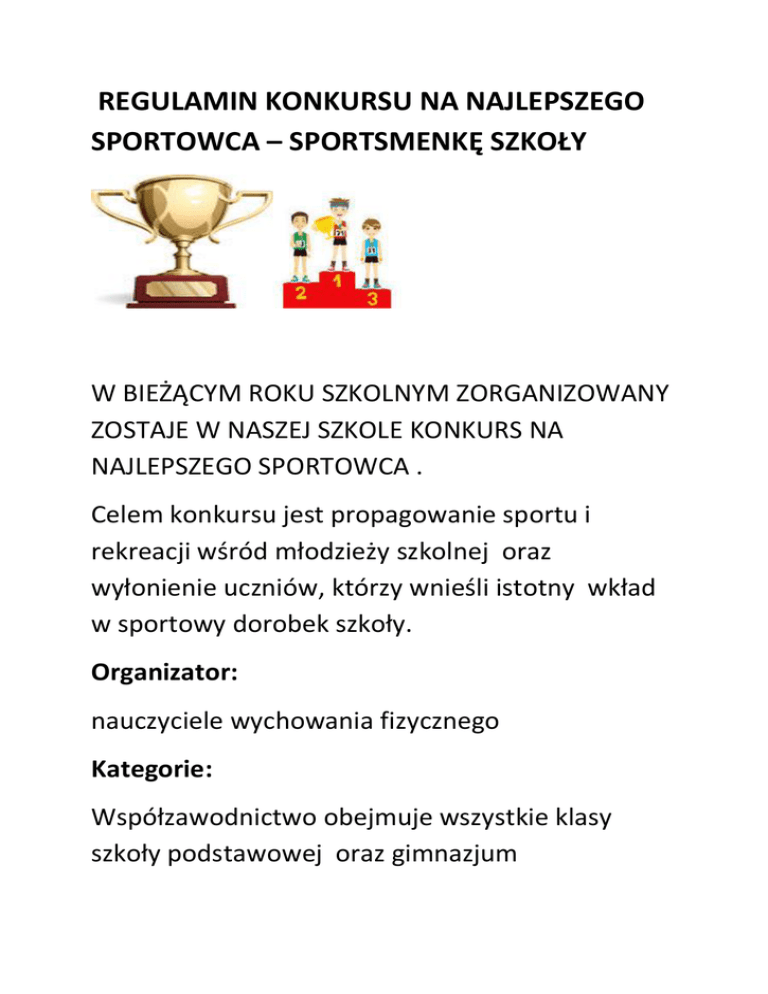 REGULAMIN KONKURSU NA NAJLEPSZEGO SPORTOWCA – SPORTSMENKĘ SZKOŁY W BIEŻĄCYM ROKU SZKOLNYM ZORGANIZOWANY ZOSTAJE W NASZEJ SZKOLE KONKURS NA NAJLEPSZEGO SPORTOWCA . Celem konkursu jest propagowanie sportu i rekreacji wśród młodzieży szkolnej oraz wyłonienie uczniów, którzy wnieśli istotny wkład w sportowy dorobek szkoły. Organizator: nauczyciele wychowania fizycznego Kategorie: Współzawodnictwo obejmuje wszystkie klasy szkoły podstawowej oraz gimnazjum Termin : Konkurs przeprowadzony będzie od października do czerwca. Podsumowanie wyników i wręczenie nagród podczas Dnia Sportu Szkolnego Punktacji podlegają: • Udział w zajęciach rekreacyjno – sportowych w szkole (min. 50 % obecności) – 10 pkt • Pomoc w organizacji imprez sportowych (każdorazowo) – 5 pkt • Udokumentowane członkostwo w pozaszkolnych klubach sportowych -10 pkt • Udział w zawodach sportowych( punktowane miejsca I- IV, w grach zespołowych punkty otrzymuje każdy zawodnik drużyny) • Punkty za oceny z zachowania - wzorowe – 20pkt - bardzo dobre -15pkt - dobre -10 pkt - poprawne -5 pkt 1.Zawody szkolne Udział 1 pkt 1 miejsce 6 pkt 2 miejsce 4 pkt 3 miejsce 3 pkt 4 miejsce 2 pkt 2. Zawody gminne Udział 2 pkt 1 miejsce 10 pkt 2 miejsce 8 pkt 3 miejsce 7 pkt 4 miejsce 6 pkt 3. Zawody powiatowe Udział 3pkt 1 miejsce 15 2 miejsce 13 3 miejsce 10 4 miejsce 8 4. Zawody rejonowe Udział 4 pkt 1 miejsce 20 pkt 2 miejsce 15 pkt 3 miejsce 12 pkt 4 miejsce 10 pkt 5. Zawody wojewódzkie Udział 8 pkt 1 miejsce 30 pkt 2 miejsce 25 pkt 3 miejsce 22 pkt • Ustanowienie rekordu szkoły – 20 pkt Zawody ogólnopolskie – udział – 30 pkt Zawody ogólnopolskie – miejsce na podium – 50 pkt Punktacja prowadzona jest oddzielnie w kategorii dziewcząt i chłopców, osobno dla szkoły podstawowej, osobno dla gimnazjum O tytule „Sportowca szkoły” i „Sportsmenki szkoły” decyduje suma punktów zdobytych wciągu roku szkolnego. W przypadku jednakowej liczby punktów, lub innych uzasadnionych przez nauczycieli wychowania fizycznego okoliczności Rada pedagogiczna może wybrać odpowiednio dwie „Sportsmenki szkoły” i dwóch „Sportowców szkoły”. „Sportsmenka szkoły” i „Sportowiec szkoły” otrzymują statuetkę za osiągnięcia sportowe Pozostała czwórka otrzymuje dyplomy Rodzice uczniów otrzymują list gratulacyjny. Uczeń nie otrzymuje punktów za udział w zawodach jeśli w czasie ich trwania zachował się w sposób naruszający dobre imię szkoły, drużyny lub naruszył inne ogólnie przyjęte normy poprawnego zachowania. Za szczególnie rażące, niegodne zachowanie uczeń może być całkowicie usunięty z konkursu ( decyzję podejmuje opiekun SKS w porozumieniu z innymi nauczycielami wychowania fizycznego). Ranking najlepszych sportowców ZSS będzie przedstawiany i na bieżąco aktualizowany na stronie internetowej szkoły oraz w gablocie informacyjnej w holu