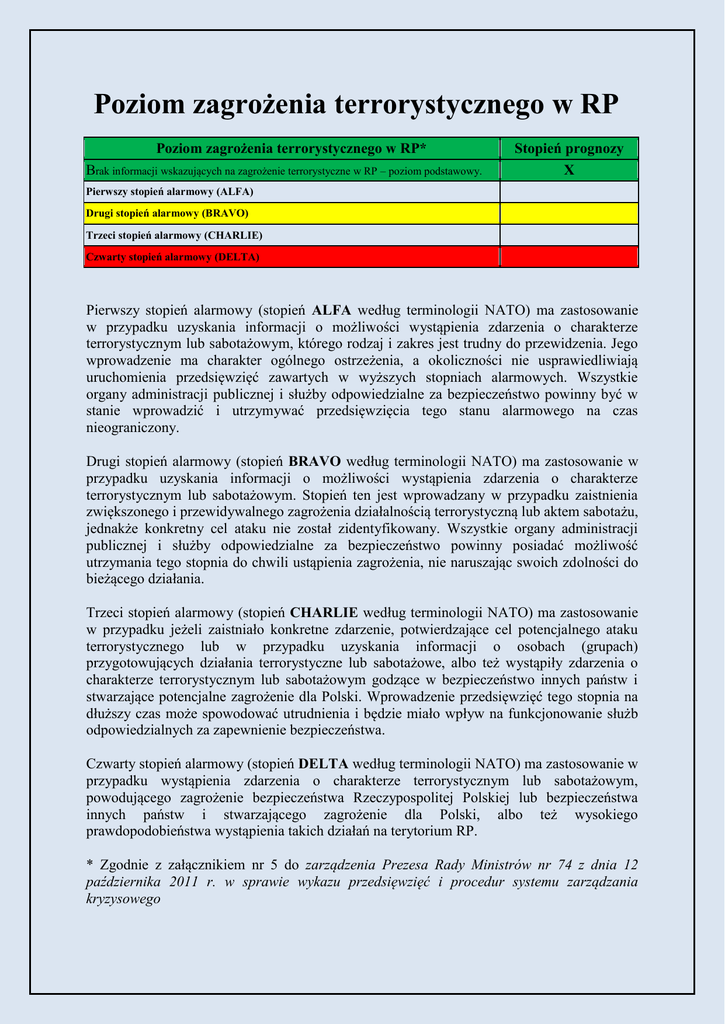 Poziom zagrożenia terrorystycznego w RP Poziom zagrożenia terrorystycznego w RP* Brak informacji wskazujących na zagrożenie terrorystyczne w RP – poziom podstawowy. Stopień prognozy X Pierwszy stopień alarmowy (ALFA) Drugi stopień alarmowy (BRAVO) Trzeci stopień alarmowy (CHARLIE) Czwarty stopień alarmowy (DELTA) Pierwszy stopień alarmowy (stopień ALFA według terminologii NATO) ma zastosowanie w przypadku uzyskania informacji o możliwości wystąpienia zdarzenia o charakterze terrorystycznym lub sabotażowym, którego rodzaj i zakres jest trudny do przewidzenia. Jego wprowadzenie ma charakter ogólnego ostrzeżenia, a okoliczności nie usprawiedliwiają uruchomienia przedsięwzięć zawartych w wyższych stopniach alarmowych. Wszystkie organy administracji publicznej i służby odpowiedzialne za bezpieczeństwo powinny być w stanie wprowadzić i utrzymywać przedsięwzięcia tego stanu alarmowego na czas nieograniczony. Drugi stopień alarmowy (stopień BRAVO według terminologii NATO) ma zastosowanie w przypadku uzyskania informacji o możliwości wystąpienia zdarzenia o charakterze terrorystycznym lub sabotażowym. Stopień ten jest wprowadzany w przypadku zaistnienia zwiększonego i przewidywalnego zagrożenia działalnością terrorystyczną lub aktem sabotażu, jednakże konkretny cel ataku nie został zidentyfikowany. Wszystkie organy administracji publicznej i służby odpowiedzialne za bezpieczeństwo powinny posiadać możliwość utrzymania tego stopnia do chwili ustąpienia zagrożenia, nie naruszając swoich zdolności do bieżącego działania. Trzeci stopień alarmowy (stopień CHARLIE według terminologii NATO) ma zastosowanie w przypadku jeżeli zaistniało konkretne zdarzenie, potwierdzające cel potencjalnego ataku terrorystycznego lub w przypadku uzyskania informacji o osobach (grupach) przygotowujących działania terrorystyczne lub sabotażowe, albo też wystąpiły zdarzenia o charakterze terrorystycznym lub sabotażowym godzące w bezpieczeństwo innych państw i stwarzające potencjalne zagrożenie dla Polski. Wprowadzenie przedsięwzięć tego stopnia na dłuższy czas może spowodować utrudnienia i będzie miało wpływ na funkcjonowanie służb odpowiedzialnych za zapewnienie bezpieczeństwa. Czwarty stopień alarmowy (stopień DELTA według terminologii NATO) ma zastosowanie w przypadku wystąpienia zdarzenia o charakterze terrorystycznym lub sabotażowym, powodującego zagrożenie bezpieczeństwa Rzeczypospolitej Polskiej lub bezpieczeństwa innych państw i stwarzającego zagrożenie dla Polski, albo też wysokiego prawdopodobieństwa wystąpienia takich działań na terytorium RP. * Zgodnie z załącznikiem nr 5 do zarządzenia Prezesa Rady Ministrów nr 74 z dnia 12 października 2011 r. w sprawie wykazu przedsięwzięć i procedur systemu zarządzania kryzysowego