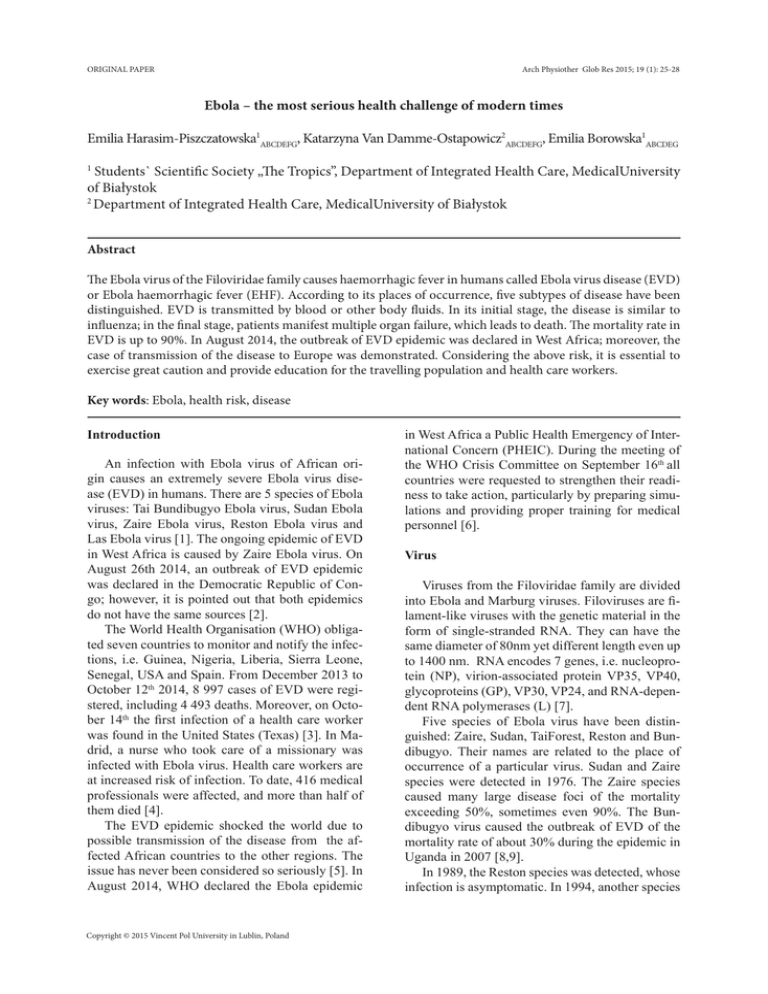 ORIGINAL PAPER Arch Physiother Glob Res 2015; 19 (1): 25-28 Ebola – the most serious health challenge of modern times Emilia Harasim-Piszczatowska1ABCDEFG, Katarzyna Van Damme-Ostapowicz2ABCDEFG, Emilia Borowska1ABCDEG Students` Scientific Society „The Tropics”, Department of Integrated Health Care, MedicalUniversity of Białystok 2 Department of Integrated Health Care, MedicalUniversity of Białystok 1 Abstract The Ebola virus of the Filoviridae family causes haemorrhagic fever in humans called Ebola virus disease (EVD) or Ebola haemorrhagic fever (EHF). According to its places of occurrence, five subtypes of disease have been distinguished. EVD is transmitted by blood or other body fluids. In its initial stage, the disease is similar to influenza; in the final stage, patients manifest multiple organ failure, which leads to death. The mortality rate in EVD is up to 90%. In August 2014, the outbreak of EVD epidemic was declared in West Africa; moreover, the case of transmission of the disease to Europe was demonstrated. Considering the above risk, it is essential to exercise great caution and provide education for the travelling population and health care workers. Key words: Ebola, health risk, disease Introduction An infection with Ebola virus of African origin causes an extremely severe Ebola virus disease (EVD) in humans. There are 5 species of Ebola viruses: Tai Bundibugyo Ebola virus, Sudan Ebola virus, Zaire Ebola virus, Reston Ebola virus and Las Ebola virus [1]. The ongoing epidemic of EVD in West Africa is caused by Zaire Ebola virus. On August 26th 2014, an outbreak of EVD epidemic was declared in the Democratic Republic of Congo; however, it is pointed out that both epidemics do not have the same sources [2]. The World Health Organisation (WHO) obligated seven countries to monitor and notify the infections, i.e. Guinea, Nigeria, Liberia, Sierra Leone, Senegal, USA and Spain. From December 2013 to October 12th 2014, 8 997 cases of EVD were registered, including 4 493 deaths. Moreover, on October 14th the first infection of a health care worker was found in the United States (Texas) [3]. In Madrid, a nurse who took care of a missionary was infected with Ebola virus. Health care workers are at increased risk of infection. To date, 416 medical professionals were affected, and more than half of them died [4]. The EVD epidemic shocked the world due to possible transmission of the disease from the affected African countries to the other regions. The issue has never been considered so seriously [5]. In August 2014, WHO declared the Ebola epidemic Copyright © 2015 Vincent Pol University in Lublin, Poland in West Africa a Public Health Emergency of International Concern (PHEIC). During the meeting of the WHO Crisis Committee on September 16th all countries were requested to strengthen their readiness to take action, particularly by preparing simulations and providing proper training for medical personnel [6]. Virus Viruses from the Filoviridae family are divided into Ebola and Marburg viruses. Filoviruses are filament-like viruses with the genetic material in the form of single-stranded RNA. They can have the same diameter of 80nm yet different length even up to 1400 nm. RNA encodes 7 genes, i.e. nucleoprotein (NP), virion-associated protein VP35, VP40, glycoproteins (GP), VP30, VP24, and RNA-dependent RNA polymerases (L) [7]. Five species of Ebola virus have been distinguished: Zaire, Sudan, TaiForest, Reston and Bundibugyo. Their names are related to the place of occurrence of a particular virus. Sudan and Zaire species were detected in 1976. The Zaire species caused many large disease foci of the mortality exceeding 50%, sometimes even 90%. The Bundibugyo virus caused the outbreak of EVD of the mortality rate of about 30% during the epidemic in Uganda in 2007 [8,9]. In 1989, the Reston species was detected, whose infection is asymptomatic. In 1994, another species 26 Harasim-Piszczatowska Emilia, Van Damme-Ostapowicz Katarzyna, Borowska Emilia from the Ivory Coast was identified, called TaiForest. The Bundibugyo Ebola was detected as the last one in 2007; beside Sudan and Zaire strains, this virus is responsible for EVD [7,8]. The TaїForest virus was indentified in one individual as a factor causing EVD [10]. The Sudan virus is characterized by the 50% mortality. The virus was the cause of high mortality due to EVD during two epidemics of 1970 and one epidemic of 2004 inSudan as well as one epidemic of 2000 in Uganda [11,12]. Pathogenesis There are several routes of Ebola transmission in humans. Infections can develop through direct contact with blood or various body fluids of affected individuals. The virus is present in blood, urine, secretions of sexual organs and sweat. Its presence has been demonstrated in sperm even 7 weeks after successful treatment of EVD [13]. The Ebola virus invades the human body through mucous membranes and is distributed in the skin or parenterally. The virus infects many types of cells, including monocytes, macrophages, fibroblasts, endothelial and epithelial cells, etc. The initial replication occurs in macrophages, monocytes and dendritic cells, through which the virus passes to the internal organs, e.g. the liver, spleen and lymph nodes [14,15]. The infected cells release various inflammatory cytokines, e.g. macrophage inflammatory protein (MIP)-α, MIP-β, or TNF-α, whose high level leads to vascular leak as it increases the endothelial permeability [16]. The cellular immune response is reduced [17]. The dendritic cells attacked by the virus do not produce the antigen for T lymphocytes and do not induce the inflammatory response. Mediated by VP35 and VP24, the virus interacts with INF-γ, which is capable of stimulating macrophages to secrete neopterin. Neopterin reduces the cellular immune response. Its high level evidences a high risk of death [18]. Moreover, researchers claim that some undefined virus-host interaction plays an important 