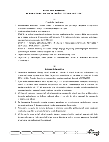 REGULAMIN KONKURSU WOLNA SCENA – UCHODROM. GDYŃSKI FESTIWAL MUZYCZNY. §1 Przedmiot Konkursu 1. Przedmiotem Konkursu Wolna Scena – Uchodrom jest promocja zespołów muzycznych z Województwa Pomorskiego, które nie wydały jeszcze płyty. 2. Konkurs odbędzie się w trzech etapach: ETAP I – z pośród nadesłanych zgłoszeń komisja selekcyjna wyłoni zespoły, które zaprezentują się w czasie jednego z 4 koncertów półfinałowych. Tryb naboru do I etapu konkursu jest ciągły, zgłoszenia moŜna nadsyłać do 07.06.2009. ETAP II – 4 koncerty półfinałowe, które odbędą się w następujących terminach: 15.04.2009 / 06.05.2009 / 27.05.2009 / 17.06.2009. ETAP III – koncert finałowy, w czasie którego zagrają zwycięzcy poszczególnych koncertów półfinałowych. Koncert finałowy odbędzie się w czerwcu. 3. Organizatorem konkursu są Fundacja Ucho oraz Klub Muzyczny Ucho. 4. Organizatorzy zastrzegają sobie prawo do wprowadzania zmian w terminach koncertów półfinałowych. §2 Zgłoszenie i przebieg 1. Uczestnicy Konkursu, chcący wziąć udział w I etapie II edycji Konkursu, zobowiązani są dostarczyć swoje zgłoszenie do Biura Organizatora osobiście lub na adres pocztowy ul. 3 maja 27/31, 81-364 Gdynia. Koperta ze zgłoszeniem powinna zawierać dopisek UCHODROM. 2. Zgłoszenie powinno składać się z wypełnionego oraz podpisanego przez osobę reprezentującą zespół formularza oraz materiału muzycznego na płycie zawierającego do 3 utworów nie trwających dłuŜej niŜ 15'. W przypadku gdy którykolwiek członek zespołu jest niepełnoletni do zgłoszenia naleŜy załączyć zgodę opiekuna na udział w konkursie. 3. W II edycji konkursu mogą wziąć udział uczestnicy poprzedniej edycji, jedynie z wykluczeniem laureata; zobowiązani są jednak nadesłać utwory inne niŜ, te które załączyli do zgłoszenia w poprzedniej edycji. 4. Do koncertów finałowych zespoły zostaną wyłonione po przesłuchaniu nadesłanych nagrań demonstracyjnych. O dopuszczeniu do Konkursu zdecyduje Organizator. 5. Przypisanie zespołu do terminu jednego z czterech koncertów półfinałowych oraz kolejność występów zespołów w ramach koncertu ustala Organizator. 6. W Konkursie mogą wziąć udział zespoły, których program będzie zawierał przynajmniej dwie kompozycje własne i nie więcej niŜ dwa covery. Oceniany będzie poziom wykonania i wartość artystyczna przygotowanych kompozycji. 7. Czas trwania prezentacji konkursowej nie moŜe przekroczyć 25' i nie moŜe być krótszy niŜ 15'. 8. O zakwalifikowaniu się do udziału w Konkursie zespoły zostaną zawiadomione do 7 dni przed planowaną datą koncertu półfinałowego. 9. Organizatorzy zapewniają zespołom backline, natomiast stopę, blachy oraz klawisze zespoły zabezpieczają we własnym zakresie. 10. Organizatorzy nie pokrywają kosztów przejazdu oraz pobytu uczestników. §3 Wybór zwycięzcy i nagroda 1. Prezentacje konkursowe oceniane będą przez jury powołane przez Organizatora, w którego skład wejdą trójmiejscy artyści oraz dziennikarze. Jury wyłoni zwycięskie zespoły w drodze głosowania, o którego wyniku zdecyduje zwykła większość głosów. 2. Jury zastrzega sobie prawo do wyboru, spośród wszystkich zespołów odrzuconych na poziomie koncertów półfinałowych, dodatkowego zespołu, który zagra w finale. 3. Finał II edycji konkursu odbędzie się czerwcu. 4. Laureaci poszczególnych spotkań półfinałowych zobowiązani są do udziału w koncercie finałowym. 5. Nagrody 5.1. Nagrodą główną w konkursie jest wydanie EP-ki. 5.2. Organizator moŜe powoływać i przyznawać inne dodatkowe nagrody pozaregulaminowe. §4 Nagroda publiczności 1. W czasie kaŜdego z 4 koncertów półfinałowych publiczność moŜe głosować na swojego faworyta. Głos będzie oddawany na aktualnym bilecie wstępu na dany koncert półfinałowy; głosujący obowiązany jest opatrzyć go swoim imieniem i nazwiskiem oraz numerem telefonu, a takŜe nazwą zespołu, na który głosuje. Na dany zespół moŜna głosować tylko w dniu koncertu półfinałowego, do którego został przypisany i w ramach, którego zagrał. 2. Wyniki głosowania będą publikowane na stronie internetowej Klubu Ucho w terminie 3 dni od daty koncertu, kiedy miało miejsce głosowanie. 3. Głosy publiczności po zakończeniu wszystkich koncertów półfinałowych zostaną zliczone i zespół, który zyska ich największą ilość, przejdzie do finału jako faworyt publiczności. 4. Faworyt wyłoniony przez publiczność zagra w czasie koncertu finałowego na tych samych prawach co zespoły wyłonione przez jury w czasie półfinałów. 5. W czasie koncertu finałowego publiczność będzie mogła głosować na swojego faworyta. Wyłoniony tą drogą zespół zyska nagrodę publiczności. Głos będzie oddawany na aktualnym bilecie wstępu na dany koncert półfinałowy; głosujący obowiązany jest opatrzyć go swoim imieniem i nazwiskiem oraz numerem telefonu, a takŜe nazwą zespołu, na który głosuje. §5 Postanowienia końcowe 1. Zgłoszenie do Konkursu jest równoznaczne ze zgodą na bezpłatną rejestrację i emisję występów konkursowych. Wykonawcy uczestniczący w konkursie przenoszą na Organizatora prawo do rozporządzania i korzystania ze wszystkich zarejestrowanych w trakcie koncertów konkursowych materiałów, w całości i we fragmentach, na następujących polach eksploatacji: a) utrwalenia dowolną technika audialną; b) zwielokrotniania dla celów dokumentacyjnych i nadawczych; c) rozpowszechnianie w. w. wykonań za pośrednictwem mediów internetowych d) rozpowszechnianie w. w. wykonań za pośrednictwem mediów patronackich (w tym rozgłośni radiowych oraz TV). 2. Przesłanie zgłoszenia jest jednoznaczne z akceptacją tego regulaminu. 3. Organizator zastrzega sobie prawo do zmian w regulaminie.