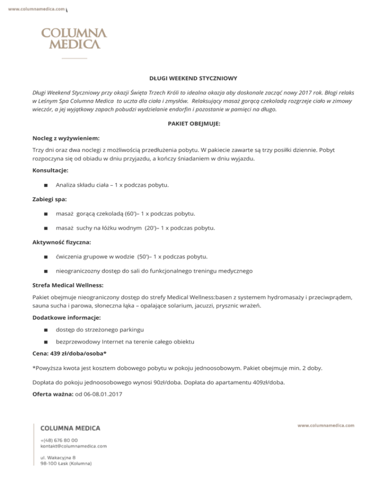 DŁUGI WEEKEND STYCZNIOWY Długi Weekend Styczniowy przy okazji Święta Trzech Króli to idealna okazja aby doskonale zacząć nowy 2017 rok. Błogi relaks w Leśnym Spa Columna Medica to uczta dla ciała i zmysłów. Relaksujący masaż gorącą czekoladą rozgrzeje ciało w zimowy wieczór, a jej wyjątkowy zapach pobudzi wydzielanie endorfin i pozostanie w pamięci na długo. PAKIET OBEJMUJE: Nocleg z wyżywieniem: Trzy dni oraz dwa noclegi z możliwością przedłużenia pobytu. W pakiecie zawarte są trzy posiłki dziennie. Pobyt rozpoczyna się od obiadu w dniu przyjazdu, a kończy śniadaniem w dniu wyjazdu. Konsultacje: Analiza składu ciała – 1 x podczas pobytu. Zabiegi spa: masaż gorącą czekoladą (60')– 1 x podczas pobytu. masaż suchy na łóżku wodnym (20')– 1 x podczas pobytu. Aktywność fizyczna: ćwiczenia grupowe w wodzie (50')– 1 x podczas pobytu. nieograniczozny dostęp do sali do funkcjonalnego treningu medycznego Strefa Medical Wellness: Pakiet obejmuje nieograniczony dostęp do strefy Medical Wellness:basen z systemem hydromasaży i przeciwprądem, sauna sucha i parowa, słoneczna łąka – opalające solarium, jacuzzi, prysznic wrażeń. Dodatkowe informacje: dostęp do strzeżonego parkingu bezprzewodowy Internet na terenie całego obiektu Cena: 439 zł/doba/osoba* *Powyższa kwota jest kosztem dobowego pobytu w pokoju jednoosobowym. Pakiet obejmuje min. 2 doby. Dopłata do pokoju jednoosobowego wynosi 90zł/doba. Dopłata do apartamentu 409zł/doba. Oferta ważna: od 06-08.01.2017 NASZE REKOMENDACJE: W sezonie zimowym polecamy szczególnie: masaż gorącymi stemplami ziołowymi - Wykonywany przy użyciu stempli wypełnionych aromatycznymi ziołami, owocami i przyprawami. Zabieg opiera się na trzech efektach: termicznym, zapachowym oraz na bezpośrednim działaniu na skórę substancji aktywnych zawartych w składnikach stempli. W celu zarezerwowania dodatkowych zabiegów, nie objętych ofertą, uprzejmie prosimy o wcześniejszy kontakt telefoniczny w celu zaaranżowania terminu. REGULAMIN: Niewykorzystanie któregokolwiek elementu wchodzącego w skład pakietu nie powoduje zmniejszenia jego wartości. Dopuszcza się zamianę zabiegu lub pakietu zabiegów na inny zabieg lub zabiegi będące w ofercie Columna Medica, wyłącznie z udokumentowanych przyczyn zdrowotnych Pacjenta. Konsultacje specjalistyczne nie mogą być zamienione na inne konsultacje lub zabiegi.