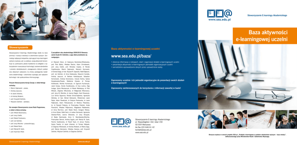 Stowarzyszenie E-learningu Akademickiego Baza aktywności e-learningowej uczelni Stowarzyszenie Baza aktywności e-learningowej uczelni Stowarzyszenie E-learningu Akademickiego działa na rzecz Z początkiem roku akademickiego 2009/2010 Stowarzy promocji i rozwoju e-edukacji w szkolnictwie wyższym. Gro- szenie liczyło 81 Członków, a jego skład przedstawia się madząc najlepszych ekspertów, zajmujących się e-learningiem zarówno naukowo, jak i w praktyce, swoją aktywność koncentruje na: podnoszeniu jakości kształcenia na odległość z wy- następująco: dr Wojciech Bizon, dr Katarzyna Bocheńska-Włostowska, prof. Piotr Bołtuć, Wiesław Bracha, Adam Chmielewski, korzystaniem nowoczesnych technologii, budowie standardów prof. Jerzy Cieślik, prof. Mirosław Czapka, dr Renata i procedur akredytacyjnych, propagowaniu dobrych praktyk Czaplikowska, Marcin Dąbrowski, Wojciech Dymowski, oraz aktywnym wpływaniu na zmiany paradygmatu kształ- dr Dorota Dżega, dr hab. Ryszard R. Gajewski, Rafał Głębocki, cenia akademickiego i szkolnictwa wyższego pod wpływem prof. Jan Goliński, dr Anna Grabowska, Sławomir Gurdała, technologii i idei społeczeństwa informacyjnego. Pracami Stowarzyszenia kieruje Zarząd, w skład którego wchodzą: Komorowski, Andrzej Kononowicz, Urszula Kontny, Sylwia Kossakowska-Pisarek, Waldemar Krawiec, dr Tomasz Królikowski, Monika Kucharczyk, dr Zygmunt Kucharczyk, Jacek Kulasa, Dorota Kwiatkowska, dr Ewa Lubina, Olga Łodyga, Sylvia Maciaszczyk, dr Marek Małolepszy, dr Piotr •• Andrzej Jaszczuk, Mikosik, Zbigniew Mikurenda, dr Małgorzata Miranowicz, •• dr Jacek Urbaniec, prof. Jerzy M. Mischke, dr Joanna Nogieć, Karol Nowaczyk, •• prof. Krzysztof Zieliński, •• Wojciech Zieliński – sekretarz. ••zbiorcza informacja o rodzajach, skali i organizacji działań e-learningowych uczelni ••prezentacje aktywności e-learningowych jednostek organizacyjnych uczelni ••samodzielne wprowadzanie danych przez upoważnione osoby Andrzej Jaszczuk, dr Barbara Kołodziejczak, Sebastian •• Marcin Dąbrowski – prezes, •• dr Andrzej Wodecki, www.sea.edu.pl/baza/ Zapraszamy uczelnie i ich jednostki organizacyjne do prezentacji swoich działań e-learningowych! Zapraszamy zainteresowanych do korzystania z informacji zawartej w bazie! Luis Ochoa Siguencia, Renata Ochoa-Dąderska, Agnieszka Oklińska, dr hab. Michał Ostrowicki, Włodzimierz Jacek Papla, Adam Pawełczak, dr Grażyna Penkowska, dr Jacek Piątkowski, Adam Pietrzykowski, dr Marlena Plebańska, ks. dr Ryszard Podpora, dr Przemysław Polański, Aneta Na rozwojem Stowarzyszenia czuwa Rada Programowa, Powroźnik, Wiesław Półjanowicz, Magdalena Ratalewska, w skład w której wchodzą: dr Anna Ren-Kurc, prof. Marek Rocki, Grzegorz Rokosz, •• prof. Witold Abramowicz, dr Anna Rybak, Rafał Siech, dr Lesław Sieniawski, Agnieszka •• prof. Jerzy Cieślik, Sitarska-Piwko, Joanna Sitkowska, dr Jerzy Skrzypek, •• prof. Marek Frankowicz, •• prof. Jan Goliński, •• prof. Jerzy Mischke – przewodniczący, dr Beata Stachowiak, Anna K. Stanisławska-Mischke, Przemysław Stencel, Andrzej Syguła, prof. Maciej M. Sysło, Paulina Szadkowska, dr Paweł Topol, dr Janusz Trawka, Sylwia Twardo, dr Jacek Urbaniec, dr Tomasz Walasek, •• prof. Marek Rocki, dr Zbigniew Wiśniewski, dr Andrzej Wodecki, dr Maria Zając, •• prof. Maciej M. Sysło, prof. Maciej Zakrzewicz, Wiesław Zawisza, prof. Krzysztof •• prof. Kazimierz Wiatr. Zieliński, Wojciech Zieliński, dr Zbigniew Zieliński. Stowarzyszenie E-learningu Akademickiego www.sea.edu.pl Stowarzyszenie E-learningu Akademickiego al. Niepodległości 162, lokal 150 02-554 Warszawa tel./fax (22) 646 61 42 [email protected] www.sea.edu.pl Broszura wydana w ramach projektu SEA pt. „Praktyki e-learningowe w polskim szkolnictwie wyższym – baza wiedzy”, dofinansowanego przez Ministerstwo Nauki i Szkolnictwa Wyższego. Cel utworzenia bazy E-edukacja jest obecna w polskim szkolnictwie wyższym już od lat dziewięćdziesiątych ubiegłego wieku, co przejawiało się głównie poprzez realizację projektów e-learningowych o różnej skali. Decyzja Ministerstwa, zezwalająca na włączanie do dydaktyki akademickiej metod i technik kształcenia na odległość, a także możliwość finansowania rozwoju e-edukacji ze środków unijnych zwiększyły to zainteresowanie. Na przestrzeni ostatnich lat pojawiły się więc kolejne przedsięwzięcia, przy czym zakres i sposób wdrażania e-edukacji w poszczególnych uczelniach są bardzo różne. Wiedza o praktykach e-learningowych polskich szkół wyższych pochodzi przede wszystkim z publikacji i wystąpień konferencyjnych. Brakuje pełnej, usystematyzowanej i powszechnie dostępnej informacji na temat skali i form aktywności uczelni w zakresie e-edukacji. Dostrzegając tę lukę, Stowarzyszenie E-learningu Akademickiego (SEA) przystąpiło do realizacji projektu utworzenia bazy aktywności e-learningowej polskich uczelni. Celem tego działania jest: •• gromadzenie i udostępnianie informacji o działaniach e-learningowych podejmowanych przez polskie uczelnie, •• opracowywanie raportów i analiz dotyczących e-edukacji w polskim szkolnictwie wyższym, •• popularyzacja kształcenia z wykorzystaniem nowoczesnych technologii informacyjnych. Zdaniem SEA skodyfikowanie działań uczelni w zakresie e-learningu oraz utworzenie na tej podstawie bazy informacyjnej pozwoli odpowiedzieć na pytania o: •• miejsce e-edukacji w realizacji strategii i planów dydaktycznych uczelni, •• e-edukacyjny kapitał intelektualny uczelni (know-how, elektroniczne materiały dydaktyczne, wirtualne środowiska nauczania, struktury organizacyjne), •• wykorzystanie e-edukacji do realizacji celów kształcenia, w tym przede wszystkim nabywania przez studentów kompetencji społeczeństwa informacyjnego, •• stan przygotowania kadry do stosowania nowoczesnych form dydakt
