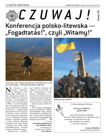 12 GAZETA HARCERSKA Czuwaj! Numer 143 KURIER WILEŃSKI • Piątek, 25 października 2013 r. Konferencja polsko-litewska — „Fogadtatás!”, czyli „Witamy!” Uczestnicy mieli okazję przewędrować 45-kilometrową trasę przez piękne góry — dawną granicą polsko-węgierską N a Ukrainie w miasteczku Mukačevo na Zakarpaciu, 10-13 października, odbyła się kolejna konferencja polsko-węgierska. Odbyła się ona już po raz piąty, a przypomnijmy, że ostatnia była zorganizowana w Wilnie w marcu ubiegłego roku. Na konferencji była wymiana doświadczeń pomiędzy skautowymi organizacjami mniejszościowymi i integracja. Ta impreza zrzesza przedstawicieli organizacji węgierskich z Czech, Rumunii, Ukrainy, Słowacji; organizacji polskich z Litwy, Ukrainy, Białorusi; uczestniczył też skaut duński z Niemiec. Jak widać, kwiat wielokulturowości i wielojęzyczności rozkwitł na całego! Wyjątkowym aspektem tego właśnie spotkania był podział na dwa szczeble. Jeden - instruktorski, w czasie którego dyskutowano i rozwiązywano problemy. Podczas drugiego uczestnicy mieli okazję przewędrować 45-kilometrową trasę przez piękne góry — dawną granicą polsko-węgierską. Prócz bagażu doświadczeń trzech reprezentantów ZHPnL, przećwiczyliśmy także umiejętności językowe, poznaliśmy kulturę i realia innych mniejszości narodowych. I osiągnęliśmy (dosłownie!) nowe szczyty... Czuwaj! pwd Sabina Maksimowicz wędr 10WDH „Silva” dh komisarz ds. zagranicznych ZHPnL Fot. archiwum Kolejny szczyt za ZHPnL! Z okazji pięknego Jubileuszu 10-lecia 26 WDH-ek „Białe Wilki” życzę Wam Kochane Druhenki, aby życie Wasze było barwne jak kolory tęczy, uśmiechów na twarzach oraz siły. I aby spełniało się wszystko, co się Wam zamarzy! Joanna Mikulska naczelniczka OH-ek pwd. GAZETA HARCERSKA 13 KURIER WILEŃSKI • Piątek, 25 października 2013 r. Biwak urodzinowy 26WDH-ek „Białe Wilki”: „Jedna brać już 10 lat” W tym roku 26WDH „Białe Wilki” obchodzi swoje 10. urodziny, więc tak długo oczekiwany biwak z tej okazji odbył się 18-20 października w Szkole Średniej im. J. I. Kraszewskiego. Komendantką tego biwaku była dh. Ela Wilkiewicz, a oboźną — dh. Katarzyna Dajnarowicz. N a początku biwaku każda druhna musiała wykonać identyfikator, który był obrzędowością biwaku i każda nosiła go podczas całego biwaku. Tuż po rozlokowaniu się druhny w pełnym umundurowaniu i z uśmiechem na twarzy ruszyły na urodzinowy kominek razem z gośćmi. W czasie kominku panował śpiew i zabawy, ponieważ każdy harcerz i harcerka czuli atmosferę urodzinową. Po kominku była cisza nocna, podczas której oglądałyśmy film. Drugiego dnia obudził nas gwizdek oboźnej i wesoła gimnastyka poranna. Po śniadaniu i apelu nastąpił czas na grę terenową. Gra była nietypowa, ponieważ składała się z 4 punktów takich jak: odpowiedzieć na 50 pytań z karteczek rozwieszonych po szkole, znalezienie skarbu, program kulinarny itd. Po grze miałyśmy jeszcze sporo zajęć np. rozwiązywanie krzyżówki, robienie upominków — wilczych łapek, filmowanie wideo na wybrane tematy oraz uczenie się flash mobu. Kolacja była bardzo niezwykła, ponieważ jadłyśmy pizzę i miałyśmy prawdziwą dyskotekę. Dyskoteka dla każdej druhny bardzo się spodobała. Po dyskotece miałyśmy konkurs na temat zawodu. Zadaniem domowym było wykonać strój na wylosowaną profesję. Po tym konkursie było karaoke oraz oglądałyśmy filmowane przez druhny wideo. Było naprawdę śmiesznie. Na urodzinach zawsze powinien być tradycyjny urodzinowy tort i prezenty. Więc druhna drużynowa zrobiła dla nas niespodziankę. Do gabinetu, gdzie oglądałyśmy wideo, weszła z dużym tortem, a także miała prezent — było to wideo przypominające te 10 lat. Było miło i wesoło jeszcze raz przypomnieć, jakie byłyśmy kiedyś małe i śmieszne. Nastał czas na ciszę nocną. Ale w czasie ciszy nocnej jeszcze nie zakończył się ten dzień. W nocy miałyśmy alarm mundurowy, podczas którego było wiele niespodzianek dla każdej z nas. Pierwszą niespodzianką było to, że weszłyśmy do sali, w której było ponad 60 zapalonych świec. Wyglądało to niesamowicie. Na- stępną niespodzianką było wręczanie mundurków i mianowanie nowych funkcji. Gratulacja dla druhen! Trzeciego, czyli ostatniego dnia, druhny po pobudce i śniadaniu ruszyły całym szczepem na Mszę św. Po mszy był apel zakończeniowy, podczas którego zostały ogłoszone wyniki biwaku. A więc pierwsze miejsce zajął zastęp „Ogniste Wilki”, a najbardziej wyróżnioną druhną na temat zawodu — krawcowej — została dh. Karina Narejko. Gratulacje! Na tym i zakończył się nasz biwak. Myślę, że ten biwak zostawił sporo wrażeń dla każdej z druhen, mamy nadzieję, że takich biwaków urodzinowych jak ten, będzie jeszcze sporo. dh. Iwona Olechnowicz Redaktorki gazety harcerskiej: pwd. Joanna Mikulska, dh. Iwona Zaricznaja, dh. Kamila Sinkiewicz. Kontakty: [email protected] Migawki urodzinowe Fot. archiwum