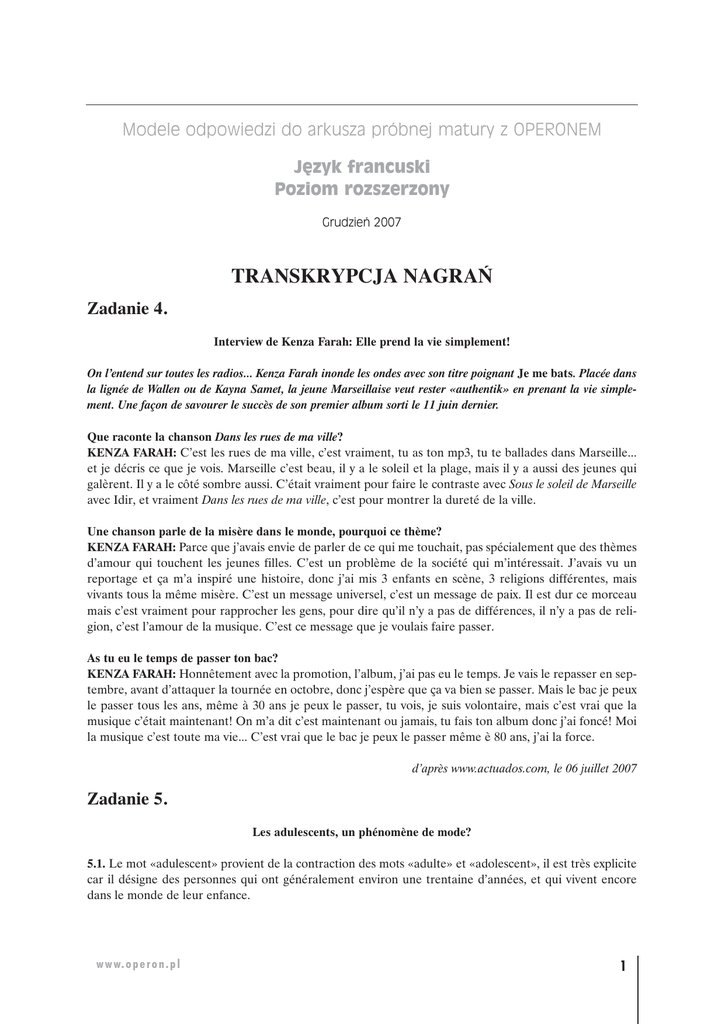 Modele odpowiedzi do arkusza próbnej matury z OPERONEM J´zyk francuski Poziom rozszerzony Grudzieƒ 2007 TRANSKRYPCJA NAGRA¡ Zadanie 4. Interview de Kenza Farah: Elle prend la vie simplement! On l’entend sur toutes les radios... Kenza Farah inonde les ondes avec son titre poignant Je me bats. Placée dans la lignée de Wallen ou de Kayna Samet, la jeune Marseillaise veut rester «authentik» en prenant la vie simplement. Une fa˜on de savourer le succ¯s de son premier album sorti le 11 juin dernier. Que raconte la chanson Dans les rues de ma ville? KENZA FARAH: C’est les rues de ma ville, c’est vraiment, tu as ton mp3, tu te ballades dans Marseille... et je décris ce que je vois. Marseille c’est beau, il y a le soleil et la plage, mais il y a aussi des jeunes qui gal¯rent. Il y a le côté sombre aussi. C’était vraiment pour faire le contraste avec Sous le soleil de Marseille avec Idir, et vraiment Dans les rues de ma ville, c’est pour montrer la dureté de la ville. Une chanson parle de la mis¯re dans le monde, pourquoi ce th¯me? KENZA FARAH: Parce que j’avais envie de parler de ce qui me touchait, pas spécialement que des th¯mes d’amour qui touchent les jeunes filles. C’est un probl¯me de la société qui m’intéressait. J’avais vu un reportage et ˜a m’a inspiré une histoire, donc j’ai mis 3 enfants en sc¯ne, 3 religions différentes, mais vivants tous la m˘me mis¯re. C’est un message universel, c’est un message de paix. Il est dur ce morceau mais c’est vraiment pour rapprocher les gens, pour dire qu’il n’y a pas de différences, il n’y a pas de religion, c’est l’amour de la musique. C’est ce message que je voulais faire passer. As tu eu le temps de passer ton bac? KENZA FARAH: Honn˘tement avec la promotion, l’album, j’ai pas eu le temps. Je vais le repasser en septembre, avant d’attaquer la tournée en octobre, donc j’esp¯re que ˜a va bien se passer. Mais le bac je peux le passer tous les ans, m˘me ∫ 30 ans je peux le passer, tu vois, je suis volontaire, mais c’est vrai que la musique c’était maintenant! On m’a dit c’est maintenant ou jamais, tu fais ton album donc j’ai foncé! Moi la musique c’est toute ma vie... C’est vrai que le bac je peux le passer m˘me ¯ 80 ans, j’ai la force. d’apr¯s www.actuados.com, le 06 juillet 2007 Zadanie 5. Les adulescents, un phénom¯ne de mode? 5.1. Le mot «adulescent» provient de la contraction des mots «adulte» et «adolescent», il est tr¯s explicite car il désigne des personnes qui ont généralement environ une trentaine d’années, et qui vivent encore dans le monde de leur enfance. w w w. o p e r o n . p l 1 J´zyk francuski. Poziom rozszerzony – cz´Êç I. Transkrypcja nagraƒ Próbna Matura z OPERONEM i „Gazetà Wyborczà” 5.2. Nous voyons effectivement apparaître de plus en plus de personnes qui mélangent les attitudes, les valeurs et les comportements des deux âges. Ces adulescents idolâtrent Casimir, Capitaine Flam, Goldorak… ils mangent des bonbons (surtout des sucettes) ∫ longueur de journée, sirotent de la grenadine, aiment les jeux vidéos et adorent se déplacer en trottinette! Bien sûr, je schématise un peu mais je pense ˘tre assez proche de la vérité. 5.3. De plus, les publicitaires l’ont tr¯s bien compris: les produits adaptés ∫ cette demande déferlent sur le marché, comme tous les accessoires dérivés ou les chansons de cél¯bres dessins animés des années 80. (Goldorak, Albator, Les mystérieuses cités d’or, Capitaine Flam…) ou des voitures toutes en rondeurs dans des teintes acidulés (la New Beattle) ou encore des v˘tements kitsch et branchés. Des «stars» comme Loana ou Steevy du Loft contribuent aussi ∫ diffuser ce type de comportements: l’un ne pouvait se séparer de son âne et l’autre de sa peluche et de son biberon! 5.4. Les adulescents témoignent d’une énorme nostalgie de leur enfance, qu’ils tentent de retrouver au travers de régressions plus ou moins puériles, mais le plus grave se sont leurs difficultés ∫ faire preuve de quelque autorité ou responsabilité importante. En vivant dans leur petit monde enfantin, ils ne prennent pas tous conscience des responsabilités que doivent assumer les adultes. 5.5. Bien sur, il ne faut pas ˘tre trop catégorique, nous sommes en fait tous des adulescents, ∫ divers degrés. Nous manifestons tous certains penchants régressifs, de temps en temps, quand nous devons faire face ∫ des épreuves ou que nous sommes embarqués dans des délires de groupe. Mais le culte de l’enfance ne doit pas dépasser les limites du raisonnable, s’enfermer dans une petite bulle rose et jouer avec ses peluches toute la journée en se coupant du monde extérieur est une attitude dangereuse qui risque d’aboutir ∫ une marginalisation ∫ plus ou moins long terme. d’apr¯s www.actuados.com, le 11 octobre 2007 Zadanie 6. «La baguette standard demeure un pain blanc, plutôt pauvre en fibres, vitamines et minéraux», critique Charles Pernin, de la CLCV. Cette importante association de consommateurs voudrait voir arriver dans les boulangeries une nouvelle baguette, grise, faite de farine semi-compl¯te, meilleure pour la santé puisqu’elle est 40% plus riche en fibres et magnésium, contient plus de vitamines B et aide ∫ réguler l’appétit. Selon la CLCV, cette baguette – dont la mati¯re premi¯re serait idéalement exempte de résidus de pesticides – devra ˘tre vendue au m˘me prix que l’ancienne baguette blanche. C’est ce que prônaient l’Agence fran˜aise de sécurité sanitaire des aliments et le Programme national nutrition santé en encourageant, d¯s 2004 et 2005, ∫ manger quotidiennement du pain complet. La résistance risque de venir des boulangers, qui vendent cher leurs «pains spéciaux». Ils n’ont rien ∫ gagner ∫ promouvoir une baguette grise moins salée qui risque de leur faire perdre des ventes 