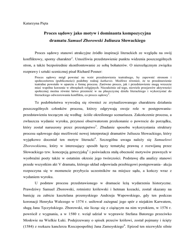 Katarzyna Pięta Proces sądowy jako motyw i dominanta kompozycyjna dramatu Samuel Zborowski Juliusza Słowackiego Proces sądowy stanowi atrakcyjne źródło inspiracji literackich ze względu na swój konfliktowy, sporny charakter1. Umożliwia przedstawienie punktu widzenia poszczególnych stron, a także bezpośrednie skonfrontowanie ze sobą bohaterów. O nierozłącznym związku rozprawy i sztuki scenicznej pisał Richard Posner: Proces sądowy mógł powstać na wzór przedstawienia teatralnego, by zapewnić stronom i społeczeństwu (publiczności) podobny rodzaj katharsis. Możliwe również, że to przedstawienie teatralne powstało w oparciu o formę procesu. Zarówno proces, jak i przedstawienie mogą wreszcie mieć wspólne korzenie w obrzędach religijnych. Niezależnie od tego, niewiele przejawów aktywności społecznej można równie łatwo przenieść w na płaszczyznę dzieła literackiego i wykorzystać do 2 literackiego odwzorowania konfliktu, co proces sądowy . Te podobieństwa wywodzą się również ze zrytualizowanego charakteru działania poszczególnych członków procesu, którzy odgrywają swoje role w postępowaniuprzedstawieniu toczącym się według ściśle określonego scenariusza. Zakończenie procesu, a zwłaszcza wydanie wyroku, przynosi obserwatorom przekonanie o powrocie do porządku, który został naruszony przez przestępstwo3. Zbadanie sposobu wykorzystania struktury procesu sądowego daje możliwość nowej interpretacji dramatów Juliusza Słowackiego, który wyjątkowo doceniał ten motyw literacki4. Szczególna uwaga należy się Samuelowi Zborowskiemu, który w interesujący sposób łączy tematykę prawną z rozwijaną przez Słowackiego tzw. koncepcją genezyjską5 i poświadcza stałą obecność motywów prawnych w wyobraźni poety także w ostatnim okresie jego twórczości. Podstawę dla analizy stanowi przede wszystkim akt V dramatu, którego układ odpowiada przebiegowi postępowania– akcja rozpoczyna się w momencie przybycia uczestników na miejsce sądu, a kończy wraz z wydaniem wyroku. U podstaw procesu przedstawionego w dramacie leżą wydarzenia historyczne. Prawdziwy Samuel Zborowski, rotmistrz królewski i hetman kozacki, został skazany na banicję za zabicie kasztelana przemyskiego Andrzeja Wapowskiego, gdy ten podczas koronacji Henryka Walezego w 1574 r. usiłował zażegnać jego spór z niejakim Karwatem, sługą Jana Tęczyńskiego. Zborowski, nie licząc się z ciążącym na nim wyrokiem, w 1576 r. powrócił z wygnania, a w 1580 r. wziął udział w wyprawie Stefana Batorego przeciwko Moskwie na Wielkie Łuki. Podejrzewany o spisek przeciw królowi, został pojmany i ścięty (1584) z rozkazu kanclerza Rzeczpospolitej Jana Zamoyskiego 6. Epizod ten niezwykle silnie 2 pobudzał wyobraźnię twórców i został wykorzystany w wielu utworach literackich7. Postać szlacheckiego warchoła dawała przyczynek do dyskusji o konflikcie prawa państwowego i anarchistycznie rozumianej wolności szlacheckiej, a także o samowoli potężnych rodów magnackich i ich politycznej grze. Nie sposób jednak myśleć o Samuelu Zborowskim jako o rekonstrukcji sytuacji historycznej, której zresztą nie da się odtworzyć, posiłkując się jedynie treścią dramatu. Słowacki przeniósł co prawda na płaszczyznę utworu dwie główne postaci sporu: Samuela i Kanclerza, lecz znacząco przekształcił ich sylwetki. Pomysł postawienia bohaterów przed sądem mógł zostać zaczerpnięty z pamiętników wydanych przez Lucjana Siemieńskiego. Czytamy w nich: „I [Samuel – K. P.] przebaczył mu [Zamoyskiemu – K. P.] pozywając przed sąd Boga i w oczach naszych odtąd staje nie jak winowajca, którego prawa krajowe dosięgły, ale jak ofiara….”8. Takie postawienie sprawy Zborowskiego, przedstawienie go jako pokrzywdzonego, a nie zbrodniarza, umożliwiło Słowackiemu zreinterpretowanie tej postaci. W dramacie niesprawiedliwie skazany na śmierć Samuel szuka sprawiedliwości przed pozaziemskim sądem. Pojawia się w roli oskarżyciela, pozywającego. Stroną przeciwną czyli oskarżonym, jest Kanclerz, który doprowadził do jego śmierci działając w granicach prawa, kazał bowiem ściąć „buntownika” [X, 324] i banitę. Konsekwencje tej egzekucji mają ogromne znaczenie, gdy rozpatruje się je w kontekście myśli genezyjskiej Słowackiego. Pozwala ona na istotne przewartościowanie moralnej oceny faktu ścięcia Samuela – w jej perspektywie wina Kanclerza, który doprowadził do śmierci Zborowskiego, okazuje się dużo istotniejsza, niż wina Zborowskiego, którego przestępstwo nie zostało w tekście dramatu przywołane. Dlaczego czyn Kanclerza zasługiwał na tak wielkie potępienie? Ponieważ zgodnie z ideą genezyjską zaburzył zaprojektowany przez Stwórcę plan rozwoju świata. Duch Zborowskiego zajmował zaszczytne miejsce w hierarchii bytów, w związku z czym jego ścięcie nie było zwykłym wykonaniem wyroku na przestępcy, miało wpływ na losy całego narodu i w konsekwencji doprowadziło do upadku państwa. Ciało, potraktowane w sposób hańbiący, poniosło niezasłużoną karę, lecz istotniejsze od męki fizycznej okazało się zaburzenie rozwoju duchowego. Zborowski sam przyznał: […] nie o mnie chodzi, Ale o tę myśl co narody rodzi, A była we mnie twoim mieczem ścięta. [X, 326] Postawa Kanclerza nie świadczy jednak o tym, by z premedytacją występował przeciwko boskiemu porządkowi lub nie był go świadomy. Wprost przeciwnie – jest on przekonany o słuszności swoich działań właśnie w perspektywie duchowej, mówi: „Bo we 3 mnie był duch… co części wydziela […] prawa narodu stanowi / I ma moc z Boga.” [X, 327]. Nie potrafi jednak zaakceptować sytuacji, w której wola nieposłusznego Samuela zwycięża i przerasta porządek prawa państwowego. W utworze dochodzi więc do konfrontacji postaw i związanych z nimi systemów: prawa ludzkiego, materialnego i zależnego od 
