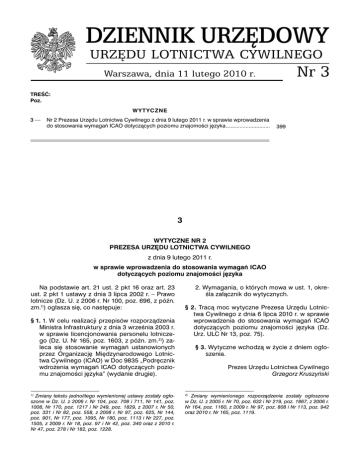 DZIENNIK URZĘDOWY URZĘDU LOTNICTWA CYWILNEGO Nr 3 Warszawa, dnia 11 lutego 2010 r. TREŚĆ: Poz. W Y T YC Z N E 3— Nr 2 Prezesa Urzędu Lotnictwa Cywilnego z dnia 9 lutego 2011 r. w sprawie wprowadzenia do stosowania wymagań ICAO dotyczących poziomu znajomości języka ............................. 399 3 WYTYCZNE NR 2 PREZESA URZĘDU LOTNICTWA CYWILNEGO z dnia 9 lutego 2011 r. w sprawie wprowadzenia do stosowania wymagań ICAO dotyczących poziomu znajomości języka Na podstawie art. 21 ust. 2 pkt 16 oraz art. 23 ust. 2 pkt 1 ustawy z dnia 3 lipca 2002 r. – Prawo lotnicze (Dz. U. z 2006 r. Nr 100, poz. 696, z późn. zm.1)) ogłasza się, co następuje: § 1. 1. W celu realizacji przepisów rozporządzenia Ministra Infrastruktury z dnia 3 września 2003 r. w sprawie licencjonowania personelu lotniczego (Dz. U. Nr 165, poz. 1603, z późn. zm.2)) zaleca się stosowanie wymagań ustanowionych przez Organizację Międzynarodowego Lotnictwa Cywilnego (ICAO) w Doc 9835 „Podręcznik wdrożenia wymagań ICAO dotyczących poziomu znajomości języka” (wydanie drugie). 1) Zmiany tekstu jednolitego wymienionej ustawy zostały ogłoszone w Dz. U. z 2006 r. Nr 104, poz. 708 i 711, Nr 141, poz. 1008, Nr 170, poz. 1217 i Nr 249, poz. 1829, z 2007 r. Nr 50, poz. 331 i Nr 82, poz. 558, z 2008 r. Nr 97, poz. 625, Nr 144, poz. 901, Nr 177, poz. 1095, Nr 180, poz. 1113 i Nr 227, poz. 1505, z 2009 r. Nr 18, poz. 97 i Nr 42, poz. 340 oraz z 2010 r. Nr 47, poz. 278 i Nr 182, poz. 1228. 2. Wymagania, o których mowa w ust. 1, określa załącznik do wytycznych. § 2. Tracą moc wytyczne Prezesa Urzędu Lotnictwa Cywilnego z dnia 6 lipca 2010 r. w sprawie wprowadzenia do stosowania wymagań ICAO dotyczących poziomu znajomości języka (Dz. Urz. ULC Nr 13, poz. 75). § 3. Wytyczne wchodzą w życie z dniem ogłoszenia. Prezes Urzędu Lotnictwa Cywilnego Grzegorz Kruszyński Zmiany wymienionego rozporządzenia zostały ogłoszone w Dz. U. z 2005 r. Nr 70, poz. 632 i Nr 219, poz. 1867, z 2006 r. Nr 164, poz. 1160, z 2009 r. Nr 97, poz. 808 i Nr 113, poz. 942 oraz 2010 r. Nr 165, poz. 1119. 2) Dziennik Urzędowy Urzędu Lotnictwa Cywilnego Nr 3 — 400 — Poz. 3 Dziennik Urzędowy Urzędu Lotnictwa Cywilnego Nr 3 Poz. 3 — 401 — Załącznik do Wytycznych nr 2 Prezesa Urzędu Lotnictwa Cywilnego z dnia 9 lutego 2011 r. Dok. 9835 AN/453 PODRĘCZNIK WDROŻENIA WYMAGAŃ ICAO DOTYCZĄCYCH POZIOMU ZNAJOMOŚCI JĘZYKA Zatwierdzone przez Sekretarza Generalnego i opublikowane z jego upoważnienia Wydanie drugie – 2010 Organizacja Międzynarodowego Lotnictwa Cywilnego Dziennik Urzędowy Urzędu Lotnictwa Cywilnego Nr 3 — 402 — Poz. 3 Opublikowane oddzielnie w wydaniach: angielskim, arabskim, chiskim, francuskim, rosyjskim i hiszpaskim przez ORGANIZACJ MIDZYNARODOW LOTNICTWA CYWILNEGO 999 University Street, Montreal, Quebec, Canada H3C 5H7 Informacje dotyczce zamówie i peny wykaz agentów i sklepów mona znale na stronie internetowej ICAO www.icao.int. Doc 9835, Manual on the Implementation of ICAO Language Proficiency Requirements Order Number: 9835 ISBN 978-92-9231-549-8 © ICAO 2010 Wszelkie prawa zastrzeone. adna cze z niniejszej publikacji nie moe by powielana, przechowywana lub przekazywana w dowolnej formie i w aden sposób bez uprzedniego uzyskania pisemnej zgody od Organizacji Midzynarodowego Lotnictwa Cywilnego Dziennik Urzędowy Urzędu Lotnictwa Cywilnego Nr 3 Poz. 3 — 403 — ZMIANY Wydanie zmian jest anonsowane regularnie w „ICAO Journal” i comiesicznie w „Supplement to the Catalogue of ICAO Publications and Audio–visual Training Aids”. Posiadacze tych wydawnictw mog z tego skorzysta. Poniej przygotowano miejsca do zarejestrowania wprowadzonych zmian. REJESTRACJA ZMIAN I POPRAWEK Poprawki Nr Data stosowania Data zgoszenia Errata Zgoszone przez Nr iii Data stosowania Data zgoszenia Zgoszone przez Dziennik Urzędowy Urzędu Lotnictwa Cywilnego Nr 3 — 404 — Poz. 3 Dziennik Urzędowy Urzędu Lotnictwa Cywilnego Nr 3 — 405 — Poz. 3 SPIS TRECI strona Przedmowa (vii) Sownik odnoszcy si do poziomu biegoci jzykowej i poj zwizanych z jego sprawdzaniem. (ix) Akronimy i skróty (xii) Publikacje (xiii) Rozdzia 1. Przypadek bezpieczestwa, który spowodowa wprowadzenie midzynarodowych wymaga dotyczcych poziomu znajomoci jzyka 1.1 Wprowadzenie 1.2 Historia tworzenia ICAO’wskich wymaga dotyczcych poziomu znajomoci jzyka 1.3 Przegld postanowie przed przyjciem zmian do wymaga dotyczcych poziomu znajomoci jzyka 1.4 Dziaania podjte przez ICAO 1-1 1-1 1-1 1-2 1-3 Rozdzia 2. Ogólne wprowadzenie do umiejtnoci posugiwania si jzykiem i nauka jzyka 2.1 Wstp 2.2 Porozumiewanie si 2.3 Umiejtno posugiwania si jzykiem 2.4 Status uytkownika jzyka i poziomy znajomoci jzyka 2.5 Angielski jako przypadek wspólnego jzyka 2.6 Zdobywanie umiejtnoci jzykowych 2-1 2-1 2-1 2-1 2-4 2-6 2-7 Rozdzia 3. Lotnicza czno radiowa 3.1 Wprowadzenie 3.2 Jzyk ogólny i dla celów specjalnych 3.3 Ogólne cechy jzyka w lotniczej cznoci radiowej 3.4 Szczególne cechy jzyka stosowanego w lotniczej cznoci radiowej 3-1 3-1 3-1 3-2 3-7 Rozdzia 4. Normy oraz zalecane metody postpowania ICAO w zakresie wymaga dotyczcych poziomu znajomoci jzyka 4.1 Wprowadzenie 4.2 Omówienie wymaga SARP dotyczcych poziomu znajomoci jzyka 4.3 Zacznik 10 SARP dotyczcy stosowania jzyka 4.4 Zacznik 1: SARP odnoszce si do znajomoci jzyka 4.5 Zacznik 1: opisy dla ICAO’wskich wymaga dotyczcych poziomu znajomoci jzyka 4.6 Wyjanienie opisów skali ocen (poziom 3 i powyej) 4.7 Procedury dla sub eglugi powietrznej — zarzdzanie ruchem lotniczym (PANS-ATM, Dok. 4444) 4-1 4-1 4-1 4-2 4-3 4-5 4-9 4-14 v Dziennik Urzędowy Urzędu Lotnictwa Cywilnego Nr 3 — 406 — Poz. 3 Rozdzia 5. Wdroenie 5.1 Wprowadzenie 5.2 Wytyczne dla przygotowania planu wdroenia zaoe dotyczcych znajomoci jzyka 5.3 Wdroenie operacyjne 5-1 5-1 5-1 5-4 Rozdzia 6. Kryteria dla sprawdzania znajomoci jzyka dla wiatowej harmonizacji 6.1 Wprowadzenie 6.2 Historia 6.3 Zalecane kryteria d