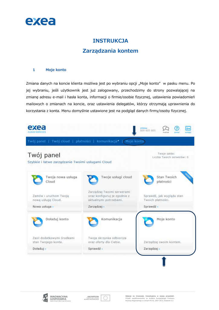 INSTRUKCJA Zarządzania kontem 1 Moje konto Zmiana danych na koncie klienta możliwa jest po wybraniu opcji „Moje konto” w pasku menu. Po jej wybraniu, jeśli użytkownik jest już zalogowany, przechodzimy do strony pozwalającej na zmianę adresu e-mail i hasła konta, informacji o firmie/osobie fizycznej, ustawienia powiadomień mailowych o zmianach na koncie, oraz ustawienia delegatów, którzy otrzymają uprawnienia do korzystania z konta. Menu domyślnie ustawione jest na podgląd danych firmy/osoby fizycznej. Dotacje na innowacje. Inwestujemy w waszą przyszłość. Projekt współfinansowany ze środków Europejskiego Funduszu Rozwoju Regionalnego w ramach PO IG, 2007-2013, Działanie 5.3. 2. Edytuj dane Zmianę danych firmy uruchamiamy za pomocą przycisku „Edytuj dane”. Mamy w ten sposób możliwość zmiany wszystkich informacji, które podaliśmy przy rejestracji na portalu. Dotacje na innowacje. Inwestujemy w waszą przyszłość. Projekt współfinansowany ze środków Europejskiego Funduszu Rozwoju Regionalnego w ramach PO IG, 2007-2013, Działanie 5.3. 3. Zmiana hasła e-mail Zmiany hasła e-mail dokonujemy wpisując w odpowiednie pola hasło konta i nowy e-mail oraz zatwierdzając zmianę przyciskiem „Zmień e-mail”. Zmiana następuje natychmiast, bez potrzeby potwierdzania. Dotacje na innowacje. Inwestujemy w waszą przyszłość. Projekt współfinansowany ze środków Europejskiego Funduszu Rozwoju Regionalnego w ramach PO IG, 2007-2013, Działanie 5.3. 4. Zmiana hasła konta Zmiana hasła wykonywana jest po kliknięciu przycisku „Zmień hasło”. Aby ustawić nowe, należy wpisać jednokrotnie stare hasło, a następnie dwukrotnie nowe (w celu potwierdzenia poprawności wyboru). Przycisk „Zmień” zatwierdza zmianę. 0 Dotacje na innowacje. Inwestujemy w waszą przyszłość. Projekt współfinansowany ze środków Europejskiego Funduszu Rozwoju Regionalnego w ramach PO IG, 2007-2013, Działanie 5.3. 5. Utworzenie konta delegata Na stronie „Konta delegatów” można ustawiać dostęp do konta innych osób, które mogą działać w zastępstwie właściciela. Aby dodać konto, należy kliknąć przycisk „Dodaj konto”, a następnie wybrać nazwę, pod którą delegat będzie występował oraz podać jego adres e-mail. Po zatwierdzeniu wyboru przyciskiem „Utwórz konto”, dostęp zostaje założony automatycznie, bez maila powiadamiającego odbiorcę uprawnień. Hasło dostępu do konta delegata widoczne jest jednokrotnie, więc należy je bezzwłocznie podać uprawnionej osobie. Należy pamiętać też o tym, że aby zalogować się do swojego konta, delegat musi podać w odpowiednim polu nazwę organizacji, zamiast nazwy użytkownika! Zmiany uprawnień delegata dokonujemy wybierając opcję „Edytuj dane”, a następnie wskazując odpowiednią rolę. Dotacje na innowacje. Inwestujemy w waszą przyszłość. Projekt współfinansowany ze środków Europejskiego Funduszu Rozwoju Regionalnego w ramach PO IG, 2007-2013, Działanie 5.3. 6. Powiadomienie o usługach W zakładce „Ustawienia konta” można włączyć bądź wyłączyć wysyłanie powiadomień o zamawianych usługach na podany adres e-mail. Dotacje na innowacje. Inwestujemy w waszą przyszłość. Projekt współfinansowany ze środków Europejskiego Funduszu Rozwoju Regionalnego w ramach PO IG, 2007-2013, Działanie 5.3.