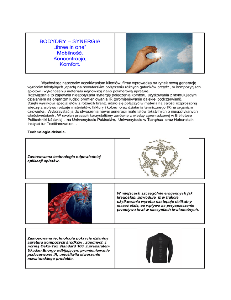 BODYDRY – SYNERGIA „three in one” Mobilność, Koncentracja, Komfort. Wychodząc naprzeciw oczekiwaniom klientów, firma wprowadza na rynek nową generację wyrobów tekstylnych ,opartą na nowatorskim połączeniu różnych gatunków przędz , w kompozycjach splotów i wykończeniu materiału najnowszą nano polimerową apreturą.. Rozwiązanie to zapewnia niespotykana synergię połączenia komfortu użytkowania z stymulującym działaniem na organizm ludzki promieniowania IR (promieniowanie dalekiej podczerwieni). Dzięki wysiłkowi specjalistów z różnych branż, udało się połączyć w materialną całość rozproszoną wiedzę z wpływu rodzaju materiałów, faktury i koloru oraz działania termicznego IR na organizm człowieka . Wykorzystać ją do stworzenia nowej generacji materiałów tekstylnych o niespotykanych właściwościach . W swoich pracach korzystaliśmy zarówno z wiedzy zgromadzonej w Bibliotece Politechniki Łódzkiej , na Uniwersytecie Pekińskim, Uniwersytecie w Tsinghua oraz Hohenstein Instytut fur Textilinnovation . Technologia dziania. Zastosowana technologia odpowiedniej aplikacji splotów. W miejscach szczególnie erogennych jak kręgosłup, powoduje iż w trakcie użytkowania wyrobu następuje delikatny masaż ciała, co wpływa na przyspieszenie przepływu krwi w naczyniach krwionośnych. Zastosowana technologia pokrycia dzianiny apreturą kompozycji środków , zgodnych z normą Oeko-Tex Standard 100 z preparatem Ukadan Energy odbijającym promieniowanie podczerwone IR, umożliwiła stworzenie nowatorskiego produktu. -2Czynnik promieniowania podczerwonego IR Dla zobrazowania wpływu na organizm człowieka ,należy uwzględnić następujące elementy: - promieniowanie podczerwone jest składnikiem promieniowania cieplnego, - każdy człowiek emituje rozproszone promieniowanie IR. Rozproszone promieniowanie IR uderza w cząsteczki naniesionych na dzianinę nano polimerów, kompozycji specjalnie dobranych nano minerałów. Wprowadza w drgania jądra ich atomów, które na skutek wpadania w rezonans , emitują skoncentrowane promieniowanie IR o długości fali w granicach od 2 do 16 μm. Spektrum falowe emitowane przez ludzkie ciało i przenikalność skóry. (Pionowo na osi) - Przenikalność, (Poziomo) - Długość fali (μm) Uniwersytet Tsinghua IR odbite jak w soczewce z reflektorem. CENTRUM BADAŃ MOLEKULARNYCH I MAKROMOLEKULARNYCH POLSKIEJ AKADEMII NAUK Raport z analizy preparacji Ukadan Energy Rys. przedstawiają spektrogramy roztworów preparacji dostarczonych przez zleceniodawcę. Są one niemal identyczne ze spektrogramem również dostarczonym przez zleceniodawcę a pochodzącym z literatury przedmiotu. -3- Emitowane promieniowanie IR stanowiące część promieniowania słonecznego UVA. Przenika w głąb skóry na głębokość do 4 mm. Pobudza znajdujące się w niej receptory i ścianki naczyń krwionośnych. Przepływające w naczyniach krwionośnych czerwone krwinki maja tendencje do zlepiania się i tworzenia swoistych grudek. Zmniejszają przez to powierzchnię przenoszącą tlen. O2 ↓ Jonizujące działanie promieniowania IR powoduje rozklejanie się czerwonych krwinek w procesie absorbowania tlenu. W obiegu krwi zwiększają jego dostarczanie do komórek całego organizmu. Jednocześnie pochłaniają zużyty tlen w postaci CO2. Czerwone krwinki przyczyniają się do wydalenia CO2 z organizmu człowieka. ↓ CO2 Dzięki lepszemu utlenieniu zwiększa się metabolizm całego organizmu. Może następować wzrost przemiany materii nawet o około 3,6%, przy podniesieniu temperatury powierzchniowej skóry o 0,1 oC. -4Od szeregu lat na świecie jak np. na Uniwersytecie Pekińskim , Uniwersytecie w Tsinghua , w US Army Reserch Institute of Environmental Medicine, Natick, Massachusetts , prowadzono badania wpływu promieniowania podczerwonego na reakcje organizmu człowieka. Uzyskiwano pozytywne wyniki w zakresie niszczenie przez promieniowanie podczerwone IR różnego rodzaju niebezpieczne bakterie jak np. staphylococcrus aureus i coli Niestety wyniki były utajniane. Ostatnie badania wykazują, iż energia dalekiej podczerwieni ma pozytywny wpływ na układ sercowo-naczyniowy, układ oddechowy, gospodarkę wodno-elektrolitową, czynność wydzielniczą nerek i wielu innych gruczołów. Obniża napięcie mięśni, zmniejsza pobudliwość nerwową oraz wrażliwość receptorową, przez co działa uspokajająco i przeciwbólowo. Znacznie przyspiesza przemianę materii i obniża zmęczenie organizmu. Jednocześnie wywiera szczególny wpływ na: Wzrost koncentracji Potwierdziły badania przeprowadzone w Centrum Badań Psychiatrycznych i Psychologicznych w Łodzi, na grupie kierowców zakończone konkluzją: ‘’Podsumowanie: Na podstawie przeprowadzonych badań można stwierdzić, że koszulki powodują skracają czas reakcji oraz poprawiają koordynację wzrokowo-ruchową, która ma wpływ na szybkość podejmowanych decyzji kierowcy.’’ Potęguje wzrost zachowania równowagi – balansu ciała . -5Wzrost zachowania równowagi i koordynacji w Hohenstein Instytut fur Textilinnovation . potwierdzają badania przeprowadzone Wzrost wydolności fizycznej w tym siły rąk Potwierdziły badania przeprowadzone na grupie sportowców w Wyższej Szkole Sportowej im. Kazimierza Górskiego w Łodzi , zakończone konkluzją: ‘’Badania wykazały, iż noszenie koszulki w przeciągu godziny jest w stanie zwiększyć generowaną siłę kończyn górnych zawodników. Dodatkowo dla prawej ręki jest to wynik istotnie różny.’’ PROJEKT REALIZOWANY W RAMACH III OSI PRIORYTETOWEJ REGIONALNEGO PROGRAMU OPERACYJNEGO WOJEWÓDZTWA ŁÓDZKIEGO NA LATA 2007 – 2013: GOSPODARKA INNOWACYJNOŚĆ PRZEDSIĘBIORCZOŚĆ, DZIAŁANIE 3. ROZWÓJ B+R W PRZEDSIĘBIORSTWACH DOFINANSOWANIE ZE ŚRODKÓW EUROPEJSKIEGO FUNDUSZU ROZWOJU REGIONALNEGO I BUDŻETU PAŃSTWA