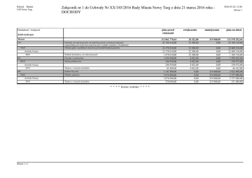Rekord Budżet UM Nowy Targ Załącznik nr 1 do Uchwały Nr XX/185/2016 Rady Miasta Nowy Targ z dnia 21 marca 2016 roku DOCHODY plan przed zmianami Dokładność / kolejność dział-rozdz-par Razem: 756 Dochody od osób prawnych, od osób fizycznych i od innych jednostek nieposiadajacych osobowosci prawnej oraz wydatki związane z ich poborem Udzialy gmin w podatkach stanowiacych dochód budzetu panstwa 75621 - dochody bieżące 0020 801 Podatek dochodowy od osób prawnych Oswiata i wychowanie 80101 Szkoly podstawowe - dochody bieżące 0970 926 Wplywy z róznych dochodów Kultura fizyczna 92601 Obiekty sportowe - dochody bieżące 0970 Wplywy z róznych dochodów * * * * Koniec wydruku * * * * Strona 1 z 1 zwiększenia zmniejszenia 2016-03-22, 15:46 Strona 1 plan na dzień 113 862 770,64 43 766 010,00 26 522,00 22 500,00 319 000,00 0,00 113 570 292,64 43 788 510,00 22 578 010,00 22 578 010,00 1 078 010,00 1 994 940,00 246 950,00 246 950,00 82 400,00 3 141 800,00 3 076 000,00 3 076 000,00 570 000,00 22 500,00 22 500,00 22 500,00 4 022,00 4 022,00 4 022,00 4 022,00 0,00 0,00 0,00 0,00 0,00 0,00 0,00 0,00 0,00 0,00 0,00 319 000,00 319 000,00 319 000,00 319 000,00 22 600 510,00 22 600 510,00 1 100 510,00 1 998 962,00 250 972,00 250 972,00 86 422,00 2 822 800,00 2 757 000,00 2 757 000,00 251 000,00