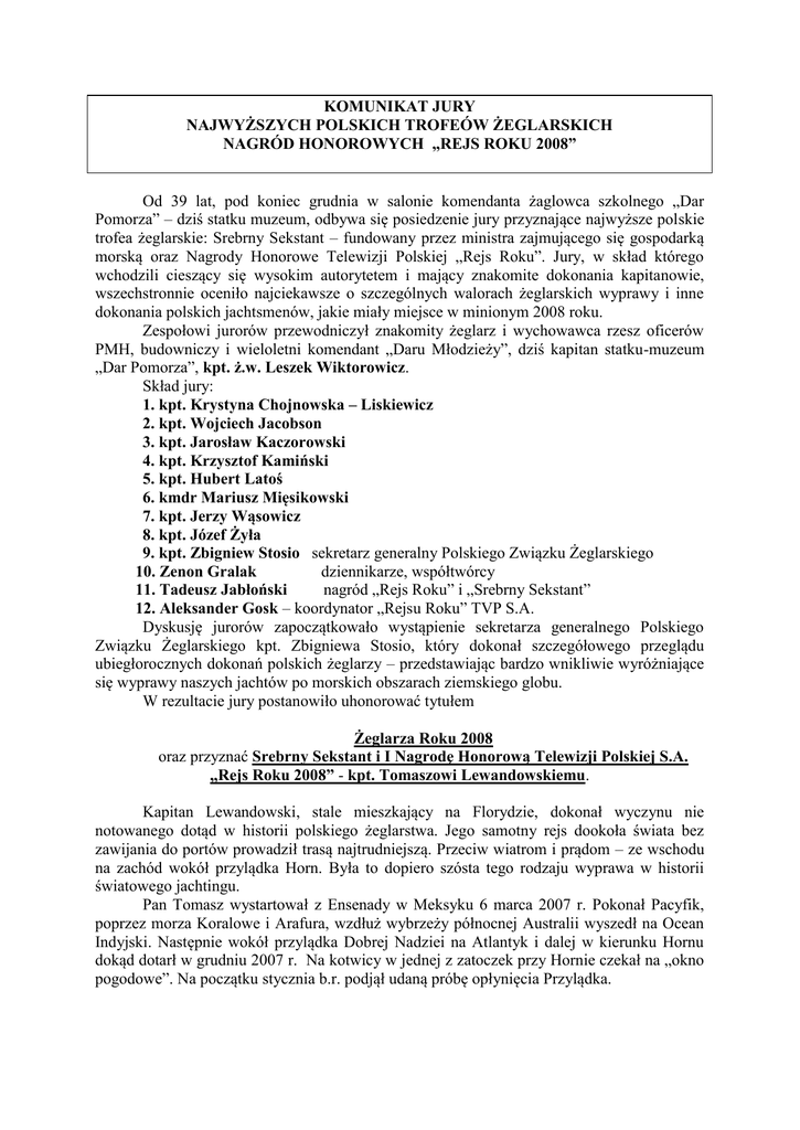 KOMUNIKAT JURY NAJWYŻSZYCH POLSKICH TROFEÓW ŻEGLARSKICH NAGRÓD HONOROWYCH „REJS ROKU 2008” Od 39 lat, pod koniec grudnia w salonie komendanta żaglowca szkolnego „Dar Pomorza” – dziś statku muzeum, odbywa się posiedzenie jury przyznające najwyższe polskie trofea żeglarskie: Srebrny Sekstant – fundowany przez ministra zajmującego się gospodarką morską oraz Nagrody Honorowe Telewizji Polskiej „Rejs Roku”. Jury, w skład którego wchodzili cieszący się wysokim autorytetem i mający znakomite dokonania kapitanowie, wszechstronnie oceniło najciekawsze o szczególnych walorach żeglarskich wyprawy i inne dokonania polskich jachtsmenów, jakie miały miejsce w minionym 2008 roku. Zespołowi jurorów przewodniczył znakomity żeglarz i wychowawca rzesz oficerów PMH, budowniczy i wieloletni komendant „Daru Młodzieży”, dziś kapitan statku-muzeum „Dar Pomorza”, kpt. ż.w. Leszek Wiktorowicz. Skład jury: 1. kpt. Krystyna Chojnowska – Liskiewicz 2. kpt. Wojciech Jacobson 3. kpt. Jarosław Kaczorowski 4. kpt. Krzysztof Kamiński 5. kpt. Hubert Latoś 6. kmdr Mariusz Mięsikowski 7. kpt. Jerzy Wąsowicz 8. kpt. Józef Żyła 9. kpt. Zbigniew Stosio sekretarz generalny Polskiego Związku Żeglarskiego 10. Zenon Gralak dziennikarze, współtwórcy 11. Tadeusz Jabłoński nagród „Rejs Roku” i „Srebrny Sekstant” 12. Aleksander Gosk – koordynator „Rejsu Roku” TVP S.A. Dyskusję jurorów zapoczątkowało wystąpienie sekretarza generalnego Polskiego Związku Żeglarskiego kpt. Zbigniewa Stosio, który dokonał szczegółowego przeglądu ubiegłorocznych dokonań polskich żeglarzy – przedstawiając bardzo wnikliwie wyróżniające się wyprawy naszych jachtów po morskich obszarach ziemskiego globu. W rezultacie jury postanowiło uhonorować tytułem Żeglarza Roku 2008 oraz przyznać Srebrny Sekstant i I Nagrodę Honorową Telewizji Polskiej S.A. „Rejs Roku 2008” - kpt. Tomaszowi Lewandowskiemu. Kapitan Lewandowski, stale mieszkający na Florydzie, dokonał wyczynu nie notowanego dotąd w historii polskiego żeglarstwa. Jego samotny rejs dookoła świata bez zawijania do portów prowadził trasą najtrudniejszą. Przeciw wiatrom i prądom – ze wschodu na zachód wokół przylądka Horn. Była to dopiero szósta tego rodzaju wyprawa w historii światowego jachtingu. Pan Tomasz wystartował z Ensenady w Meksyku 6 marca 2007 r. Pokonał Pacyfik, poprzez morza Koralowe i Arafura, wzdłuż wybrzeży północnej Australii wyszedł na Ocean Indyjski. Następnie wokół przylądka Dobrej Nadziei na Atlantyk i dalej w kierunku Hornu dokąd dotarł w grudniu 2007 r. Na kotwicy w jednej z zatoczek przy Hornie czekał na „okno pogodowe”. Na początku stycznia b.r. podjął udaną próbę opłynięcia Przylądka. Po 391 dniach, 20 godzinach, 29 minutach i 10 sekundach jacht „Luka” prowadzony przez kpt. Tomasza Lewandowskiego powrócił do meksykańskiego portu Ensenada. W wokółziemskiej wyprawie towarzyszył kapitanowi „pierwszy oficer” – pies Wacek. W ten sposób spełniły się marzenia zrodzone w Iławie na Jeziorku., gdzie Tomasz Lewandowski rozpoczął swoją przygodę z żeglarstwem. Warto podkreślić, że wyprawa zorganizowana została własnym sumptem, bez sponsorów i medialnej wrzawy. Tym wspaniałym rejsem udowodnił, że warto mieć marzenia i odwagę by je realizować – podkreśliło Jury, jednogłośnie decydując o przyznaniu żeglarzowi najwyższych polskich trofeów żeglarskich. II Nagrodę Honorową TVP S.A. „Rejs Roku 2008” przyznano dwóm kapitanom: Piotrowi Kuźniarowi i Henrykowi Widerze Wyprawy, które prowadzili miały zupełnie inny charakter. Pierwszy z nich dowodził dużym jachtem „Selma Expeditions” (dług. 20 m) z 20osobową załogą, którą poprowadził na lodowe wody Antarktyki. Drugi wybrał samotną żeglugę na niespełna 8-metrowym jachcie „Gawot” w żegludze wokół Europy. Kpt. Piotr Kuźniar rozpoczął rejs z wrocławską załogą 12 lutego - zakończył 11 marca 2008 r. w argentyńskim porcie Ushuaia. Żeglarze płynęli po najtrudniejszych na świecie akwenach – wokół Hornu, cieśniną Drake’a i dalej na południe na antarktyczne wody Morza Bellingshausena. W niesprzyjających warunkach początku jesieni „Selma Expeditions” jako pierwszy polski jacht dotarł do południowych wybrzeży wyspy Charcota, przekraczając koło podbiegunowe i osiągając szerokość geogr. 70 st. 11 min. South. Powrót prowadził wśród szkerów i wysp przylegających do zachodnich wybrzeży Półwyspu Antarktycznego, wśród lodów, mgieł i coraz dłuższych nocy. Po przepłynięciu 2678 Mm załoga w dobrej kondycji zameldowała się w Ushuaia. Kpt. Henryk Widera jest emerytowanym koncertmistrzem Opery i Operetki w Szczecinie. Żegluje od początku lat 60. Rejs życia udało mu się jednak zrealizować dopiero w ostatnich dwóch latach. Kiedy po przepłynięciu 8 tys. Mm kończył 11 października 2008 r. w Szczecinie swą wyprawę miał 78 lat. Samotną podróż dookoła Europy na maleńkim „Gawocie” rozpoczął 15 maja 2006 r. Trasa wiodła ze Szczecina przez Bałtyk, Morze Północne, Szetlandy, Orkady, wokół Wysp Brytyjskich, następnie wybrzeży francuskich, Półwyspu Iberyjskiego na Morze Śródziemne. Docierając po drodze na Baleary, Sardynię, Sycylię, Maltę poprzez porty Grecji i Turcji przeszedł na Morze Czarne. Tam Bułgaria, Rumunia, Ukraina, Rosja. Dwa miesiące trwały starania kpt. Widery by móc rzekami rosyjskimi dotrzeć do Murmańska jak przewidywał plan wyprawy. Przeszkody administracyjny okazały się nie do pokonania. Ostatecznie żeglarz wrócił na Ukrainę skąd już drogą lądową „pożeglował” do Polski. Zwodował jacht na Wiśle którą dopłynął do Warszawy. Niskie stany wody uniemożliwiły dalszą żeglugę. Kolejny etap lądowy i ponowne wodowanie w Gdańsku. Stąd morzem do Szczecina gdzie zakończył swoją niekonwencjonalną wyprawę.