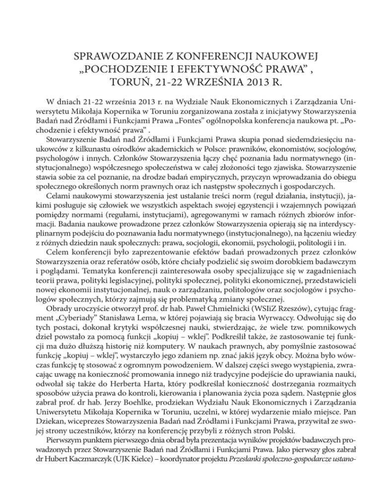 SPRAWOZDANIE Z KONFERENCJI NAUKOWEJ „POCHODZENIE I EFEKTYWNOŚĆ PRAWA” , TORUŃ, 21-22 WRZEŚNIA 2013 R. W dniach 21-22 września 2013 r. na Wydziale Nauk Ekonomicznych i Zarządzania Uniwersytetu Mikołaja Kopernika w Toruniu zorganizowana została z inicjatywy Stowarzyszenia Badań nad Źródłami i Funkcjami Prawa „Fontes” ogólnopolska konferencja naukowa pt. „Pochodzenie i efektywność prawa” . Stowarzyszenie Badań nad Źródłami i Funkcjami Prawa skupia ponad siedemdziesięciu naukowców z kilkunastu ośrodków akademickich w Polsce: prawników, ekonomistów, socjologów, psychologów i innych. Członków Stowarzyszenia łączy chęć poznania ładu normatywnego (instytucjonalnego) współczesnego społeczeństwa w całej złożoności tego zjawiska. Stowarzyszenie stawia sobie za cel poznanie, na drodze badań empirycznych, przyczyn wprowadzania do obiegu społecznego określonych norm prawnych oraz ich następstw społecznych i gospodarczych. Celami naukowymi stowarzyszenia jest ustalanie treści norm (reguł działania, instytucji), jakimi posługuje się człowiek we wszystkich aspektach swojej egzystencji i wzajemnych powiązań pomiędzy normami (regułami, instytucjami), agregowanymi w ramach różnych zbiorów informacji. Badania naukowe prowadzone przez członków Stowarzyszenia opierają się na interdyscyplinarnym podejściu do poznawania ładu normatywnego (instytucjonalnego), na łączeniu wiedzy z różnych dziedzin nauk społecznych: prawa, socjologii, ekonomii, psychologii, politologii i in. Celem konferencji było zaprezentowanie efektów badań prowadzonych przez członków Stowarzyszenia oraz referatów osób, które chciały podzielić się swoim dorobkiem badawczym i poglądami. Tematyka konferencji zainteresowała osoby specjalizujące się w zagadnieniach teorii prawa, polityki legislacyjnej, polityki społecznej, polityki ekonomicznej, przedstawicieli nowej ekonomii instytucjonalnej, nauk o zarządzaniu, politologów oraz socjologów i psychologów społecznych, którzy zajmują się problematyką zmiany społecznej. Obrady uroczyście otworzył prof. dr hab. Paweł Chmielnicki (WSIiZ Rzeszów), cytując fragment „Cyberiady” Stanisława Lema, w której pojawiają się bracia Wyrwaccy. Odwołując się do tych postaci, dokonał krytyki współczesnej nauki, stwierdzając, że wiele tzw. pomnikowych dzieł powstało za pomocą funkcji „kopiuj – wklej”. Podkreślił także, że zastosowanie tej funkcji ma dużo dłuższą historię niż komputery. W naukach prawnych, aby pomyślnie zastosować funkcję „kopiuj – wklej”, wystarczyło jego zdaniem np. znać jakiś język obcy. Można było wówczas funkcję tę stosować z ogromnym powodzeniem. W dalszej części swego wystąpienia, zwracając uwagę na konieczność promowania innego niż tradycyjne podejście do uprawiania nauki, odwołał się także do Herberta Harta, który podkreślał konieczność dostrzegania rozmaitych sposobów użycia prawa do kontroli, kierowania i planowania życia poza sądem. Następnie głos zabrał prof. dr hab. Jerzy Boehlke, prodziekan Wydziału Nauk Ekonomicznych i Zarządzania Uniwersytetu Mikołaja Kopernika w Toruniu, uczelni, w której wydarzenie miało miejsce. Pan Dziekan, wiceprezes Stowarzyszenia Badań nad Źródłami i Funkcjami Prawa, przywitał ze swojej strony uczestników, którzy na konferencję przybyli z różnych stron Polski. Pierwszym punktem pierwszego dnia obrad była prezentacja wyników projektów badawczych prowadzonych przez Stowarzyszenie Badań nad Źródłami i Funkcjami Prawa. Jako pierwszy głos zabrał dr Hubert Kaczmarczyk (UJK Kielce) – koordynator projektu Przesłanki społeczno-gospodarcze ustano- ROCZNIKI ADMINISTRACJI I PRAWA. ROK XIII wienia norm o refundacji leków, ich wykładnia i efekty stosowania. Prelegent w swym wystąpieniu zwrócił uwagę m.in. na fakt, że badana regulacja prawna doprowadziła do likwidacji konkurencji w zakresie sprzedaży leków na receptę. Walka cenowa przeniosła się na rynek leków pełnopłatnych i leków bez recepty. W przypadku leków OTC (bez recepty) pewną korzyść odnieśli pacjenci, ale wyłącznie w kategorii leków nierefundowanych. Ponadto zdaniem referenta na uwagę zasługuje specyficzny mechanizm refundacji przyjęty przez badaną ustawę. Zgodnie z nim pacjent płaci albo ryczałt, albo 30 czy 50% limitu refundowania i różnicę między ceną detaliczną leku a limitem refundacji. Następnie w imieniu nieobecnego koordynatora projektu Wykładnia i stosowanie norm określających bierne prawo wyborcze dr. hab. Marka Mączyńskiego głos zabrali: dr Jarosław Czerw (WSEiI Lublin) i prof. dr hab. Paweł Chmielnicki. Referenci skupili się przede wszystkim na tym, w jakim zakresie zmiany w prawie wyborczym wpłynęły na sytuację beneficjentów. Zwrócili oni uwagę, że kodeks wyborczy nie wprowadził zbyt wiele zmian w zakresie biernego prawa wyborczego i że dotyczą one przede wszystkim wyborów samorządowych (zarówno do organów przedstawicielskich, jak i organów wykonawczych gmin). Według Jarosława Czerwa chodzi tutaj głównie o regulacje dotyczące pozbawienia biernego prawa wyborczego. Zwrócił on uwagę, że krąg osób, które mogą zostać pozbawione biernego prawa wyborczego, jest zdecydowanie węższy niż w poprzednim stanie prawnym. Zwracając uwagę, że nowy stan prawny znajdzie zastosowanie dopiero w najbliższych wyborach samorządowych, które odbędą się jesienią 2014 r., podkreślił, że niewątpliwie największą korzyścią nowej regulacji jest ujednolicenie przepisów dotyczących biernego prawa wyborczego, natomiast największy koszt tych regulacji związany jest z poczuciem braku sprawiedliwości wyborców, który wiąże się ze złagodzeniem wymogów dotyczących wyboru (zawężeniem kręgu osób wykluczonych z kandydowania). W dalszej części obrad głos zabrał prof. dr hab. Paweł Chmielnicki, koordynator projekt