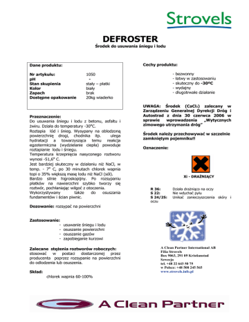 DEFROSTER Środek do usuwania śniegu i lodu Cechy produktu: Dane produktu: Nr artykułu: pH Stan skupienia Kolor Zapach Dostępne opakowanie - 1050 stały – płatki biały brak 20kg wiaderko Przeznaczenie: Do usuwania śniegu i lodu z betonu, asfaltu i żwiru. Działa do temperatury -30°C. Roztapia lód i śnieg. Wysypany na oblodzoną powierzchnię drogi, chodnika itp. ulega hydratacji a towarzysząca temu reakcja egzotermiczna (wydzielanie ciepła) powoduje roztapianie lodu i śniegu. Temperatura krzepnięcia nasyconego roztworu wynosi -51,6° C. Jest bardziej skuteczny w działaniu niż NaCl, w temp. - 7° C, po 30 minutach chlorek wapnia topi o 35% większą masę lodu niż NaCl (sól). Bardzo silnie higroskopijny. Po rozsypaniu płatków na nawierzchni szybko tworzy się roztwór, pochłaniając wilgoć z otoczenia. Wykorzystywany także do osuszania fundamentów i ścian piwnic. bezwonny łatwy w zastosowaniu skuteczny do -30ºC wydajny długotrwałe działanie UWAGA: Środek (CaCl2) zalecany w Zarządzeniu Generalnej Dyrekcji Dróg i Autostrad z dnia 30 czerwca 2006 w sprawie wprowadzenia „Wytycznych zimowego utrzymania dróg” Środek należy przechowywać w szczelnie zamkniętym pojemniku!! Oznaczenie: Xi - DRAŻNIĄCY R 36: S 22: S 24/25: oczu Działa drażniąco na oczy Nie wdychać pyłu Unikać zanieczyszczenia skóry i Dozowanie: rozsypać na powierzchni Zastosowanie: - usuwanie śniegu i lodu osuszanie powierzchni osuszanie gazów zapobieganie kurzowi Zalecane stężenia roztworów roboczych: stosować w postaci dostarczonej przez producenta poprzez rozsypanie na powierzchni do odlodzenia lub osuszenia. Skład: chlorek wapnia 60-100% A Clean Partner International AB Filia Strovels Box 9063, 291 09 Kristianstad Szwecja tel. +48 22 643 50 75 w Polsce: +48 508 245 565 www.strovels.info.pl