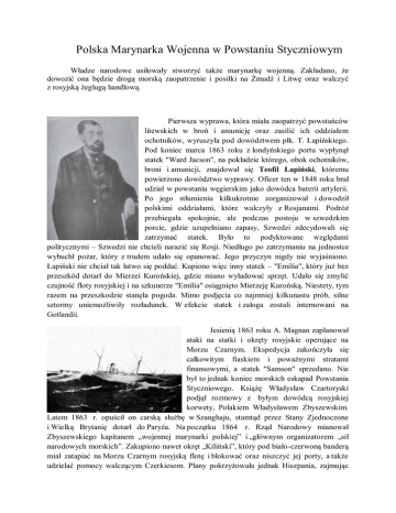 Polska Marynarka Wojenna w Powstaniu Styczniowym Władze narodowe usiłowały stworzyć także marynarkę wojenną. Zakładano, że dowozić ona będzie drogą morską zaopatrzenie i posiłki na Żmudź i Litwę oraz walczyć z rosyjską żeglugą handlową. Pierwsza wyprawa, która miała zaopatrzyć powstańców litewskich w broń i amunicję oraz zasilić ich oddziałem ochotników, wyruszyła pod dowództwem płk. T. Łapińskiego. Pod koniec marca 1863 roku z londyńskiego portu wypłynął statek "Ward Jacson", na pokładzie którego, obok ochotników, broni i amunicji, znajdował się Teofil Łapiński, któremu powierzono dowództwo wyprawy. Oficer ten w 1848 roku brał udział w powstaniu węgierskim jako dowódca baterii artylerii. Po jego stłumieniu kilkukrotnie zorganizował i dowodził polskimi oddziałami, które walczyły z Rosjanami. Podróż przebiegała spokojnie, ale podczas postoju w szwedzkim porcie, gdzie uzupełniano zapasy, Szwedzi zdecydowali się zatrzymać statek. Było to podyktowane względami politycznymi – Szwedzi nie chcieli narazić się Rosji. Niedługo po zatrzymaniu na jednostce wybuchł pożar, który z trudem udało się opanować. Jego przyczyn nigdy nie wyjaśniono. Łapiński nie chciał tak łatwo się poddać. Kupiono więc inny statek – "Emilia", który już bez przeszkód dotarł do Mierzei Kurońskiej, gdzie miano wyładować sprzęt. Udało się zmylić czujność floty rosyjskiej i na szkunerze "Emilia" osiągnięto Mierzeję Kurońską. Niestety, tym razem na przeszkodzie stanęła pogoda. Mimo podjęcia co najmniej kilkunastu prób, silne sztormy uniemożliwiły rozładunek. W efekcie statek i załoga zostali internowani na Gotlandii. Jesienią 1863 roku A. Magnan zaplanował ataki na statki i okręty rosyjskie operujące na Morzu Czarnym. Ekspedycja zakończyła się całkowitym fiaskiem i poważnymi stratami finansowymi, a statek "Samson" sprzedano. Nie był to jednak koniec morskich eskapad Powstania Styczniowego. Książę Władysław Czartoryski podjął rozmowy z byłym dowódcą rosyjskiej korwety, Polakiem Władysławem Zbyszewskim. Latem 1863 r. opuścił on carską służbę w Szanghaju, stamtąd przez Stany Zjednoczone i Wielką Brytanię dotarł do Paryża. Na początku 1864 r. Rząd Narodowy mianował Zbyszewskiego kapitanem „wojennej marynarki polskiej” i „głównym organizatorem „sił narodowych morskich”. Zakupiono nawet okręt „Kiliński”, który pod biało-czerwoną banderą miał zatapiać na Morzu Czarnym rosyjską flotę i blokować oraz niszczyć jej porty, a także udzielać pomocy walczącym Czerkiesom. Plany pokrzyżowała jednak Hiszpania, zajmując „Kilińskiego” po wpłynięciu do portu w Maladze. Zbyszewski snuł jeszcze dalsze plany wojny na morzu, ale wobec upadającego już powstania i braku funduszów były one nierealne. Łukasz Łaganowski Zdjęcia:Teofil Łapiński i "Ward Jacson",
