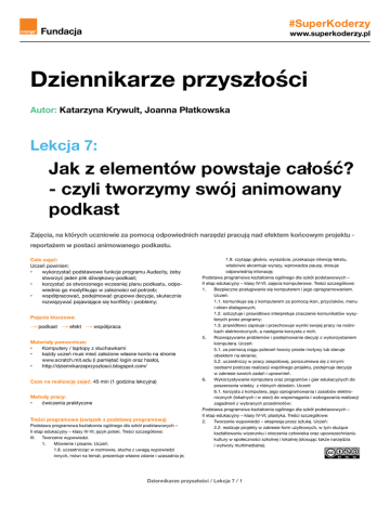 Dziennikarze przyszłości Autor: Katarzyna Krywult, Joanna Płatkowska Lekcja 7: Jak z elementów powstaje całość? - czyli tworzymy swój animowany podkast Zajęcia, na których uczniowie za pomocą odpowiednich narzędzi pracują nad efektem końcowym projektu reportażem w postaci animowanego podkastu. Cele zajęć: Uczeń powinien: • wykorzystać podstawowe funkcje programu Audacity, żeby stworzyć jeden plik dźwiękowy-podkast; • korzystać ze stworzonego wczesniej planu podkastu, odpowiednio go modyfikując w zalezności od potrzeb; • współpracować, podejmować grupowe decyzje, skutecznie rozwiązywać pojawiające się konflikty i problemy; Pojęcia kluczowe: → podkast → efekt → współpraca Materiały pomocnicze: • Komputery / laptopy z słuchawkami • każdy uczeń musi mieć założone własne konto na stronie www.scratch.mit.edu (i pamiętać login oraz hasło), • http://dziennikarzeprzyszlosci.blogspot.com/ Czas na realizację zajęć: 45 min (1 godzina lekcyjna) Metody pracy: • ćwiczenia praktyczne Treści programowe (związek z podstawą programową) Podstawa programowa kształcenia ogólnego dla szkół podstawowych – II etap edukacyjny – klasy IV-VI; język polski. Treści szczegółowe: III. Tworzenie wypowiedzi. 1. Mówienie i pisanie. Uczeń: 1.8. uczestnicząc w rozmowie, słucha z uwagą wypowiedzi innych, mówi na temat; prezentuje własne zdanie i uzasadnia je; 1.9. czytając głośno, wyraziście, przekazuje intencję tekstu, właściwie akcentuje wyrazy, wprowadza pauzę, stosuje odpowiednią intonację; Podstawa programowa kształcenia ogólnego dla szkół podstawowych – II etap edukacyjny – klasy IV-VI; zajęcia komputerowe. Treści szczegółowe: 1. Bezpieczne posługiwanie się komputerem i jego oprogramowaniem. Uczeń: 1.1. komunikuje się z komputerem za pomocą ikon, przycisków, menu i okien dialogowych; 1.2. odczytuje i prawidłowo interpretuje znaczenie komunikatów wysyłanych przez programy; 1.3. prawidłowo zapisuje i przechowuje wyniki swojej pracy na nośnikach elektronicznych, a następnie korzysta z nich. 5. Rozwiązywanie problemów i podejmowanie decyzji z wykorzystaniem komputera. Uczeń: 5.1. za pomocą ciągu poleceń tworzy proste motywy lub steruje obiektem na ekranie; 5.2. uczestniczy w pracy zespołowej, porozumiewa się z innymi osobami podczas realizacji wspólnego projektu, podejmuje decyzje w zakresie swoich zadań i uprawnień. 6. Wykorzystywanie komputera oraz programów i gier edukacyjnych do poszerzania wiedzy z różnych dziedzin. Uczeń: 6.1. korzysta z komputera, jego oprogramowania i zasobów elektronicznych (lokalnych i w sieci) do wspomagania i wzbogacania realizacji zagadnień z wybranych przedmiotów; Podstawa programowa kształcenia ogólnego dla szkół podstawowych – II etap edukacyjny – klasy IV-VI; plastyka. Treści szczegółowe: 2. Tworzenie wypowiedzi – ekspresja przez sztukę. Uczeń: 2.2. realizuje projekty w zakresie form użytkowych, w tym służące kształtowaniu wizerunku i otoczenia człowieka oraz upowszechnianiu kultury w społeczności szkolnej i lokalnej (stosując także narzędzia i wytwory multimedialne). Dziennikarze przyszłości / Lekcja 7 / 1 #SuperKoderzy / Dziennikarze przyszłości / Jak z elementów powstaje całość? (...) Przebieg zajęć: 1. Wprowadzenie w tematykę i integracja grupy Nauczyciel wraz z uczniami przypomina schemat tworzenia animowanego podkastu, zapisując kolejne kroki na tablicy: wstęp (tytuł, autorzy), rozwinięcie (dźwięk i zdjęcia, animacje), zakończenie (zamknięcie skryptów). Pokazuje uczniom jak załadować dźwięk - uczniowie ładują swoje pliki (które zmontowali przed tymi zajęciami) do Scratcha. 2. Część zasadnicza Nauczyciel omawia kryteria sukcesu sformułowane w postaci rubryki (załącznik do scenariusza). Uczniowie pracują w grupach korzystając ze schematu stworzonego wcześniej i planu z poprzednich zajęć. Nauczyciel obserwuje pracę uczniów i udziela im wskazówek. 3. Podsumowanie i ewaluacja: Uczniowie korzystając z rubryki oceniają postęp swoich pracy i ustalają sposób dokończenia animowanego podkastu. Uwagi/alternatywy: Wkrótce, na zajęciach nr 9, uczniowie będą prezentować swoje podkasty na forum klasy i oceniać je zanim zaprezentują je całej szkole czy innej klasie. Warto rozważyć prezentowanie prac dzieci przed dużą publicznością, a także opublikowanie ich na stronie internetowej szkoły. Dziennikarze przyszłości / Lekcja 7 / 2 #SuperKoderzy / Dziennikarze przyszłości / Jak z elementów powstaje całość? (...) Dźwięk Animacje Zdjęcia Spójność i efekt Lekcja nr 7 Kryteria sukcesu W podkaście jest od 3 do 7 animacji. Wszystkie lub wiekszość różni się od siebie. W podcaście jest więcej niż 7 zdjęć. Są dobrej jakości, wszystko wyraźnie widać. W podkaście jest więcej niż 7 animacji. Wszystkie lub wiekszość różni się od siebie. Dźwięk jest niskiej jakości. Dźwięk jest dobrej jakości. Dźwięk jest bardzo Często trudno zrozumieć, Można zrozumieć dobrej jakości. Można co mówią wypowiadające większość wypowiedzi. Nie zrozumieć zrozumieć, się osoby. Jest kilka ma momentów ciszy lub wszystkie wypowiedzi. momentów ciszy lub szumu. Dźwięk jest Nie ma momentów szumu. Czasem dźwięk odpowiedniej głośności. ciszy lub szumu. jest za głośny lub za cichy. Dźwięk jest odpowiedniej głośności. **** Dźwięk jest bardzo niskiej jakości. Trudno zrozumieć, co mówią wypowidające się osoby. Jest dużo momentów ciszy lub szumu. Dźwięk jest za głośny lub za cichy. W podkaście jest jedna lub dwie animacje. Są one takie same. W podcaście jest od 3 do 7 zdjęć. Są dobrej jakości, wszystko wyraźnie widać. *** W podkaście nie ma animacji. W podkaście jest jedno lub dwa zdjęcia. Zdjęcia są średniej jakości, na niektórych niewiele widać. Wypowiedzi, zdjęcia i animacje są dobrze połączone. Animowany p