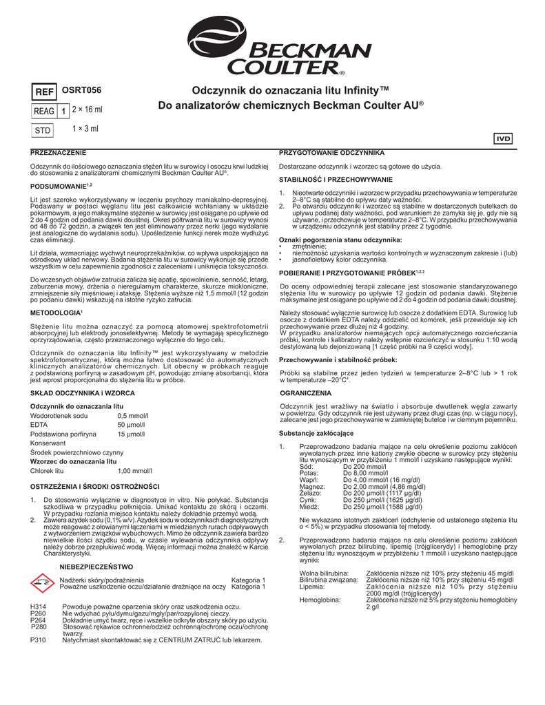 OSRT056 2 × 16 ml Odczynnik do oznaczania litu Infinity™ Do analizatorów chemicznych Beckman Coulter AU® 1 × 3 ml PRZEZNACZENIE PRZYGOTOWANIE ODCZYNNIKA Odczynnik do ilościowego oznaczania stężeń litu w surowicy i osoczu krwi ludzkiej do stosowania z analizatorami chemicznymi Beckman Coulter AU®. Dostarczane odczynnik i wzorzec są gotowe do użycia. PODSUMOWANIE1,2 Lit jest szeroko wykorzystywany w leczeniu psychozy maniakalno-depresyjnej. Podawany w postaci węglanu litu jest całkowicie wchłaniany w układzie pokarmowym, a jego maksymalne stężenie w surowicy jest osiągane po upływie od 2 do 4 godzin od podania dawki doustnej. Okres półtrwania litu w surowicy wynosi od 48 do 72 godzin, a związek ten jest eliminowany przez nerki (jego wydalanie jest analogiczne do wydalania sodu). Upośledzenie funkcji nerek może wydłużyć czas eliminacji. Lit działa, wzmacniając wychwyt neuroprzekaźników, co wpływa uspokajająco na ośrodkowy układ nerwowy. Badania stężenia litu w surowicy wykonuje się przede wszystkim w celu zapewnienia zgodności z zaleceniami i uniknięcia toksyczności. Do wczesnych objawów zatrucia zalicza się apatię, spowolnienie, senność, letarg, zaburzenia mowy, drżenia o nieregularnym charakterze, skurcze miokloniczne, zmniejszenie siły mięśniowej i ataksję. Stężenia wyższe niż 1,5 mmol/l (12 godzin po podaniu dawki) wskazują na istotne ryzyko zatrucia. METODOLOGIA1 Stężenie litu można oznaczyć za pomocą atomowej spektrofotometrii absorpcyjnej lub elektrody jonoselektywnej. Metody te wymagają specyficznego oprzyrządowania, często przeznaczonego wyłącznie do tego celu. Odczynnik do oznaczania litu Infinity™ jest wykorzystywany w metodzie spektrofotometrycznej, którą można łatwo dostosować do automatycznych klinicznych analizatorów chemicznych. Lit obecny w próbkach reaguje z podstawioną porfiryną w zasadowym pH, powodując zmianę absorbancji, która jest wprost proporcjonalna do stężenia litu w próbce. STABILNOŚĆ I PRZECHOWYWANIE 1. Nieotwarte odczynniki i wzorzec w przypadku przechowywania w temperaturze 2–8°C są stabilne do upływu daty ważności. 2. Po otwarciu odczynniki i wzorzec są stabilne w dostarczonych butelkach do upływu podanej daty ważności, pod warunkiem że zamyka się je, gdy nie są używane, i przechowuje w temperaturze 2–8°C. W przypadku przechowywania w urządzeniu odczynnik jest stabilny przez 2 tygodnie. Oznaki pogorszenia stanu odczynnika: • zmętnienie; • niemożność uzyskania wartości kontrolnych w wyznaczonym zakresie i (lub) • jasnofioletowy kolor odczynnika. POBIERANIE I PRZYGOTOWANIE PRÓBEK1,2,3 Do oceny odpowiedniej terapii zalecane jest stosowanie standaryzowanego stężenia litu w surowicy po upływie 12 godzin od podania dawki. Stężenie maksymalne jest osiągane po upływie od 2 do 4 godzin od podania dawki doustnej. Należy stosować wyłącznie surowicę lub osocze z dodatkiem EDTA. Surowicę lub osocze z dodatkiem EDTA należy oddzielić od komórek, jeśli przewiduje się ich przechowywanie przez dłużej niż 4 godziny. W przypadku analizatorów niemających opcji automatycznego rozcieńczania próbki, kontrole i kalibratory należy wstępnie rozcieńczyć w stosunku 1:10 wodą destylowaną lub dejonizowaną [1 część próbki na 9 części wody]. Przechowywanie i stabilność próbek: Próbki są stabilne przez jeden tydzień w temperaturze 2–8°C lub > 1 rok w temperaturze –20°C4. SKŁAD ODCZYNNIKA i WZORCA OGRANICZENIA Odczynnik do oznaczania litu Wodorotlenek sodu 0,5 mmol/l EDTA 50 µmol/l Podstawiona porfiryna 15 µmol/l Konserwant Środek powierzchniowo czynny Wzorzec do oznaczania litu Chlorek litu 1,00 mmol/l Odczynnik jest wrażliwy na światło i absorbuje dwutlenek węgla zawarty w powietrzu. Gdy odczynnik nie jest używany przez długi czas (np. w ciągu nocy), zalecane jest jego przechowywanie w zamkniętej butelce i w ciemnym pojemniku. Substancje zakłócające 1. Przeprowadzono badania mające na celu określenie poziomu zakłóceń wywołanych przez inne kationy zwykle obecne w surowicy przy stężeniu litu wynoszącym w przybliżeniu 1 mmol/l i uzyskano następujące wyniki: Sód: Do 200 mmol/l Potas: Do 8,00 mmol/l Wapń: Do 4,00 mmol/l (16 mg/dl) Magnez: Do 2,00 mmol/l (4,86 mg/dl) Żelazo: Do 200 µmol/l (1117 µg/dl) Cynk: Do 250 µmol/l (1625 µg/dl) Miedź: Do 250 µmol/l (1588 µg/dl) Nie wykazano istotnych zakłóceń (odchylenie od ustalonego stężenia litu o < 5%) w przypadku stosowania tej metody. 2. Przeprowadzono badania mające na celu określenie poziomu zakłóceń wywołanych przez bilirubinę, lipemię (trójglicerydy) i hemoglobinę przy stężeniu litu wynoszącym w przybliżeniu 1 mmol/l i uzyskano następujące wyniki: OSTRZEŻENIA I ŚRODKI OSTROŻNOŚCI 1. Do stosowania wyłącznie w diagnostyce in vitro. Nie połykać. Substancja szkodliwa w przypadku połknięcia. Unikać kontaktu ze skórą i oczami. W przypadku rozlania miejsca kontaktu należy dokładnie przemyć wodą. 2. Zawiera azydek sodu (0,1% w/v). Azydek sodu w odczynnikach diagnostycznych może reagować z ołowianymi łączeniami w miedzianych rurach odpływowych z wytworzeniem związków wybuchowych. Mimo że odczynnik zawiera bardzo niewielkie ilości azydku sodu, w czasie wylewania odczynnika odpływy należy dobrze przepłukiwać wodą. Więcej informacji można znaleźć w Karcie Charakterystyki. NIEBEZPIECZEŃSTWO Nadżerki skóry/podrażnienia Kategoria 1 Poważne uszkodzenie oczu/działanie drażniące na oczy Kategoria 1 H314 P260 P264 P280 P310 Powoduje poważne oparzenia skóry oraz uszkodzenia oczu. Nie wdychać pyłu/dymu/gazu/mgły/par/rozpylonej cieczy. Dokładnie umyć twarz, ręce i wszelkie odkryte obszary skóry po użyciu. Stosować rękawice ochronne/odzież ochronną/ochronę oczu/ochronę twarzy. Natychmiast skontaktować się z CENTRUM ZATRUĆ lub lekarzem. Wolna bilirubina: Zakłócenia niższe niż 10% przy
