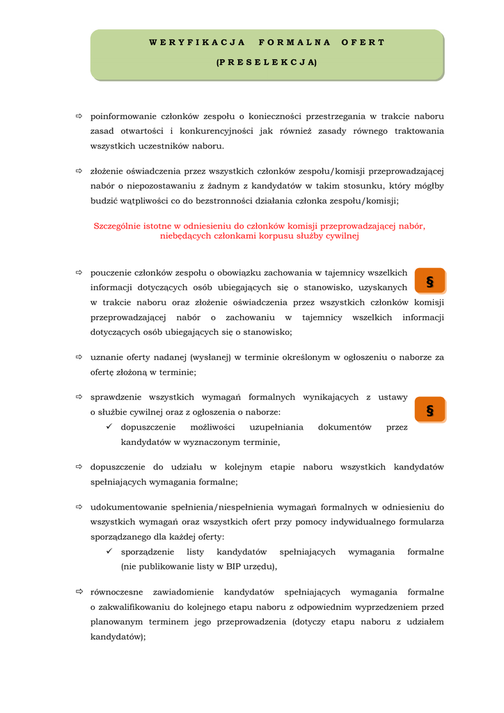 WERYFIKACJA FORMALNA OFERT (P R E S E L E K C J A) poinformowanie członków zespołu o konieczności przestrzegania w trakcie naboru zasad otwartości i konkurencyjności jak również zasady równego traktowania wszystkich uczestników naboru. złożenie oświadczenia przez wszystkich członków zespołu/komisji przeprowadzającej nabór o niepozostawaniu z żadnym z kandydatów w takim stosunku, który mógłby budzić wątpliwości co do bezstronności działania członka zespołu/komisji; Szczególnie istotne w odniesieniu do członków komisji przeprowadzającej nabór, niebędących członkami korpusu służby cywilnej pouczenie członków zespołu o obowiązku zachowania w tajemnicy wszelkich § informacji dotyczących osób ubiegających się o stanowisko, uzyskanych w trakcie naboru oraz złożenie oświadczenia przez wszystkich członków komisji przeprowadzającej nabór o zachowaniu w tajemnicy wszelkich informacji dotyczących osób ubiegających się o stanowisko; uznanie oferty nadanej (wysłanej) w terminie określonym w ogłoszeniu o naborze za ofertę złożoną w terminie; sprawdzenie wszystkich wymagań formalnych wynikających z ustawy § o służbie cywilnej oraz z ogłoszenia o naborze: dopuszczenie możliwości uzupełniania dokumentów przez kandydatów w wyznaczonym terminie, dopuszczenie do udziału w kolejnym etapie naboru wszystkich kandydatów spełniających wymagania formalne; udokumentowanie spełnienia/niespełnienia wymagań formalnych w odniesieniu do wszystkich wymagań oraz wszystkich ofert przy pomocy indywidualnego formularza sporządzanego dla każdej oferty: sporządzenie listy kandydatów spełniających wymagania formalne wymagania formalne (nie publikowanie listy w BIP urzędu), równoczesne zawiadomienie kandydatów spełniających o zakwalifikowaniu do kolejnego etapu naboru z odpowiednim wyprzedzeniem przed planowanym terminem jego przeprowadzenia (dotyczy etapu naboru z udziałem kandydatów); równoczesne zawiadomienie kandydatów niespełniających wymagania formalne o niezakwalifikowaniu do kolejnego etapu naboru.