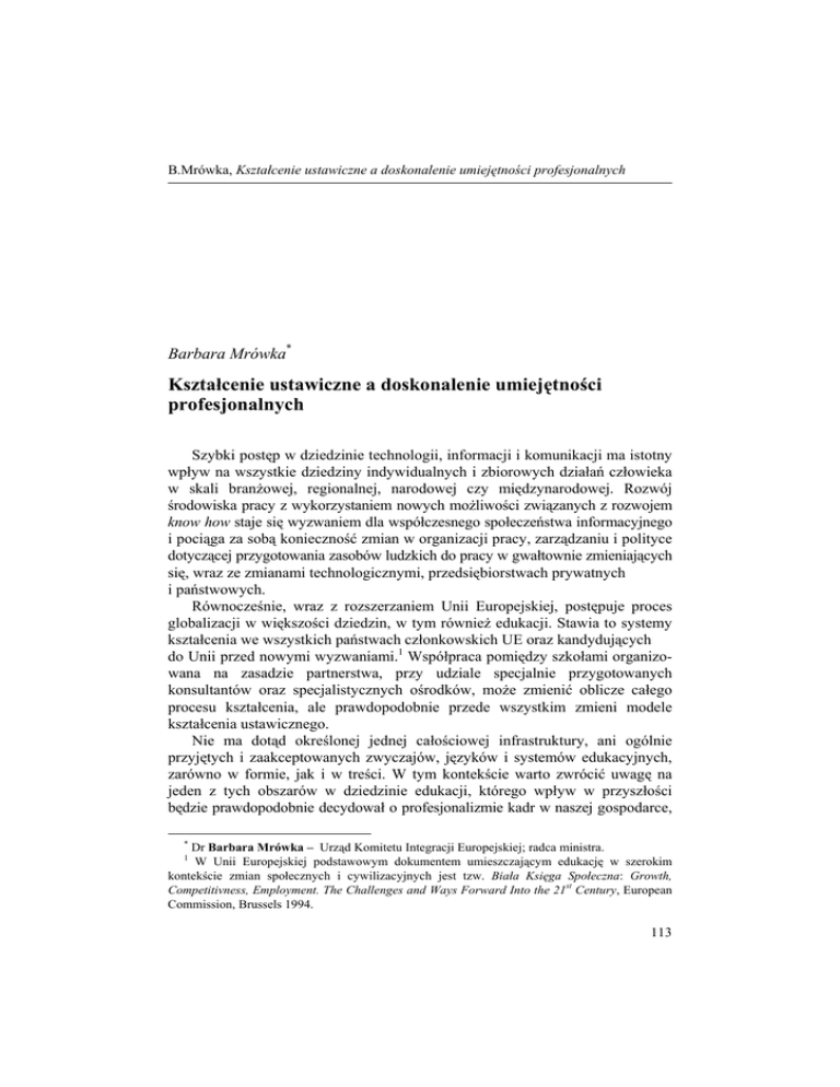 B.Mrówka, Kształcenie ustawiczne a doskonalenie umiejętności profesjonalnych Barbara Mrówka* Kształcenie ustawiczne a doskonalenie umiejętności profesjonalnych Szybki postęp w dziedzinie technologii, informacji i komunikacji ma istotny wpływ na wszystkie dziedziny indywidualnych i zbiorowych działań człowieka w skali branżowej, regionalnej, narodowej czy międzynarodowej. Rozwój środowiska pracy z wykorzystaniem nowych możliwości związanych z rozwojem know how staje się wyzwaniem dla współczesnego społeczeństwa informacyjnego i pociąga za sobą konieczność zmian w organizacji pracy, zarządzaniu i polityce dotyczącej przygotowania zasobów ludzkich do pracy w gwałtownie zmieniających się, wraz ze zmianami technologicznymi, przedsiębiorstwach prywatnych i państwowych. Równocześnie, wraz z rozszerzaniem Unii Europejskiej, postępuje proces globalizacji w większości dziedzin, w tym również edukacji. Stawia to systemy kształcenia we wszystkich państwach członkowskich UE oraz kandydujących do Unii przed nowymi wyzwaniami.1 Współpraca pomiędzy szkołami organizowana na zasadzie partnerstwa, przy udziale specjalnie przygotowanych konsultantów oraz specjalistycznych ośrodków, może zmienić oblicze całego procesu kształcenia, ale prawdopodobnie przede wszystkim zmieni modele kształcenia ustawicznego. Nie ma dotąd określonej jednej całościowej infrastruktury, ani ogólnie przyjętych i zaakceptowanych zwyczajów, języków i systemów edukacyjnych, zarówno w formie, jak i w treści. W tym kontekście warto zwrócić uwagę na jeden z tych obszarów w dziedzinie edukacji, którego wpływ w przyszłości będzie prawdopodobnie decydował o profesjonalizmie kadr w naszej gospodarce, * Dr Barbara Mrówka – Urząd Komitetu Integracji Europejskiej; radca ministra. W Unii Europejskiej podstawowym dokumentem umieszczającym edukację w szerokim kontekście zmian społecznych i cywilizacyjnych jest tzw. Biała Księga Społeczna: Growth, Competitivness, Employment. The Challenges and Ways Forward Into the 21st Century, European Commission, Brussels 1994. 1 113 Studia Europejskie, 3/1999 tj. na kształcenie ustawiczne lub tzw. uczenie się przez całe życie.2 Interesujące może okazać się ustalenie głównych trendów (oraz inspirujących je oddziaływań) w rozwoju kwalifikacji zawodowych oraz w kształceniu ustawicznym realizowanym w ramach studiów technicznych, ze szczególnym uwzględnieniem inżynierów, a także relacji uczelnia – przemysł. 1. Podstawowa edukacja zawodowa Wchodzenie młodych ludzi na rynek pracy w Polsce jest dziś procesem dla nich ryzykownym. Brak rozbudowanej infrastruktury i ograniczone możliwości kształcenia ustawicznego oraz szybkie i intensywne zmiany technologiczne, a także ekonomiczne powodują, że kwalifikacje uczniów kończących obecnie szkoły zawodowe ulegają dewaluacji. Wśród absolwentów i młodych pracowników panuje atmosfera niepewności co do ich przyszłości zawodowej. Uczniowie kończący szkoły zawodowe najczęściej kontynuują naukę w technikach zawodowych dla dorosłych lub kończą edukację na tym etapie. Jednak nawet po skończeniu technikum młodzi ludzie posiadają głównie wiedzę teoretyczną. Rzadko wiedza ta jest poparta umiejętnościami praktycznymi, które potencjalni pracodawcy zazwyczaj preferują. Z kolei zgłaszający się do pracy absolwenci najczęściej sami nie posiadają środków, żeby w siebie dalej inwestować. W efekcie, stają się coraz mniej konkurencyjni na rynku pracy w Polsce, co w perspektywie może oznaczać zajmowanie podrzędnych pozycji również na europejskim rynku pracy. Kolejny problem to długość cyklu kształcenia. Bez upowszechnienia zmian w systemie edukacji powodujących przyśpieszenie procesu edukacji zawodowej nie będzie możliwe profesjonalne przygotowanie polskich przedsiębiorstw i ich kadr do bardziej efektywnej i szybszej integracji gospodarki polskiej z gospodarką europejską. Potrzebne jest wypracowanie metod i sposobów pozwalających w niezbyt odległej przyszłości na dostosowywanie się Polaków do wymogów europejskich pracodawców. Poprawa jakości kształcenia zawodowego powinna następować również na drodze adaptacji treści i metod kształcenia zawodowego do standardów europejskich poprzez określenie wspólnego modelu kształcenia, polepszenie czytelności praktyk zawodowych, legislacji, a w szczególności uporządkowanie spraw związanych z uprawnieniami do wykonywania zawodu w różnych krajach (dotyczy to np. zawodu architekta czy inżyniera) itd. Pozwoli to, z jednej strony, czerpać korzyści z ułatwień mobilności zawodowej w Europie w ramach 2 Sformułowania „kształcenie ustawiczne” i „uczenie się przez całe życie” są tu traktowane zamiennie i odpowiadają angielskim terminom „continuing training” i „lifelong learning”. 114 B.Mrówka, Kształcenie ustawiczne a doskonalenie umiejętności profesjonalnych adaptacji do zmian związanych z ewolucją jednolitego rynku pracy, a z drugiej strony – ułatwi wejście Polaków na europejski rynek pracy. Procesy te zostały zapoczątkowane w latach 90. m.in. poprzez działania podjęte i kontynuowane w ramach programu TEMPUS finansującego np. prace związane z harmonizacją programów dla zawodów medycznych. Zapoczątkowano wprowadzanie zmian w sztywnym systemie studiów, co przygotuje uczelnie polskie, wzorcem krajów Unii, do wzajemnego uznawania dyplomów. Bez wątpienia przyczyni się to do ułatwienia mobilności studentów i zwiększy ich możliwości studiowania w innych krajach europejskich. Trwa już m.in. wprowadzanie systemu punktowego na wielu wydziałach wyższych uczelni i zaawansowane są przygotowania do powszechnego wprowadzenia wzajemnego uznawania okresów studiów oraz transferu punktów zaliczeniowych na podstawie tzw. Systemu Transferu Punktów Zaliczeniowych (European Credit Transfer System). W związku z otwar