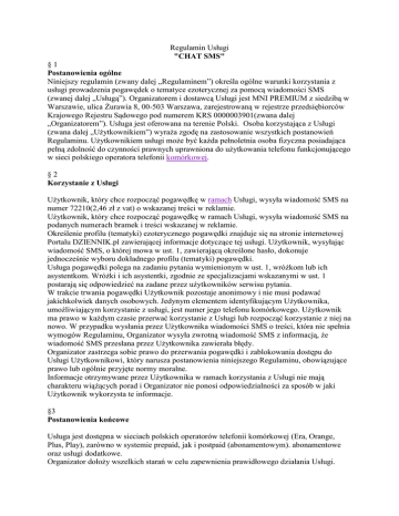 Regulamin Usługi "CHAT SMS" §1 Postanowienia ogólne Niniejszy regulamin (zwany dalej „Regulaminem”) określa ogólne warunki korzystania z usługi prowadzenia pogawędek o tematyce ezoterycznej za pomocą wiadomości SMS (zwanej dalej „Usługą”). Organizatorem i dostawcą Usługi jest MNI PREMIUM z siedzibą w Warszawie, ulica Żurawia 8, 00-503 Warszawa, zarejestrowaną w rejestrze przedsiębiorców Krajowego Rejestru Sądowego pod numerem KRS 0000003901(zwana dalej „Organizatorem”). Usługa jest oferowana na terenie Polski. Osoba korzystająca z Usługi (zwana dalej „Użytkownikiem”) wyraża zgodę na zastosowanie wszystkich postanowień Regulaminu. Użytkownikiem usługi może być każda pełnoletnia osoba fizyczna posiadająca pełną zdolność do czynności prawnych uprawniona do użytkowania telefonu funkcjonującego w sieci polskiego operatora telefonii komórkowej. §2 Korzystanie z Usługi Użytkownik, który chce rozpocząć pogawędkę w ramach Usługi, wysyła wiadomość SMS na numer 72210(2,46 zł z vat) o wskazanej treści w reklamie. Użytkownik, który chce rozpocząć pogawędkę w ramach Usługi, wysyła wiadomość SMS na podanych numerach bramek i treści wskazanej w reklamie. Określenie profilu (tematyki) ezoterycznego pogawędki znajduje się na stronie internetowej Portalu DZIENNIK.pl zawierającej informacje dotyczące tej usługi. Użytkownik, wysyłając wiadomość SMS, o której mowa w ust. 1, zawierającą określone hasło, dokonuje jednocześnie wyboru dokładnego profilu (tematyki) pogawędki. Usługa pogawędki polega na zadaniu pytania wymienionym w ust. 1, wróżkom lub ich asystentkom. Wróżki i ich asystentki, zgodnie ze specjalizacjami wskazanymi w ust. 1 postarają się odpowiedzieć na zadane przez użytkowników serwisu pytania. W trakcie trwania pogawędki Użytkownik pozostaje anonimowy i nie musi podawać jakichkolwiek danych osobowych. Jedynym elementem identyfikującym Użytkownika, umożliwiającym korzystanie z usługi, jest numer jego telefonu komórkowego. Użytkownik ma prawo w każdym czasie przerwać korzystanie z Usługi lub rozpocząć korzystanie z niej na nowo. W przypadku wysłania przez Użytkownika wiadomości SMS o treści, która nie spełnia wymogów Regulaminu, Organizator wysyła zwrotną wiadomość SMS z informacją, że wiadomość SMS przesłana przez Użytkownika zawierała błędy. Organizator zastrzega sobie prawo do przerwania pogawędki i zablokowania dostępu do Usługi Użytkownikowi, który narusza postanowienia niniejszego Regulaminu, obowiązujące prawo lub ogólnie przyjęte normy moralne. Informacje otrzymywane przez Użytkownika w ramach korzystania z Usługi nie mają charakteru wiążących porad i Organizator nie ponosi odpowiedzialności za sposób w jaki Użytkownik wykorzysta te informacje. §3 Postanowienia końcowe Usługa jest dostępna w sieciach polskich operatorów telefonii komórkowej (Era, Orange, Plus, Play), zarówno w systemie prepaid, jak i postpaid (abonamentowym). abonamentowe oraz usługi dodatkowe. Organizator dołoży wszelkich starań w celu zapewnienia prawidłowego działania Usługi. Organizator nie ponosi odpowiedzialności za: treść wiadomości SMS wysyłanych przez Użytkownika w ramach korzystania z Usługi, korzystanie z Usługi przez osoby nieuprawnione do użytkowania telefonu komórkowego, szkody spowodowane nieprawidłowym korzystaniem przez Użytkownika z Usługi, szkody spowodowane wykorzystaniem przez Użytkownika informacji otrzymanych w wyniku korzystania z Usługi, problemy w funkcjonowaniu Usługi, jeżeli nastąpiły one wskutek zdarzeń, których Organizator przy zachowaniu należytej staranności nie był w stanie przewidzieć, lub którym nie mógł zapobiec, w szczególności w przypadku problemów związanych ze zdarzeniami losowymi o charakterze siły wyższej, korzystanie z Usługi przez Użytkowników niezgodnie z postanowieniami niniejszego Regulaminu lub bez zapoznania się z Regulaminem, w tym zwłaszcza wynikające z niewłaściwego zrozumienia przez Użytkownika charakteru Usługi, przerwy w świadczeniu Usługi zaistniałe z przyczyn technicznych (np. konserwacja, przegląd, wymiana sprzętu) lub niezależnych od Organizatora. Regulamin dostępny jest na stronie internetowej www.dziennik.pl.pl oraz w siedzibie Organizatora. Organizator zastrzega sobie prawo zmiany postanowień Regulaminu w razie zmiany przepisów prawnych lub z innej ważnej przyczyny. Zmiany Regulaminu wchodzą w życie z dniem ich publikacji na stronie internetowej www.dziennik.pl.pl. Reklamacje dotyczące Usługi należy przesyłać listownie pod adres MNI PREMIUM., ul. Żurawia 8, 00-503 Warszawa z dopiskiem „Chat Astrologiczny dziennik.pl”. Telefonicznie w godzinach 9-17 pod numerem telefonu (022) 583 37 21. Mailem na adres [email protected] Reklamacje Użytkowników dotyczące Usługi będą załatwiane w ciągu 21dni od daty otrzymania.