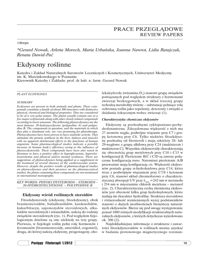 Prace przeglądowe review papers Borgis *Gerard Nowak, Arletta Moroch, Maria Urbańska, Joanna Nawrot, Lidia Ratajczak, Renata Dawid-Pać Ekdysony roślinne Katedra i Zakład Naturalnych Surowców Leczniczych i Kosmetycznych, Uniwersytet Medyczny im. K. Marcinkowskiego w Poznaniu Kierownik Katedry i Zakładu: prof. dr hab. n. farm. Gerard Nowak PLANT ECDYSONES SUMMARY Ecdysones are present in both animals and plants. These compounds constitute a family of about 300 structures with distinctive physical, chemical and biological properties. They are considered to be of a very polar nature. The plants usually contain one or a few major ecdysteroids along with other closely related compounds occurring in lower amounts. The following phytoecdysones are the most famous: 20-hydroxyecdysone (polypodine A) and polypodine B. The compounds in question, and the materials in which they play a dominant role, are very promising for phytotherapy. Phytoecdysones have been proven to have anabolic activity. They stimulate the protein synthesis in the liver, kidneys and muscles with no apparent detrimental effects to the functions of human organism. Some pharmacological studies indicate a possible increase in human body’s efficiency owing to the influence of phytoecdysteroids. These compounds have been also noted in literature to have a positive effect in hyperglycaemia, hypercholesterolemia and physical and/or mental weakness. There are suggestions of phytoecdysones being applied as a supplement in the treatment of several diseases of the cardiovascular system. However, despite the positive results of pharmacological studies on phytoecdysones and their presence on the pharmaceutical market, the plants containing these compounds are not mentioned in international monographs. KEY WORDS: PHYOECDYSTEROIDS – STEROIDS – 20-HYDROXYECDYSONE – POLYPODINE B Ekdysony wśród roślinnych steroidów Fitoekdysteroidy (ekdysony, fitoekdysony), obok brasinosteroidów, bufadienolidów, kardenolidów, kukurbitacyn, saponozydów steroidowych, alkaloidów steroidowych i witanolidów, należą do rodziny związków steroidowych (ryc. 1). Pod względem fizjologicznym dzielone są one niekiedy na trzy grupy. Pierwsza, w fizjologii roślin pełni rolę hormonów i feromonów (brassinosteroidy, anteridiol, oogoniol), druga, do której należą ekdysony, progestageny, cho- Postępy Fitoterapii 1/2012 lekalcyferole (witamina D3) stanowi grupę związków powiązanych pod względem struktury z hormonami zwierząt bezkręgowych, a w skład trzeciej grupy wchodzą metabolity wtórne – substancje pełniące rolę ochronną roślin jako repelenty, deterenty i związki o działaniu toksycznym wobec zwierząt (1). Charakterystyka chemiczna ekdysonów Ekdysony są pochodnymi cyklopentano-perhydrofenantrenu. Zdecydowana większość z nich ma 27 atomów węgla, podwójne wiązanie przy C7 i grupę ketonową przy C6. Tylko niektóre fitoekdysony pochodzą od fitosteroli i mają szkielety 28- lub 29-węglowe z grupą alkilową przy C24 (makisteron i makisteron C). Wszystkie ekdysteroidy charakteryzują się obecnością grup metylowych przy C10 i C13 w konfiguracji β. Pierścienie B/C i C/D są zawsze połączone konfiguracją trans. Natomiast pierścienie A/B przeważnie mają konfigurację cis. Większość ekdysonów posiada grupę α-hydroksylową przy C14, która wraz z podwójnym wiązaniem przy C7/8 i ketonem przy C6, stanowi układ chromoforowy o charakterystycznej absorpcji UV przy λmax =242 nm w metanolu i 254 nm w mieszaninie chlorek metylenu – metanol (ryc. 2). Charakterystyczną cechą chemiczną ekdysonów jest obecność kilku grup hydroksylowych, które nadają im charakter hydrofilny. Struktura steroidowa i różnorodność wymienionych wyżej podstawników stanowi o dużych możliwościach biosyntezy naturalnych ekdysonów. Bierze się pod uwagę występowanie ponad 1000 różnych modyfikacji strukturalnych naturalnych ekdysonów, z których dotychczas wyizolowano ok. 300 (2). Najdokładniejsze informacje o strukturze i zawartości fitoekdysteroidów w roślinach można uzyskać w badaniu protonowego magnetycznego rezonan15 Gerard Nowak i wsp. Ryc. 1. Struktury niektórych naturalnych związków steroidowych. 16 Postępy Fitoterapii 1/2012 Ekdysony roślinne Ryc. 2. Struktury niektórych fitoekdysonów. su jądrowego (1H NMR). Wspomniane wcześniej sprzężenie wiązań 7-en-6-on rozpoznawalne jest w zakresie przesunięcia chemicznego δ 5,75-6,0 ppm (diagnostyczny proton w pozycji H-7). Natomiast grupy metylowe, przy atomach węgla C-21, C-26, C-27 są wyraźne przy sygnałach w zakresie 0,6-1,5 ppm. Występowanie ekdysonów w roślinach Fitoekdysteroidy są szeroko rozpowszechnione w świecie roślinnym, występują zarówno u okrytonasiennych, jak i nagonasiennych. Ekdysteroidowo-podobne substancje znaleziono również w brunatnych algach morskich z gatunku Laurencia pinnata Yamada, w grzybach i bezkręgowcach. Jednak tylko ok. 2% roślin na świecie zostało przebadanych pod kątem obecności tych związków. Przyjmuje się, że w 5-6% badanych na obecność ekdysonów roślin, uzyskano efekt pozytywny (1). Zawartość tych związków zmienia się wraz z cyklem wegetacyjnym rośliny. Stwierdzono na przykład, że maksymalne stężenie 20-hydroksyekdysonu w gatunkach Serratula występuje w dwóch okresach, na przełomie kwietnia i maja oraz w sierpniu (w czasie kwitnienia). Ekdysony kumulują się w tkankach, które są najważniejsze dla przeżycia rośliny, w większych ilościach występują w liściach i kwiatach, natomiast w mniejszych – w łodygach, korzeniach i nasionach (1, 2). Występowanie fitoekdysteroidów potwierdzone jest w ok. 120 rodzinach (tab. 1), jednak tylko gatunki na- Postępy Fitoterapii 1/2012 leżące do pięciu z nich charakteryzują się wysoką zawartością tych związków, która wynosi ok. 1%. Jedną z tych rodzin jest Asteraceae. W niektórych gatunkach Serratula 20-hydroksyek