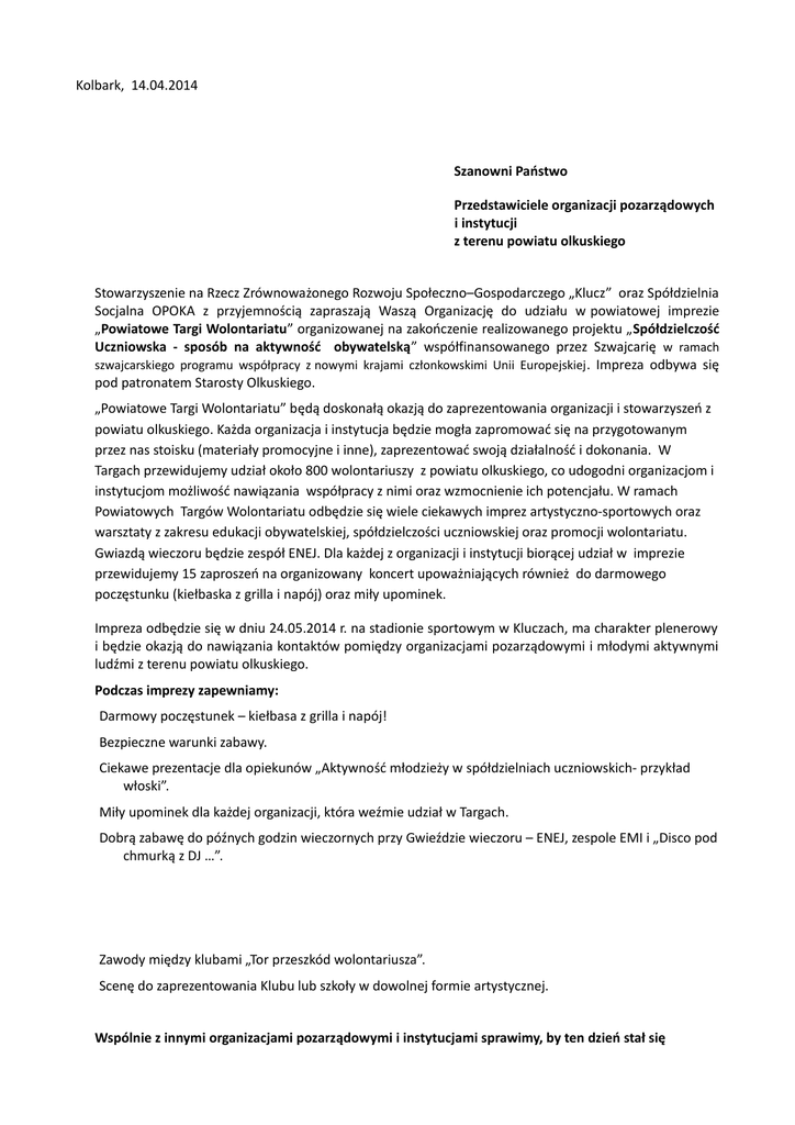 Kolbark, 14.04.2014 Szanowni Państwo Przedstawiciele organizacji pozarządowych i instytucji z terenu powiatu olkuskiego Stowarzyszenie na Rzecz Zrównoważonego Rozwoju Społeczno–Gospodarczego „Klucz” oraz Spółdzielnia Socjalna OPOKA z przyjemnością zapraszają Waszą Organizację do udziału w powiatowej imprezie „Powiatowe Targi Wolontariatu” organizowanej na zakończenie realizowanego projektu „Spółdzielczość Uczniowska - sposób na aktywność obywatelską” współfinansowanego przez Szwajcarię w ramach szwajcarskiego programu współpracy z nowymi krajami członkowskimi Unii Europejskiej . Impreza odbywa się pod patronatem Starosty Olkuskiego. „Powiatowe Targi Wolontariatu” będą doskonałą okazją do zaprezentowania organizacji i stowarzyszeń z powiatu olkuskiego. Każda organizacja i instytucja będzie mogła zapromować się na przygotowanym przez nas stoisku (materiały promocyjne i inne), zaprezentować swoją działalność i dokonania. W Targach przewidujemy udział około 800 wolontariuszy z powiatu olkuskiego, co udogodni organizacjom i instytucjom możliwość nawiązania współpracy z nimi oraz wzmocnienie ich potencjału. W ramach Powiatowych Targów Wolontariatu odbędzie się wiele ciekawych imprez artystyczno-sportowych oraz warsztaty z zakresu edukacji obywatelskiej, spółdzielczości uczniowskiej oraz promocji wolontariatu. Gwiazdą wieczoru będzie zespół ENEJ. Dla każdej z organizacji i instytucji biorącej udział w imprezie przewidujemy 15 zaproszeń na organizowany koncert upoważniających również do darmowego poczęstunku (kiełbaska z grilla i napój) oraz miły upominek. Impreza odbędzie się w dniu 24.05.2014 r. na stadionie sportowym w Kluczach, ma charakter plenerowy i będzie okazją do nawiązania kontaktów pomiędzy organizacjami pozarządowymi i młodymi aktywnymi ludźmi z terenu powiatu olkuskiego. Podczas imprezy zapewniamy: Darmowy poczęstunek – kiełbasa z grilla i napój! Bezpieczne warunki zabawy. Ciekawe prezentacje dla opiekunów „Aktywność młodzieży w spółdzielniach uczniowskich- przykład włoski”. Miły upominek dla każdej organizacji, która weźmie udział w Targach. Dobrą zabawę do późnych godzin wieczornych przy Gwieździe wieczoru – ENEJ, zespole EMI i „Disco pod chmurką z DJ …”. Zawody między klubami „Tor przeszkód wolontariusza”. Scenę do zaprezentowania Klubu lub szkoły w dowolnej formie artystycznej. Wspólnie z innymi organizacjami pozarządowymi i instytucjami sprawimy, by ten dzień stał się Wielkim Świętem poświęconym aktywności młodzieży. Zachęcamy serdecznie do udziału w imprezie i zaprezentowania swojej organizacji lub instytucji – prosimy przesłać zgłoszenie udziału wraz z potwierdzeniem liczby uczestników pod adresem emailowym lub telefonicznym do dnia 12 maja 2014 r. Ramowy program imprezy 13.00 - rejestracja 14.00 - oficjalne rozpoczęcie imprezy 14.30 - 16.00 - „Tor przeszkód wolontariusza”- konkurencje i zabawy sportowe 14.30 -16.00 - Warsztat dla opiekunów Klubu wolontariusza i nauczycieli „Aktywność młodzieży w spółdzielniach uczniowskich- przykład włoski”- Domek Sportowca 16.00 - 17.45 prezentacja form artystycznych na scenie i na stoiskach 17.45 - występ chóru „Ziemia Kluczewska” 18.00 - występ zespołu EMI 20.00 - występ zespołu ENEJ 21.30 - 24.00 – Disco pod Chmurką z DJ Impreza jest organizowana pod patronatem Starosty Powiatowego W Olkuszu oraz przy współpracy ze Stowarzyszeniem Res Sacra Mizer z Olkusza i Gminą Klucze. Patronat medialny: Gazeta Krakowska Szczegółowych informacji udziela Patrycja Warwas tel. 32 647 21 52; e-mail: [email protected]