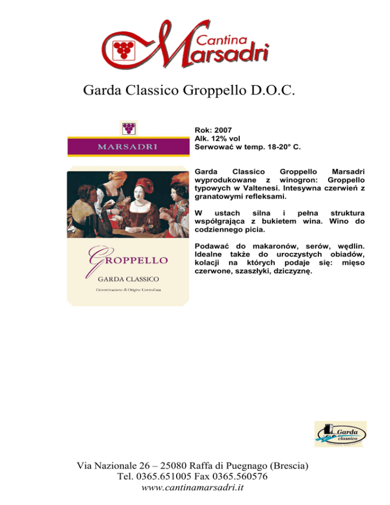 Garda Classico Groppello D.O.C. Rok: 2007 Alk. 12% vol Serwować w temp. 18-20° C. Garda Classico Groppello Marsadri wyprodukowane z winogron: Groppello typowych w Valtenesi. Intesywna czerwień z granatowymi refleksami. W ustach silna i pełna struktura współgrająca z bukietem wina. Wino do codziennego picia. Podawać do makaronów, serów, wędlin. Idealne także do uroczystych obiadów, kolacji na których podaje się: mięso czerwone, szaszłyki, dziczyznę. Via Nazionale 26 – 25080 Raffa di Puegnago (Brescia) Tel. 0365.651005 Fax 0365.560576 www.cantinamarsadri.it Garda Classico Chiaretto D.O.C. Rok: 2008 Alk. 12% vol Serwować w temp. 12° C Garda Classico Chiaretto Marsadri wyprodokowane z kilku rodzaji winogron: Groppello, Marzemino, Barbera, Sangiovese. Podczas produkcji, krótki kontakt skórki moszczowej w fermentacji pozwoli na otrzymanie koloru różanego z odcieniem rubinu. Charakterystyczny przyjemny, świeży smak owoców leśnych. Proponowane do ryb, ślimaków, białego mięsa, serów. Idealne jako aperitif oraz do przystawek. Via Nazionale 26 – 25080 Raffa di Puegnago (Brescia) Tel. 0365.651005 Fax 0365.560576 www.cantinamarsadri.it Garda Classico Rosso D.O.C. Rok: 2007 Alk. 12% vol Serwować w temp. 18-20° C. Garda Classico Rosso Marsadri wyprodukowane z kilku rodzaji winogron: Groppello, Marzemino, Barbera, Sangiovese. Wino rześkie o kolorze lśniącego rubinu. Długi wytrawny finisz o guście migdałów. Proponowane do potraw duszonych, z czerwonego mięsa, pieczeni. Via Nazionale 26 – 25080 Raffa di Puegnago (Brescia) Tel. 0365.651005 Fax 0365.560576 www.cantinamarsadri.it Lugana D.O.C. Rok: 2007 Alk. 12,5% vol Serwować w temp. 8° C. Lugana DOC Marsadri produkowane z winogrn szczepu Trebbiano, pochodzącego z winnic Lugana. Wino o lekkim słomkowym kolorze, przetykanym zielonymi refleksami. Delikatne, wytrawne, aromatyczne, świeże. Doskonałe z lekkimi przystawkami, pierwszymi daniami złóżonymi głównie z makaronów. Dobre w połączeniu z rybami i skorupiakami. Via Nazionale 26 – 25080 Raffa di Puegnago (Brescia) Tel. 0365.651005 Fax 0365.560576 www.cantinamarsadri.it Bianco di Custoza D.O.C. Rok: 2007 Alk. 12% vol Serwować w temp. 10-12° C. Bianco di Custoza Marsadri wyprodukowane z kilku rodzaji winogron: Trebbiano, Garganega, Tocai, Cortese. Piekny kolor słomkowy, aromatyczne, miękkie, orzeźwiające o przyjemnym zakończeniu. Doskonałe do pierwszych dań, ryb, grila, białego mięsa. Via Nazionale 26 – 25080 Raffa di Puegnago (Brescia) Tel. 0365.651005 Fax 0365.560576 www.cantinamarsadri.it Vino da Tavola Grappolo Via Nazionale 26 – 25080 Raffa di Puegnago (Brescia) Tel. 0365.651005 Fax 0365.560576 www.cantinamarsadri.it Garda Classico Groppello Brolo D.O.C. Rok: 2007 Alk. 12,5% vol Serwować w temp. 18-20° C. Garda Classico Groppello Brolo wino wyprodukowane ze szczepu Groppello pochodzącego znad Jeziorą Garda. Intensywna czerwień z granatowymi refleksami. W ustach welwetowe, świeże, aromatyczne, długa intensywna końcówka. Wspaniałe jako wino codzienne, ale z powodzeniem może być bohaterem uroczystej kolacji. Idealne do makaronów, wędlin, seró, dziczyzny, czerwonego mięsa. Via Nazionale 26 – 25080 Raffa di Puegnago (Brescia) Tel. 0365.651005 Fax 0365.560576 www.cantinamarsadri.it Garda Classico Chiaretto Brolo D.O.C. Rok: 2008 Alk. 12% vol Serwować w temp. 12° C. Garda Classico Chiaretto Brolo wyprodukowane z kilku rodzaji winogron: Groppello, Marzemino, Barbera, Sangiovese. Podczas produkcji, krótki kontakt skórki moszczowej w fermentacji pozwoli na otrzymanie koloru różanego z odcieniem rubinu. Charakterystyczny przyjemny, świeży smak owoców leśnych. Proponowane do ryb, ślimaków, białego mięsa, słodkich serów. Schłodzone idealne jako aperitif oraz do przystawek. Via Nazionale 26 – 25080 Raffa di Puegnago (Brescia) Tel. 0365.651005 Fax 0365.560576 www.cantinamarsadri.it Garda Classico Rosso Brolo D.O.C. Rok: 2007 Alk. 12% vol Serwować w temp. 18-20° C. Garda Classico Rosso Brolo wyprodukowane z kilku rodzaji winogron: Groppello, Marzemino, Barbera, Sangiovese z regionu Valtenesi. Kolor lśniącego rubinu. Wino o mocnym guście, pozostawiącym długą końcówkę wypełnioną aromatem migdału. Tworzy idealne połączenie z czerwonym mięsem, pieczenią, serami pleśniowymi, mięsem duszonym. Via Nazionale 26 – 25080 Raffa di Puegnago (Brescia) Tel. 0365.651005 Fax 0365.560576 www.cantinamarsadri.it Lugana Brolo D.O.C. Rok: 2007 Alk. 12,5% vol Serwować w temp. 8° C. Wino Lugana Brolo DOC Marsadri wyprodukowane z winogron szczepu Trebbiano pochodzącego z winnic Lugana. Barwa słomkowa z zielonymi refleksami. Wino wytrawne, na podniebieniu świeże, delikatne aromatyczne. Doskonałe do potraw na bazie ryb, białego mięsa. Via Nazionale 26 – 25080 Raffa di Puegnago (Brescia) Tel. 0365.651005 Fax 0365.560576 www.cantinamarsadri.it Garda Classico Rosso Superiore Brolo D.O.C. Rok: 2005 Alk. 13,5% vol Serwować w temp. 18-20° C. Garda Classico Rosso Superiore Marsadri wyprodukowane z kilku rodzaji winogron typowych z regionu Valtenesi: Groppello, Marzemino, Barbera, Sangiovese. Piękny głęboki rubinowy kolor z odcieniami brązu. W ustach welwetowe. Aromatyczne wino z delikatnymi dębowymi taninami. Doskonały dodatek do tradycyjnych potraw z regionu Bresci (Jezioro Garda). Swietnie komponuje się z mięsem czerwonym, duszonym, dziczyzną oraz z serami dojrzałymi jak i pleśniowymi. Otworzyć pół godziny przed degustacją. Via Nazionale 26 – 25080 Raffa di Puegnago (Brescia) Tel. 0365.651005 Fax 0365.560576 www.cantinamarsadri.it Garda Marzemino Brolo D.O.C. Rok: 2007 Alk. 12% vol Serwować w temp. 16° C. Garda Marzemino Brolo Marsadri wyprodukowane z kilku rodzaji winogron typowych z regionu Valtenesi: Marzemino. Via Nazionale 26 – 25080 Raffa di Puegnago (Brescia) Tel. 0365.651005 Fax 0365.560576 www.cantinamarsadri.it Garda Pinot Grigio Brolo D.O.C. Rok: 2007 Alk. 12% vol Serw