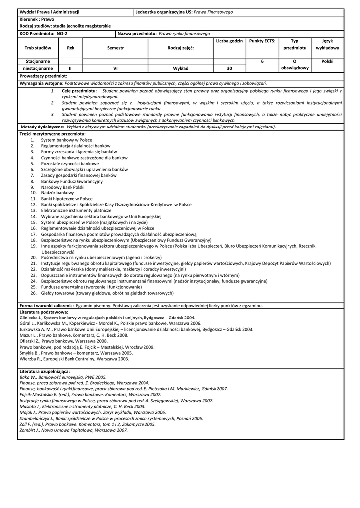 Wydział Prawa i Administracji Jednostka organizacyjna US: Prawa Finansowego Kierunek : Prawo Rodzaj studiów: studia jednolite magisterskie KOD Przedmiotu: NO-2 Nazwa przedmiotu: Prawo rynku finansowego Liczba godzin Tryb studiów Rok Semestr Stacjonarne niestacjonarne III VI Punkty ECTS: Typ przedmiotu Język wykładowy 6 O obowiązkowy Polski Rodzaj zajęć: Wykład 30 Prowadzący przedmiot: Wymagania wstępne: Podstawowe wiadomości z zakresu finansów publicznych, części ogólnej prawa cywilnego i zobowiązań. 1. Cele przedmiotu: Student powinien poznać obowiązujący stan prawny oraz organizacyjny polskiego rynku finansowego i jego związki z rynkami międzynarodowymi. 2. Student powinien zapoznać się z instytucjami finansowymi, w wąskim i szerokim ujęciu, a także rozwiązaniami instytucjonalnymi gwarantującymi bezpieczne funkcjonowanie runku 3. Student powinien poznać podstawowe standardy prawne funkcjonowania instytucji finansowych, a także nabyć praktyczne umiejętności rozwiązywania konkretnych kazusów związanych z dokonywaniem czynności bankowych. Metody dydaktyczne: Wykład z aktywnym udziałem studentów (przekazywanie zagadnień do dyskusji przed kolejnymi zajęciami). Treści merytoryczne przedmiotu: 1. System bankowy w Polsce 2. Reglamentacja działalności banków 3. Formy zrzeszania i łączenia się banków 4. Czynności bankowe zastrzeżone dla banków 5. Pozostałe czynności bankowe 6. Szczególne obowiązki i uprawnienia banków 7. Zasady gospodarki finansowej banków 8. Bankowy Fundusz Gwarancyjny 9. Narodowy Bank Polski 10. Nadzór bankowy 11. Banki hipoteczne w Polsce 12. Banki spółdzielcze i Spółdzielcze Kasy Oszczędnościowo-Kredytowe w Polsce 13. Elektroniczne instrumenty płatnicze 14. Wybrane zagadnienia sektora bankowego w Unii Europejskiej 15. System ubezpieczeń w Polsce (majątkowych i na życie) 16. Reglamentowanie działalności ubezpieczeniowej w Polsce 17. Gospodarka finansowa podmiotów prowadzących działalność ubezpieczeniową 18. Bezpieczeństwo na rynku ubezpieczeniowym (Ubezpieczeniowy Fundusz Gwarancyjny) 19. Inne aspekty funkcjonowania sektora ubezpieczeniowego w Polsce (Polska Izba Ubezpieczeń, Biuro Ubezpieczeń Komunikacyjnych, Rzecznik Ubezpieczonych) 20. Pośrednictwo na rynku ubezpieczeniowym (agenci i brokerzy) 21. Instytucje regulowanego obrotu kapitałowego (fundusze inwestycyjne, giełdy papierów wartościowych, Krajowy Depozyt Papierów Wartościowych) 22. Działalność maklerska (domy maklerskie, maklerzy i doradcy inwestycyjni) 23. Dopuszczanie instrumentów finansowych do obrotu regulowanego (na rynku pierwotnym i wtórnym) 24. Bezpieczeństwo obrotu regulowanego instrumentami finansowymi (nadzór instytucjonalny, fundusze gwarancyjne) 25. Fundusze emerytalne (tworzenie i funkcjonowanie) 26. Giełdy towarowe (towary giełdowe, obrót na giełdach towarowych) Forma i warunki zaliczenia: Egzamin pisemny. Podstawą zaliczenia jest uzyskanie odpowiedniej liczby punktów z egzaminu. Literatura podstawowa: Gliniecka J., System bankowy w regulacjach polskich i unijnych, Bydgoszcz – Gdańsk 2004. Góral L., Karlikowska M., Koperkiewicz - Mordel K., Polskie prawo bankowe, Warszawa 2006. Jurkowska A. M., Prawo bankowe Unii Europejskiej – licencjonowanie działalności bankowej, Bydgoszcz – Gdańsk 2003. Mazur L., Prawo bankowe. Komentarz, C. H. Beck 2008. Ofiarski Z., Prawo bankowe, Warszawa 2008. Prawo bankowe, pod redakcją E. Fojcik – Mastalskiej, Wrocław 2009. Smykla B., Prawo bankowe – komentarz, Warszawa 2005. Wierzba R., Europejski Bank Centralny, Warszawa 2003. Literatura uzupełniająca: Baka W., Bankowość europejska, PWE 2005. Finanse, praca zbiorowa pod red. Z. Brodeckiego, Warszawa 2004. Finanse, bankowość i rynki finansowe, praca zbiorowa pod red. E. Pietrzaka i M. Markiewicz, Gdańsk 2007. Fojcik-Mastalska E. (red.), Prawo bankowe. Komentarz, Warszawa 2007. Instytucje rynku finansowego w Polsce, praca zbiorowa pod red. A. Szelągowskiej, Warszawa 2007. Masiota J., Elektroniczne instrumenty płatnicze, C. H. Beck 2003. Mojak J., Prawo papierów wartościowych. Zarys wykładu, Warszawa 2006. Szambelańczyk J., Banki spółdzielcze w Polsce w procesach zmian systemowych, Poznań 2006. Zoll F. (red.), Prawo bankowe. Komentarz, tom 1 i 2, Zakamycze 2005. Zombirt J., Nowa Umowa Kapitałowa, Warszawa 2007.