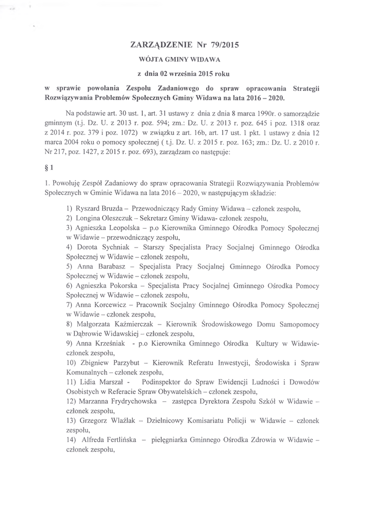 ZARZĄDZENIE Nr 79/2015 WÓJTA GMINY WIDAWA z dnia 02 września 2015 roku w sprawie powołania Zespołu Zadaniowego do spraw opracowania Rozwiązywania Problemów Społecznych Gminy Widawa na lata 2016 - 2020. Strategii Na podstawie art. 30 ust. 1, art. 31 ustawy z dnia z dnia 8 marca 1990r. o samorządzie gminnym (t.j. Dz. U. z 2013 r. poz. 594; zm.: Dz. U. z 2013 r. poz. 645 i poz. 1318 oraz z 2014 r. poz. 379 i poz. 1072) w związku z art. 16b, art. 17 ust. 1 pkt. 1 ustawy z dnia 12 marca 2004 roku o pomocy społecznej ( t.j. Dz. U. z 2015 r. poz. 163; zm.: Dz. U. z 2010 r. Nr 217, poz. 1427, z 2015 r. poz. 693), zarządzam co następuje: §1 1. Powołuję Zespół Zadaniowy do spraw opracowania Strategii Rozwiązywania Problemów Społecznych w Gminie Widawa na lata 2016 - 2020, w następującym składzie: 1) Ryszard Bruzda - Przewodniczący Rady Gminy Widawa - członek zespołu, 2) Longina Oleszczuk - Sekretarz Gminy Widawa- członek zespołu, 3) Agnieszka Leopolska - p.o Kierownika Gminnego Ośrodka Pomocy Społecznej w Widawie - przewodniczący zespołu, 4) Dorota Sychniak - Starszy Specjalista Pracy Socjalnej Gminnego Ośrodka Społecznej w Widawie - członek zespołu, 5) Anna Barabasz - Specjalista Pracy Socjalnej Gminnego Ośrodka Pomocy Społecznej w Widawie - członek zespołu, 6) Agnieszka Pokorska - Specjalista Pracy Socjalnej Gminnego Ośrodka Pomocy Społecznej w Widawie - członek zespołu, 7) Anna Korcewicz - Pracownik Socjalny Gminnego Ośrodka Pomocy Społecznej w Widawie - członek zespołu, 8) Małgorzata Kaźmierczak - Kierownik Środowiskowego Domu Samopomocy w Dąbrowie Widawskiej - członek zespołu, 9) Anna Krześniak - p.o Kierownika Gminnego Ośrodka Kultury w Widawieczłonek zespołu, 10) Zbigniew Parzybut - Kierownik Referatu Inwestycji, Środowiska i Spraw Komunalnych - członek zespołu, 11) Lidia Marszał Podinspektor do Spraw Ewidencji Ludności i Dowodów Osobistych w Referacie Spraw Obywatelskich - członek zespołu, 12) Marzanna Frydrychowska - zastępca Dyrektora Zespołu Szkół w Widawie członek zespołu, 13) Grzegorz Wlaźlak - Dzielnicowy Komisariatu Policji w Widawie - członek zespołu, 14) Alfreda Fertlińska - pielęgniarka Gminnego Ośrodka Zdrowia w Widawie członek zespołu, 15) Urszula Olejniczak - Prezes Stowarzyszenia Społeczno - Kulturalnego Sołtysów Gminy Widawa - członek zespołu, 16) Małgorzata Frąckiewicz - Członek Stowarzyszenia Inicjatywa Kulturalno Artystyczna Regionu „ IKAR” - członek zespołu, 17) Grzegorz Namirowski - Przewodniczący Gminnej Komisji Rozwiązywania Problemów Alkoholowych w Widawie - członek zespołu. §2 1. Cele i zadania zespołu zadaniowego do spraw opracowania Gminnej Strategii Rozwiązywania Problemów Społecznych Gminy Widawa na lata 2016 - 2020 obejmują w szczególności: 1) przygotowanie założeń koncepcyjnych i metodologicznych do opracowania projektu Gminnej Strategii Rozwiązywania Problemów Społecznych Gminy Widawa na lata 2016 - 2020 (zwanej dalej w skrócie strategią), 2) opracowywanie diagnozy problemów społecznych w gminie, 3) sformułowanie misji, celów strategicznych i operacyjnych strategii, 4) sformułowanie zadań priorytetowych, 5) określenie celów strategicznych projektowanych zmian, kierunków niezbędnych działań, sposobu realizacji strategii oraz jej ram finansowych, wskaźników realizacji działań, 6) opracowanie projektu strategii, 7) przedłożenie projektu strategii Wójtowi Gminy Widawa, 8) wdrażanie strategii, 2 . Prace zespołu koordynuje przewodniczący zespołu, do którego obowiązków należy w szczególności: 1) powołanie sekretarza i nadzór nad jego pracą 2) zwoływanie i organizacja posiedzeń zespołu, 3) przewodniczenie posiedzeniom zespołu, 4) prace zespołu będą przebiegać w ramach posiedzeń, które będą się odbywać w siedzibie Urzędu Gminy Widawa (sala konferencyjna pok. Nr 8). 5) zespół zakończy pracę z chwilą przyjęcia przez Radę Gminy Widawa w drodze uchwały Strategii Rozwiązywania Problemów Społecznych Gminy Widawa na lata 2016 - 2020. §3 Wykonanie Zarządzenia powierzam p.o Kierownika Gminnego Ośrodka Pomocy Społecznej w Widawie - Agnieszce Leopolskiej. §4 Zarządzenie wchodzi z dniem podjęcia.