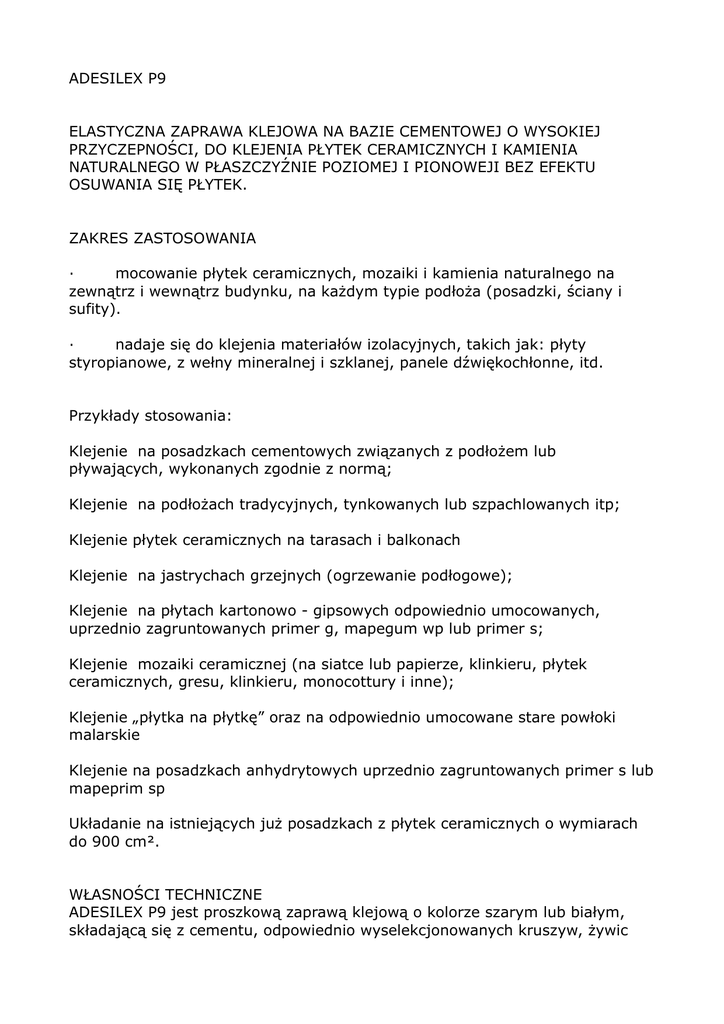 ADESILEX P9 ELASTYCZNA ZAPRAWA KLEJOWA NA BAZIE CEMENTOWEJ O WYSOKIEJ PRZYCZEPNOŚCI, DO KLEJENIA PŁYTEK CERAMICZNYCH I KAMIENIA NATURALNEGO W PŁASZCZYŹNIE POZIOMEJ I PIONOWEJI BEZ EFEKTU OSUWANIA SIĘ PŁYTEK. ZAKRES ZASTOSOWANIA · mocowanie płytek ceramicznych, mozaiki i kamienia naturalnego na zewnątrz i wewnątrz budynku, na każdym typie podłoża (posadzki, ściany i sufity). · nadaje się do klejenia materiałów izolacyjnych, takich jak: płyty styropianowe, z wełny mineralnej i szklanej, panele dźwiękochłonne, itd. Przykłady stosowania: Klejenie na posadzkach cementowych związanych z podłożem lub pływających, wykonanych zgodnie z normą; Klejenie na podłożach tradycyjnych, tynkowanych lub szpachlowanych itp; Klejenie płytek ceramicznych na tarasach i balkonach Klejenie na jastrychach grzejnych (ogrzewanie podłogowe); Klejenie na płytach kartonowo - gipsowych odpowiednio umocowanych, uprzednio zagruntowanych primer g, mapegum wp lub primer s; Klejenie mozaiki ceramicznej (na siatce lub papierze, klinkieru, płytek ceramicznych, gresu, klinkieru, monocottury i inne); Klejenie „płytka na płytkę” oraz na odpowiednio umocowane stare powłoki malarskie Klejenie na posadzkach anhydrytowych uprzednio zagruntowanych primer s lub mapeprim sp Układanie na istniejących już posadzkach z płytek ceramicznych o wymiarach do 900 cm². WŁASNOŚCI TECHNICZNE ADESILEX P9 jest proszkową zaprawą klejową o kolorze szarym lub białym, składającą się z cementu, odpowiednio wyselekcjonowanych kruszyw, żywic syntetycznych i specjalnych dodatków wg receptur opracowanych w laboratoriach badawczych MAPEI. ADESILEX P9 wymieszany z wodą przekształca się w zaprawę klejową o następujących cechach: · wysoka przyczepność; · łatwość nanoszenia i przerabiania; · wysoka tiksotropia: skutecznie przylega do płytek ceramicznych i ścian, uniemożliwiając osuwanie się płytek (nawet o dużej wadze) w dół; · zaprawa wysycha bezskurczowo a po wyschnięciu osiąga wysokie parametry techniczne; · jest mrozo i wodoodporna; · wysycha bez opadania warstwy klejącej i można go stosować do wszystkich materiałów używanych w budownictwie; · posiada przedłużony czas schnięcia otwartego; ZALECENIA: · na płyty betonowe prefabrykowane lub konstrukcje żelbetonowe (prefabrykacja tunelowa) - stosować ADESILEX P22 lub KERABOND + ISOLASTIC); · na ściany lub posadzki o bardzo dużej elastyczności i wysokiej nasiąkliwości, wykonane z drewna, sklejek, płyt wiórowych stosować KERALASTIC; · do klejenia płytek o dużych formatach 40x40, 60x60 stosować KERABOND + ISOLASTIC lub ADESILEX P4; · przy klejeniu płytek nienasiąkliwych na nienasiąkliwe podłoża stosować KERAQUICK, GRANIRAPID, KERAFLEX; · na podłożach metalowych stosować KERALASTIC; · przy montażu płytek ceramicznych, gdzie warstwa kleju przekracza 5 mm stosować KERAFLOOR lub GRANIRAPID; SPOSÓB UŻYCIA Przygotowanie podłoża Na wszystkich podłożach (ścianach i posadzkach) wykonanych zgodnie ze sztuką budowlaną można położyć płytki na kleju ADESILEX P9, jeżeli podłoże jest mocne, suche, nie tłuste itp. Posadzki i tynki nie mogą znajdować się w silnych ruchach poprzecznych i nie mogą być poddawane wibracjom. Świeże podłoża powinny być odpowiednio wysezonowane (tzn. powinny schnąć przez przynajmniej 8 dni na każdy 1 cm grubości warstwy tynku lub posadzki) chyba, że są wykonywane przy użyciu specjalnych, szybkowiążących spoiw MAPEI: MAPECEM lub TOPCEM. Powierzcnie narażone na silne działanie promieni słonecznych (np. w okresie letnim) należy zwilżyć wodą. Podłoża wykonane z gipsu (tynki gipsowe, ściany z paneli gipsowych i płyt kartonowo-gipsowych) muszą być całkowicie wyschnięte, wystarczająco mocne i oczyszczone z kurzu. Należy przemalować je emulsją gruntującą PRIMER G. W miejscach, w których występuje duża wilgoć (np. kabiny natryskowe) należy zastosować MAPEGUM WP w celu zaizolowania podłoża. Przy posadzkach samopoziomujących na bazie anhydrytowej w pomieszczeniach o dużym zawilgoceniu zastosować MAPEGUM WP, PRIMER S lub MAPEPRIM SP. Przygotowanie zaprawy Wymieszać Adesilex P9 z czystą wodą aż do momentu otrzymania jednolitej masy bez grudek; po upływie około 5 minut , wymieszać ponownie. Proporcje jakie należy dobrać to 30-32 części wody na 100 części wagi ADESILEX P9, jest to równoważne 7,5 -8 litrom wody na 25 kg (1 worek) ADESILEX P9. Czas przerobienia otrzymanej zaprawy wynosi ok. 8 godzin. Nanoszenie zaprawy ADESILEX P9 nanosi się na podłoże za pomocą szpachli zębatej. Dobór szpachli zależy od przeznaczenia wykonanej posadzki lub ściany. Adesilex P9 rozprowadza się na podłożu przy użyciu szpachli zębatej. Należy wybrać taką szpachlę aby pozwoliła ona na zwilżenie odwrotnej strony płytek w co najmniej 65-70% dla ścian lub lekkiego ruchu wewnątrz budynku i 100% dla dużego ruchu na zewnątrz budynków. Przy małym obciążeniu wskazana jest aby strona wewnętrzna płytki była pokryta w 65-70% powierzchni. Przy dużym obciążeniu, płytkach mocowanych na zewnętrznych lub płytkach o dużym formacie należy pokryć 100% powierzchni wewnętrznej płytek. W celu ustalenia 100% wewnętrznego pokrycia płytki należy przykleić płytkę na próbę, a następnie oderwać ją obserwując stopień pokrycia i ustalając potrzebną grubość warstwy klejowej. Przy wykonywaniu płytek i posadzek na zewnątrz lub wykonywaniu basenów i płytek o dużym obciążeniu np. ruch kołowy , ADESILEX P9 należy nakładać na podłoże, jak również na wewnętrzną stronę płytki, metoda tzw. podwójnego smarowania. Aby uzyskać dobrą przyczepność należy najpierw rozprowadzić cienką warstwę ADESILEX P9 na podłożu używając gładkiej strony szpachli i zaraz potem nanieść odpowiednią grubość ADESILEX P9 używając do tego szpachli o odpowiednim uzębieniu, odpowiednio do typu i wymia
