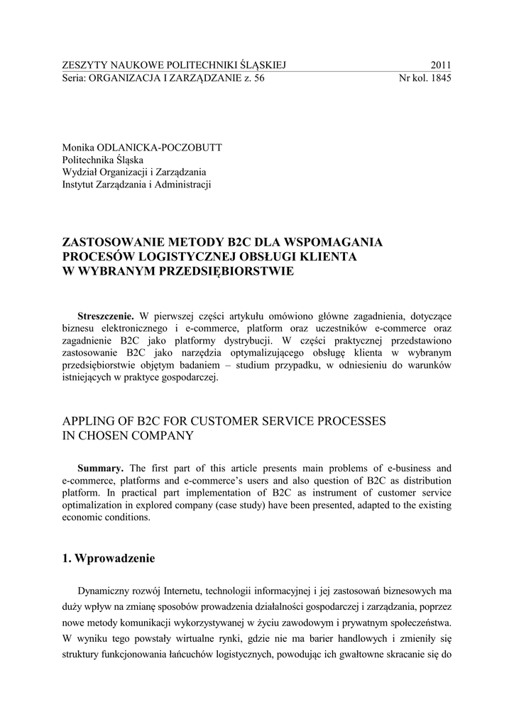 ZESZYTY NAUKOWE POLITECHNIKI ŚLĄSKIEJ Seria: ORGANIZACJA I ZARZĄDZANIE z. 56 2011 Nr kol. 1845 Monika ODLANICKA-POCZOBUTT Politechnika Śląska Wydział Organizacji i Zarządzania Instytut Zarządzania i Administracji ZASTOSOWANIE METODY B2C DLA WSPOMAGANIA PROCESÓW LOGISTYCZNEJ OBSŁUGI KLIENTA W WYBRANYM PRZEDSIĘBIORSTWIE Streszczenie. W pierwszej części artykułu omówiono główne zagadnienia, dotyczące biznesu elektronicznego i e-commerce, platform oraz uczestników e-commerce oraz zagadnienie B2C jako platformy dystrybucji. W części praktycznej przedstawiono zastosowanie B2C jako narzędzia optymalizującego obsługę klienta w wybranym przedsiębiorstwie objętym badaniem – studium przypadku, w odniesieniu do warunków istniejących w praktyce gospodarczej. APPLING OF B2C FOR CUSTOMER SERVICE PROCESSES IN CHOSEN COMPANY Summary. The first part of this article presents main problems of e-business and e-commerce, platforms and e-commerce’s users and also question of B2C as distribution platform. In practical part implementation of B2C as instrument of customer service optimalization in explored company (case study) have been presented, adapted to the existing economic conditions. 1. Wprowadzenie Dynamiczny rozwój Internetu, technologii informacyjnej i jej zastosowań biznesowych ma duży wpływ na zmianę sposobów prowadzenia działalności gospodarczej i zarządzania, poprzez nowe metody komunikacji wykorzystywanej w życiu zawodowym i prywatnym społeczeństwa. W wyniku tego powstały wirtualne rynki, gdzie nie ma barier handlowych i zmieniły się struktury funkcjonowania łańcuchów logistycznych, powodując ich gwałtowne skracanie się do 196 M. Odlanicka-Poczobutt dwóch ogniw: producenta i konsumenta, których wzajemne kontakty są prowadzone za pomocą rozwiązań informatycznych. Te zmiany spowodowały powstanie elektronicznego biznesu, określanego skrótem e-biznes. Przez pojęcie e-biznesu rozumie się prowadzenie i kreowanie działalności na podstawie możliwości, jakich dostarczają technologie internetowe.1 2. Handel elektroniczny i biznes elektroniczny E-commerce oznacza handel elektroniczny, czyli działalność, która polega na tym, że dostawca prezentuje i ewentualnie sprzedaje swoje produkty lub usługi za pośrednictwem elektronicznych mediów. Obejmuje on cztery główne procesy biznesowe: promocję i marketing, zamówienia, płatności, dostawy – oczywiście tylko w przypadku produktów cyfrowych – produkty materialne muszą być dostarczane w tradycyjny sposób.2 Według towaru i usług handel elektroniczny można podzielić na: Pośredni handel elektroniczny – dotyczy elektronicznego zmawiania towarów materialnych, które są następnie dostarczane tradycyjnymi kanałami dystrybucji. Przykładem takiego handlu mogą być instytucje publiczne (poczta), usługi wysyłkowe (kurierzy), własna sieć dystrybucji firmy. Bezpośredni handel elektroniczny – odnosi się do zamawiania niematerialnych towarów lub usług, wykorzystując sieć Internetową, gdzie płatność i doręczenie odbywa się także drogą elektroniczną. Przykładem jest software usługi informatyczne.3 W. Chmielarz dodatkowo uzupełnia podział handlu elektronicznego o następujące kryteria: Według sposobu pozyskiwania zysku: pozyskanie zysku poprzez tworzenie elektronicznego rynku. Przykładem może być dostawca usług internetowych, całkowicie wirtualne banki lub sklepy, narzędzia rynku elektronicznego wspomagają tylko proces tworzenia zysku firmy np. poszukiwanie kontaktu w Internecie, kontakt ze współpracownikami. 1 Kiełtyka L.: Multimedia w zarządzaniu. Wydział Zarządzania Politechniki Częstochowskiej, Częstochowa 2002, s. 188. 2 Pawełoszek-Korek I.: Handel elektroniczny i biznes elektroniczny, [www.paweloszek.republika.pl/ecommerce. html], 15-03-2007; Kiełtyka L.: Multimedia w zarządzaniu. Wydział Zarządzania Politechniki Częstochowskiej, Częstochowa 2002, s. 127. 3 Kiełtyka L.: Multimedia w zarządzaniu. Op. cit., s. 115. Zastosowanie metody B2C dla wspomagania procesów… 197 Według sposobu wykorzystania sieci: Tradycyjny handel elektroniczny – sieć teletransmisyjna służy tylko do przesyłania danych pomiędzy elementami rynku i w dominującej ilości oparty jest na sieciach komercyjnych. Internetowy handel elektroniczny, gdzie sieć teletransmisyjna stanowi jednocześnie medium przesyłania danych, jak i globalny rynek.4 A. Bartels pokazuje różnice, jakie występują pomiędzy e-commerce a e-biznesem. E-commerce odnosi się do procesów zewnętrznych, związanych z kontaktem przedsiębiorstwa z klientami, dostawcami, zewnętrznymi partnerami. Są to procesy, takie jak: sprzedaż, marketing, przyjmowanie zamówień, dostawy, obsługa klienta, zakupy surowców do produkcji, zaopatrzenie biura.5 Natomiast pojęcie e-biznesu zawiera w sobie e-commerce, ale oprócz tego również obejmuje wewnętrzne procesy, takie jak: produkcja, zarządzanie zapasami, rozwój produktu, zarządzanie ryzykiem, finanse, zarządzanie wiedzą, zarządzanie zasobami ludzkimi. K. Rutkowski przedstawia wzajemną relację pomiędzy e-commerce i e-biznes, którą obrazuje rysunek 1. 4 Chmielarz W.: Handel elektroniczny, [www2.wz.uw.edu.pl/ksiz/download/wch/Handel%20elektroniczny.pdf], 15-03-2007. 5 Bartels A.: The Difference Between E-Business and e-Commerce. “Computer World”, no. 41, 2000. 198 M. Odlanicka-Poczobutt E-commerce marketing sprzedaż zakupy produktów i usług przez Internet lub inną sieć informacyjną E-Business Poprawa wyników biznesu poprzez: Wdrożenie nowych technologii w łańcuchu wartości, w celu osiągnięcia pełnej mierzalności Połączenie łańcuchów wartości pomiędzy i w poprzek różnych rodzajów działalności oraz pomiędzy biznesem i konsumentami W celu: Poprawy serwisu/redukcja kosztów Otwarcia nowych kanałów i w ten sposób doprowadzenie do przekształcenia konkurencyjności rynku. Rys. 1. Relacje pomię