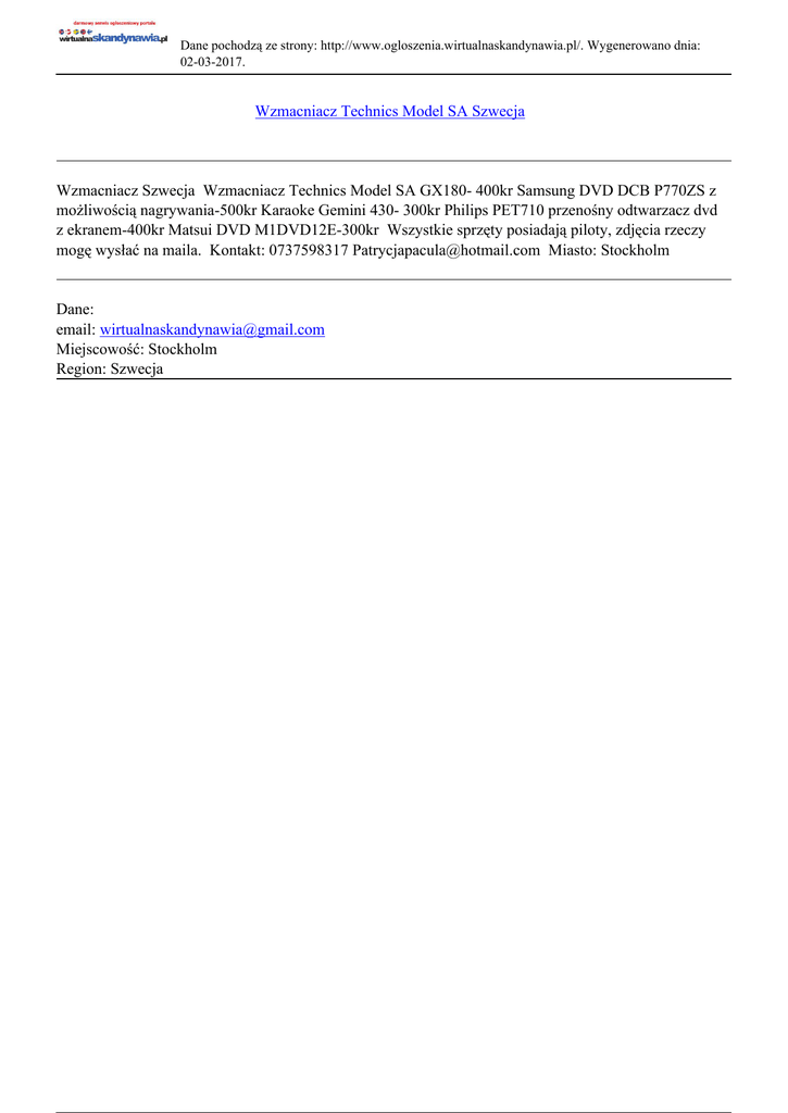 Dane pochodzą ze strony: http://www.ogloszenia.wirtualnaskandynawia.pl/. Wygenerowano dnia: 02-03-2017. Wzmacniacz Technics Model SA Szwecja Wzmacniacz Szwecja Wzmacniacz Technics Model SA GX180- 400kr Samsung DVD DCB P770ZS z możliwością nagrywania-500kr Karaoke Gemini 430- 300kr Philips PET710 przenośny odtwarzacz dvd z ekranem-400kr Matsui DVD M1DVD12E-300kr Wszystkie sprzęty posiadają piloty, zdjęcia rzeczy mogę wysłać na maila. Kontakt: 0737598317 [email protected] Miasto: Stockholm Dane: email: [email protected] Miejscowość: Stockholm Region: Szwecja